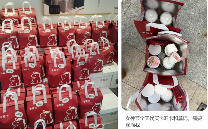 卡旺卡代购有两种形式:预约点单和直接拿现货。2月28日,一名广德卡旺卡黄牛在自己的社交媒体上发布了3月1日的卡旺卡预订贴,只有简单的一句话,“正月排队两三个小时,可以提前联系我哈”。这条帖子下面有167条评论,询问ta如何预订。而从2月开始,ta几乎每个周末都会提前备好大批卡旺卡现货,再发帖询问是否有人需要。这意味着,黄牛们对卡旺卡的市场需求和夸张的排队时长有着相当大胆的预期,几乎不用担心提前买来的奶茶“脱不了手”——“只要队够长,总有人需要黄牛。”