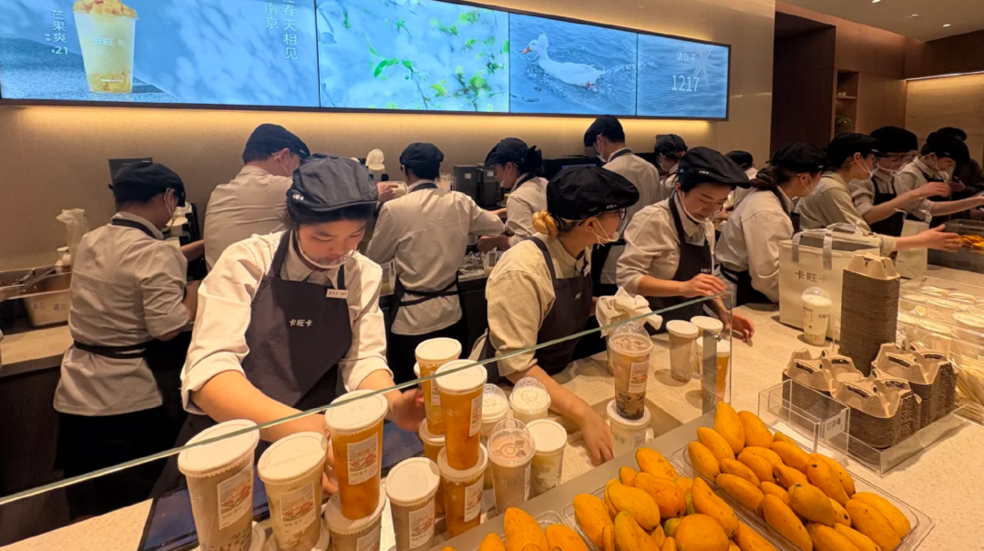 在卡旺卡的门店里,制作奶茶的阵仗大到堪比小型的食品工厂流水线:有的门店里甚至会出现20名店员同时挤在工作台后制作奶茶的场面,每个人都看起来忙碌异常,“现实版胡闹厨房”。