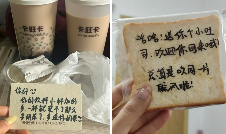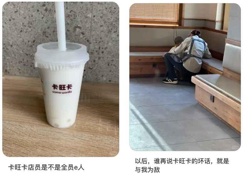 在卡旺卡买奶茶仿佛一场爱的教育,店员对每个进店者报以无微不至的关切。孕妇去卡旺卡,店员会提醒“奶茶有咖啡因,孕妇不能喝”。带小孩去买奶茶,店员不仅会帮你照看孩子,还会送给小朋友一根棒棒糖。有人在卡旺卡柜台前等奶茶时咳嗽了一下,店员顺手又送了她一杯雪梨水,说因为听到她咳嗽了。