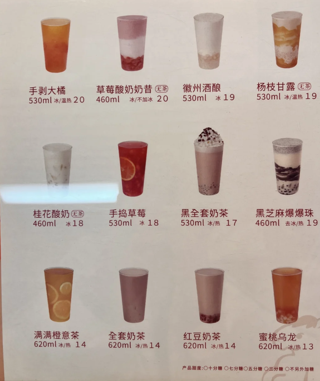 而在卡旺卡,除了一杯以安徽当地的酒酿为卖点的徽州酒酿奶茶,大多数产品都很难说有什么惊世骇俗的“创新”。卡旺卡菜单上销量靠前的招牌产品包括“草莓酸奶奶昔”、“手剥大橘”、“杨枝甘露”,以及半杯小料堆砌起的“黑全套奶茶”。你可以在任何连锁奶茶品牌的常驻菜单里找到类似用料的产品。酒酿奶茶在武汉茶饮品牌“爷爷不泡茶”里相当常见,后者的酒酿产品线还比卡旺卡更丰富。茉莉奶白、阿嬷手作也都推出过类似的酒酿产品。
