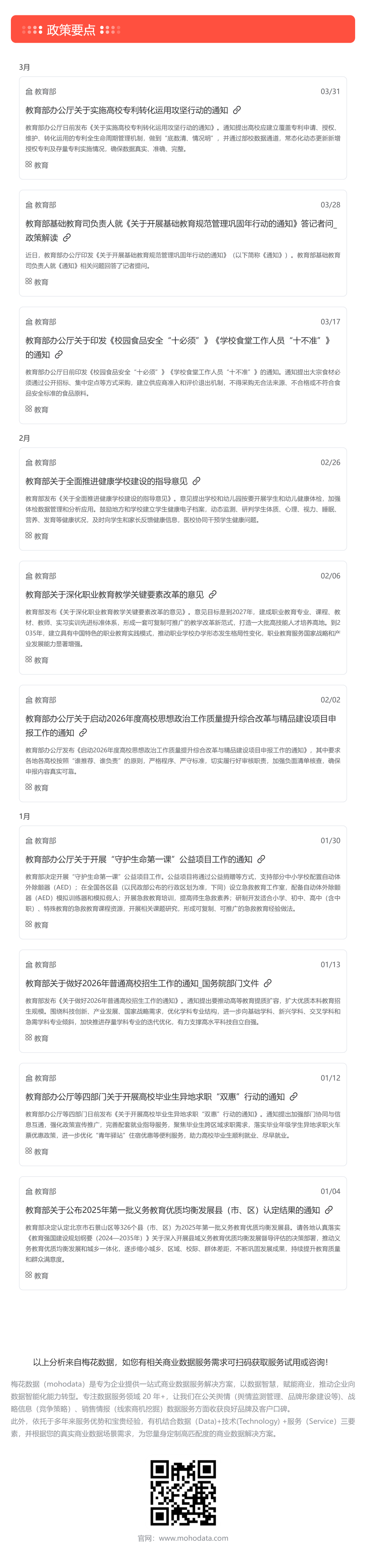 根据梅花数据舆情监测要政盘点统计,2026年一季度共收录重要教育相关政策信息共计56条,其中涉及校园安全、职业教育、高校招生、公益项目等多个热点,建议重点关注《关于全面推进健康学校建设的指导意见》、《关于开展基础教育规范管理巩固年行动的通知》等政策。