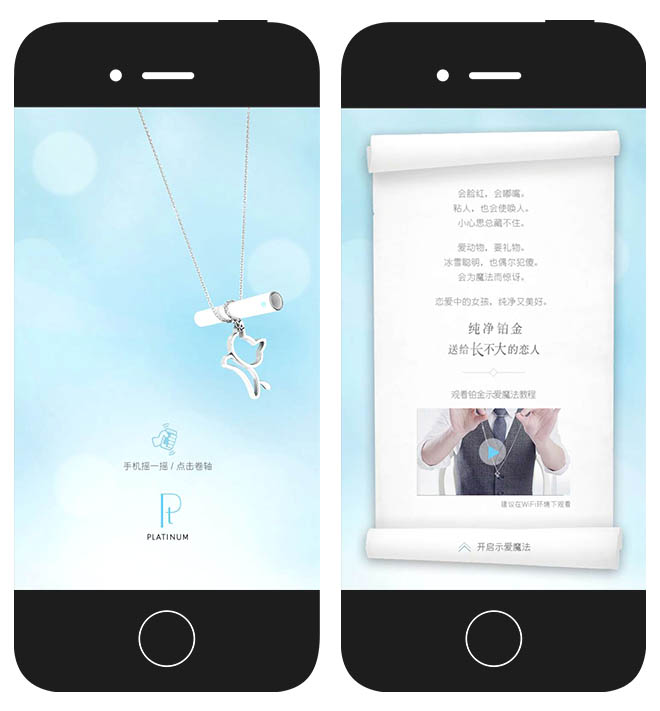 情侣间充满乐趣的小游戏,蓄谋已久的小小把戏,指尖滑落的铂金项链。 满怀爱意的魔术永远充满惊喜,因为我愿意在你面前永远做一个长不大的恋人。 通过3D技术,露出产品,并通过摇动/点击的方式与消费者互动,通过良好的体验让消费者开启这一次的真爱之旅。