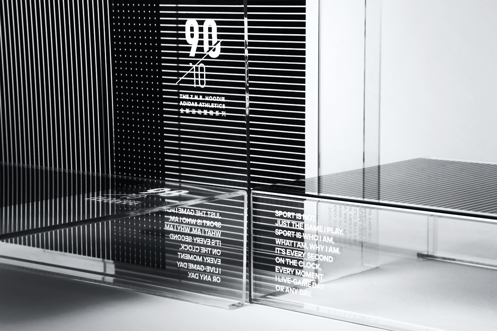 此番我们为Z.N.E. 90/10带来了运动员箴言限量版专属套装。 90/10的概念突出运动员的心理状态,我们希望这次作品不仅仅局限满足平面与结构的设计,更是与受众产生互动的动态装置。 将hidden track与内心箴言理念植入包装中,最终决定以莫尔条纹来完成这一设计。