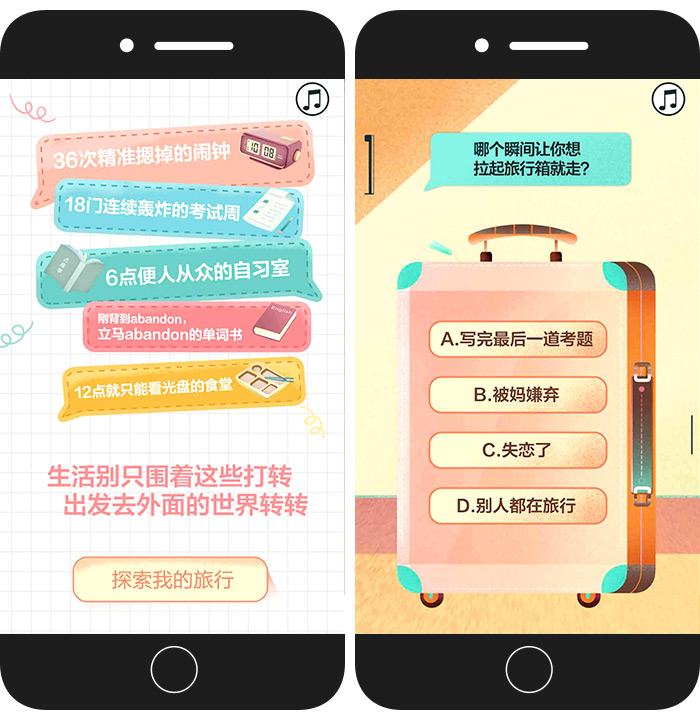 INFINI映纷创意为爱彼迎夏日校园福利活动打造《测出你意想不到的旅行》H5,让用户跟爱彼迎一起进行一次“云旅行”,并生成独一无二的旅行手账,展现“千万种玩心,都能在爱彼迎完美落地”的活动主旨。在画面上,H5采用了一镜到底的形式,让用户在做测试题时感觉就像在云体验一场说走就走的旅行;与用户的生活、旅行习惯息息相关,又带一点无厘头的趣味问题与选项设置,也是让用户“别跑”的一把有力钩子。