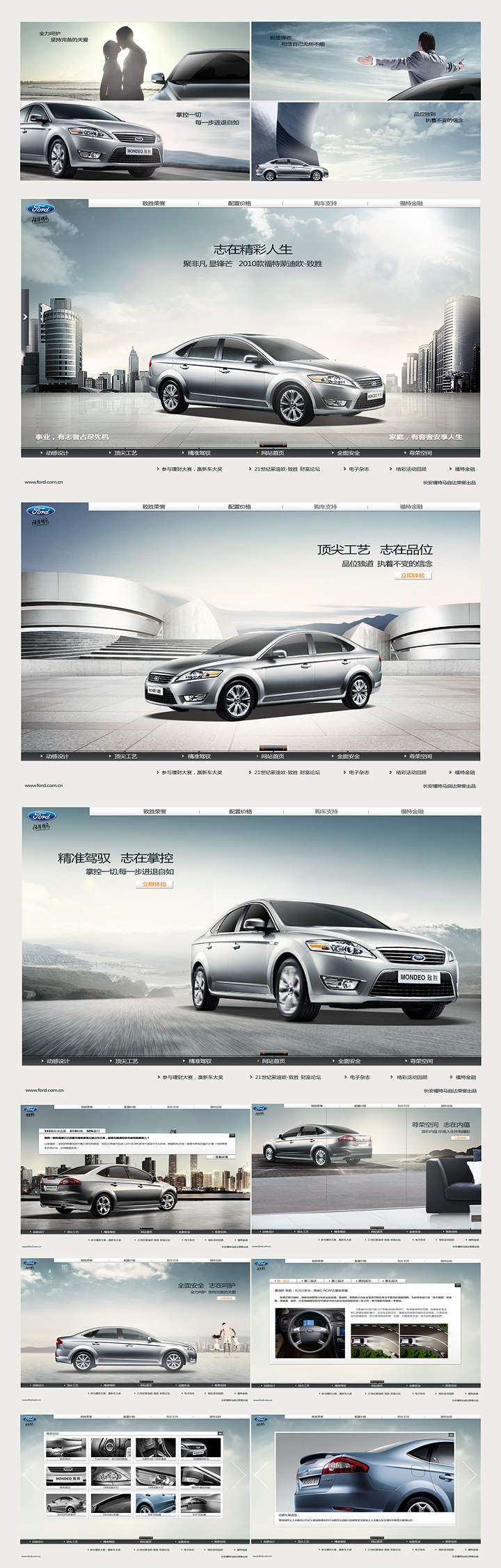 Mondeo-致胜 2010改款, 在产品的品牌宣传上, 无论是平面网站, 客户越来越关注消费者内心层面的需求: 生活里到处都充满妥协, 家庭和事业总会产生冲突, 而绝不妥协, 让成功人士全面掌控生活中的方方面面。 用简单的画面和文案, 从精神层面带出种状态, 同时这五大卖点网站则分为左右两块, 事业, 家庭, 这两块将所有产品卖点包含进去, 通过对主导航左右拖动的互动方式进行查看, 暗喻一种平衡和掌控。
