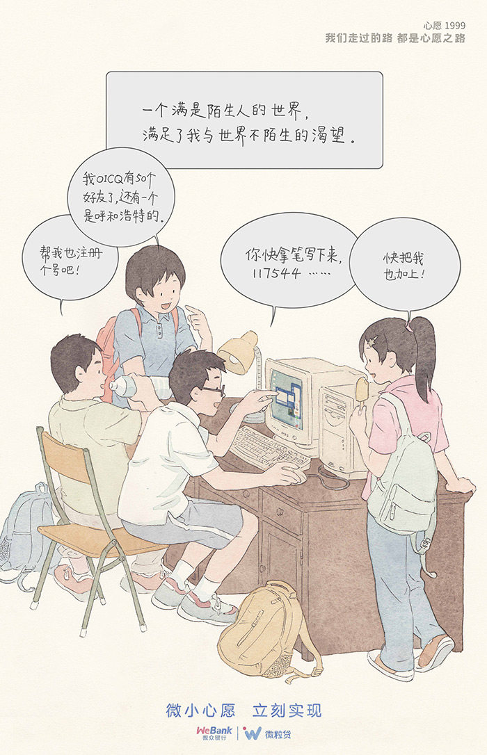 每个心愿只能陪你走一段路,微粒贷深知小心愿的伟大。我们深入挖掘80后的成长故事,在经过多轮调研,查阅资料之后,精选出9个有代表性的心愿场景,并与知名插画师李彬合作,创作了上面这9幅心愿故事插画。以成年后80后的主观视角,回忆+感慨的行文方式,期待与目标消费者形成情感共振。