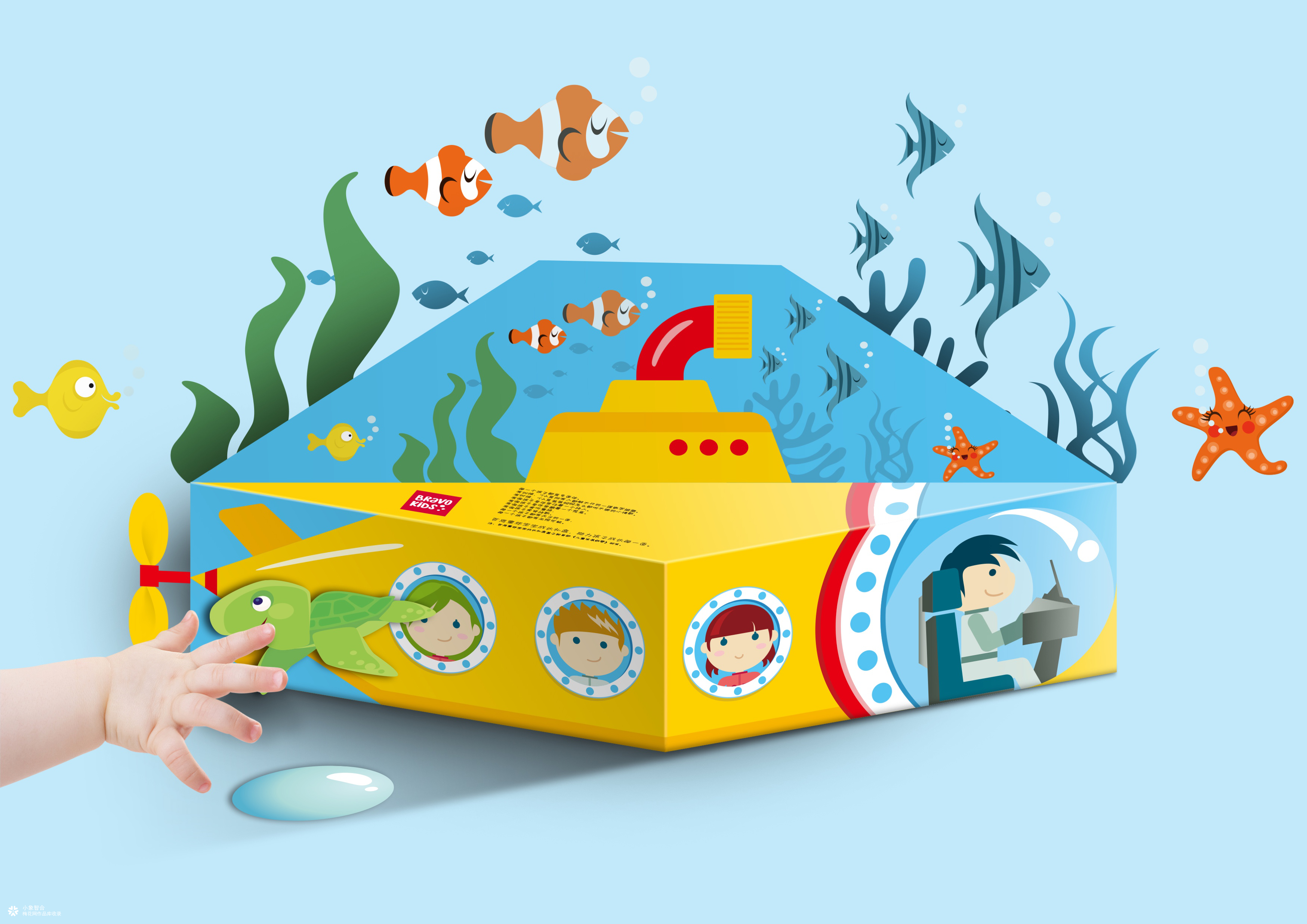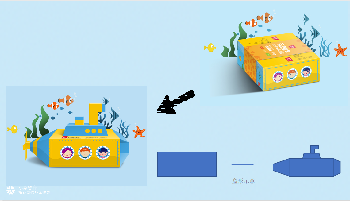 可拆解自组合的潜水艇包装结构,增加填色、贴图等功能,增加了产品的互动性和趣味性,锻炼儿童动手能力。