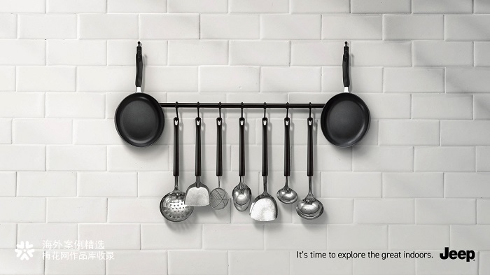 疫情期间,Jeep推出一组海报号召大家居家隔离, 海报由生活用品组成,它们被巧妙的摆放成Jeep标志性圆形大灯和进气隔栅的形状,告诉人们现在正是探索室内的好时机~
