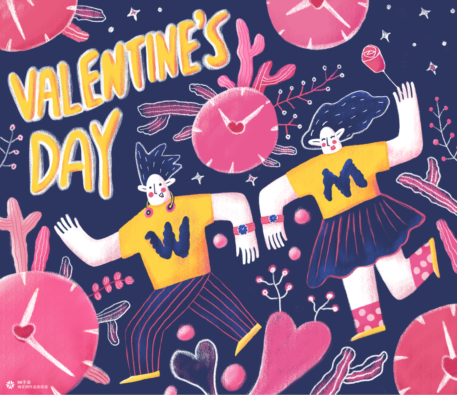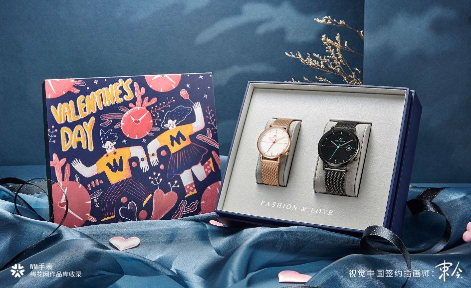 #WM手表#联名知名新生代插画师束今推出情人节【花开时光】限定心意礼盒。从甜蜜恋人之间珍贵浪漫的爱情出发,结合年轻人热爱生活,个性鲜明,追求新鲜事物,勇敢活出自己的特性,创作出丑萌风格的时光恋人形象。将浪漫的粉色、青春阳光的黄色、纯净勇气的蓝色进行色彩糅合,采用年轻、时尚、大胆的异想元素,将时间巧妙的融入各个元素,寓意花开时光,与你同行。同时将logo元素【WM】体现在恋人角色的T恤中,W(我)M(们)意味着陪伴,有你的时光,WM手表一起见证这份浪漫。