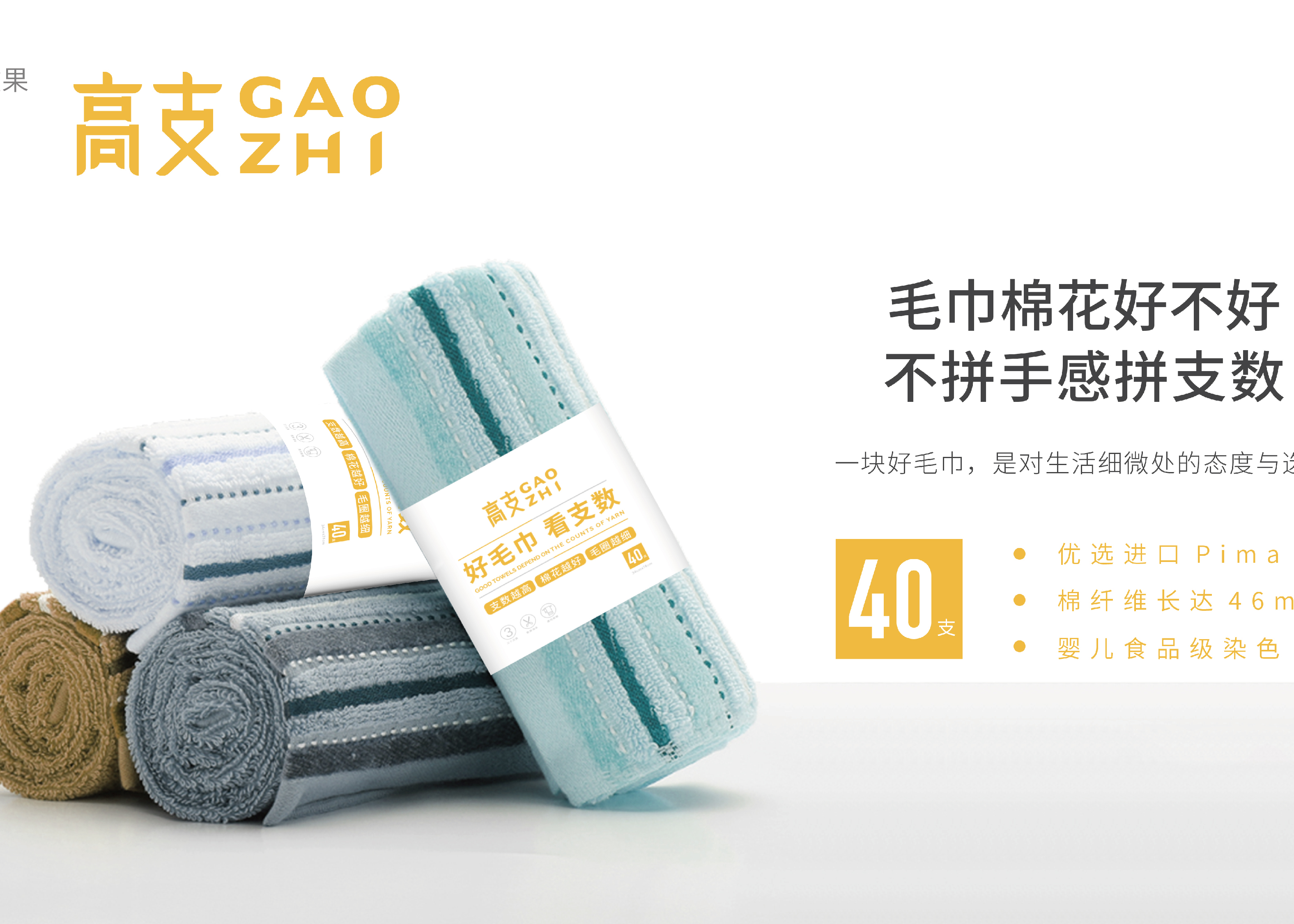 高支毛巾想做一个细分领域的好毛巾——“高支纱”毛巾。而高支毛巾作为一个新品牌,想通过本次品牌设计清晰表达卖点,给消费者一个购买理由,并且将品牌的呈现做到统一性。 高支毛巾需要打造产品的注意力,统一LOGO包装,来帮助企业把品牌理念、品牌文化等信息形象地传达给社会大众。占据品类优势强化自己作为细分品类开创者形象,普及“高支纱”品类概念、产品优点,让高支成为“高支纱”细分品类的代名词,给到消费者能判断高支纱与棉花优劣的标准。 以品牌色黄色为主,搭配高雅的白色,利用广告语“好毛巾 看支数”作为主体文案输出,强化产品视觉的同时加入醒目的支数标签、产品的优势特点等,便于消费获取该产品的信息。