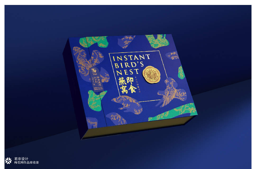 云画燕燕窝礼盒融合了东方宫廷美学与现代设计,以凤凰为形,象征尊贵与领导力。其设计中运用青绿、泥金色调,源于传统青绿山水,表现出奢华与内敛的东方韵味。榜书体的文字图标,细腻温婉,去除雄健,展示岁月沉淀下的优雅。整体设计旨在突显燕窝的高端品质与文化价值,吸引追求高品质生活的年轻群体,成功融合传统与现代,营造独特的礼品体验。