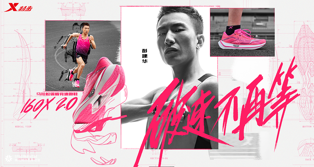 2019年12月15日,特步跑步发布“国人竞速”品牌战略。2019年9月29日,董国建在柏林马拉松,以02:08:28让尘封十余年的国家记录近在咫尺,他脚下的那双鞋正是160X一代。 特步赞助了大半中国马拉松运动员,中国排名前3的运动员董国建、杨绍辉、彭建华都是穿着160X系列打破个人纪录的。 马拉松是一场和自我较量最久的运动,我们去云南拍摄了运动员,就有了这条产品视频。 碳纤维板、中底的发泡材料是跑鞋的卖点,在故事中,也是运动员的破速之旅。