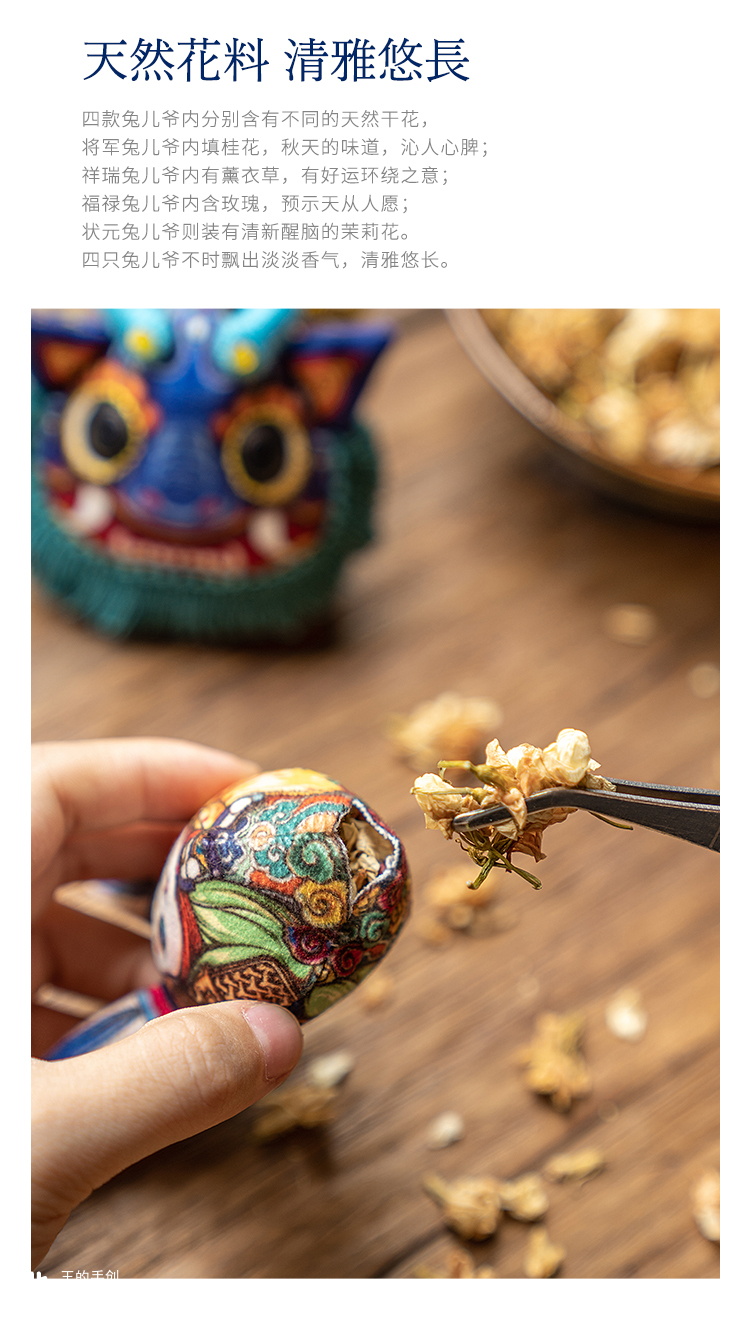 传说兔儿爷是月宫中捣药的神仙,曾下凡救助过受瘟疫肆虐的百姓。 因此,旧时每逢中秋,老北京家中便会请一尊兔儿爷, 于中秋月夜下,摆放在桌子上,瓜果点心供奉, 家中孩子一一向兔儿爷跪拜,祈求一年的无病无灾。 过去的兔儿爷主要为泥塑,又因是孩子们手中的玩具, 很容易损坏。保留原有兔儿爷味道的同时, 我们以布艺的形式重塑其身,手工刺绣,点缀各色彩珠, 较泥塑兔儿爷,易保存的同时,细节更加丰富耐看, 亦便于携带,成为你的专属守护。