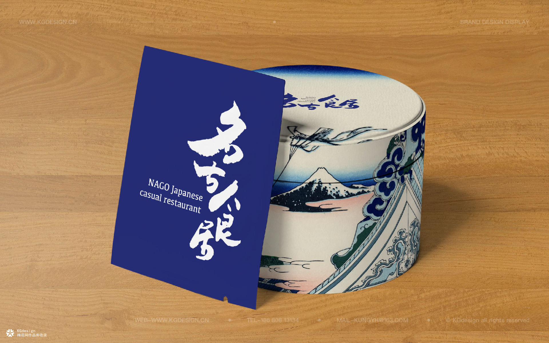 日本料理Logo设计——名古食居 名古食居室一家专营日本料理的中国品牌。构思上采用了日本书道元素,同时融合了中国书法的一些特点,试图将烹饪美食所需要的耐心、时间与工匠精神通过优雅的设计传达出来。该设计整体采用了高饱和度的蓝色作为主色调,体现出日本料理“水”这一主要特点,以与中式“火”的料理区别开来。深蓝色也代表海洋,展现出原料的诗意。