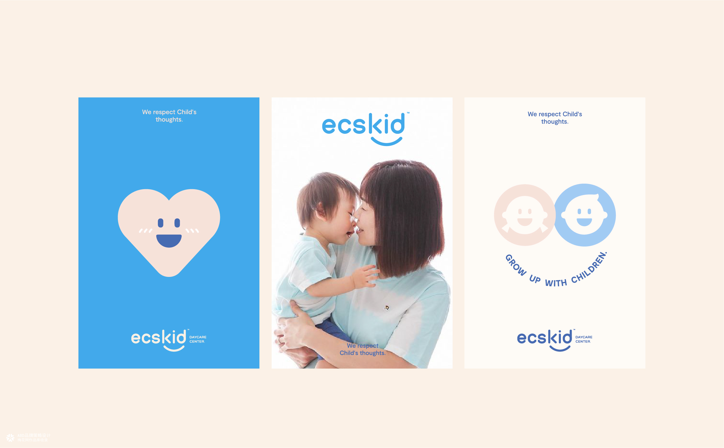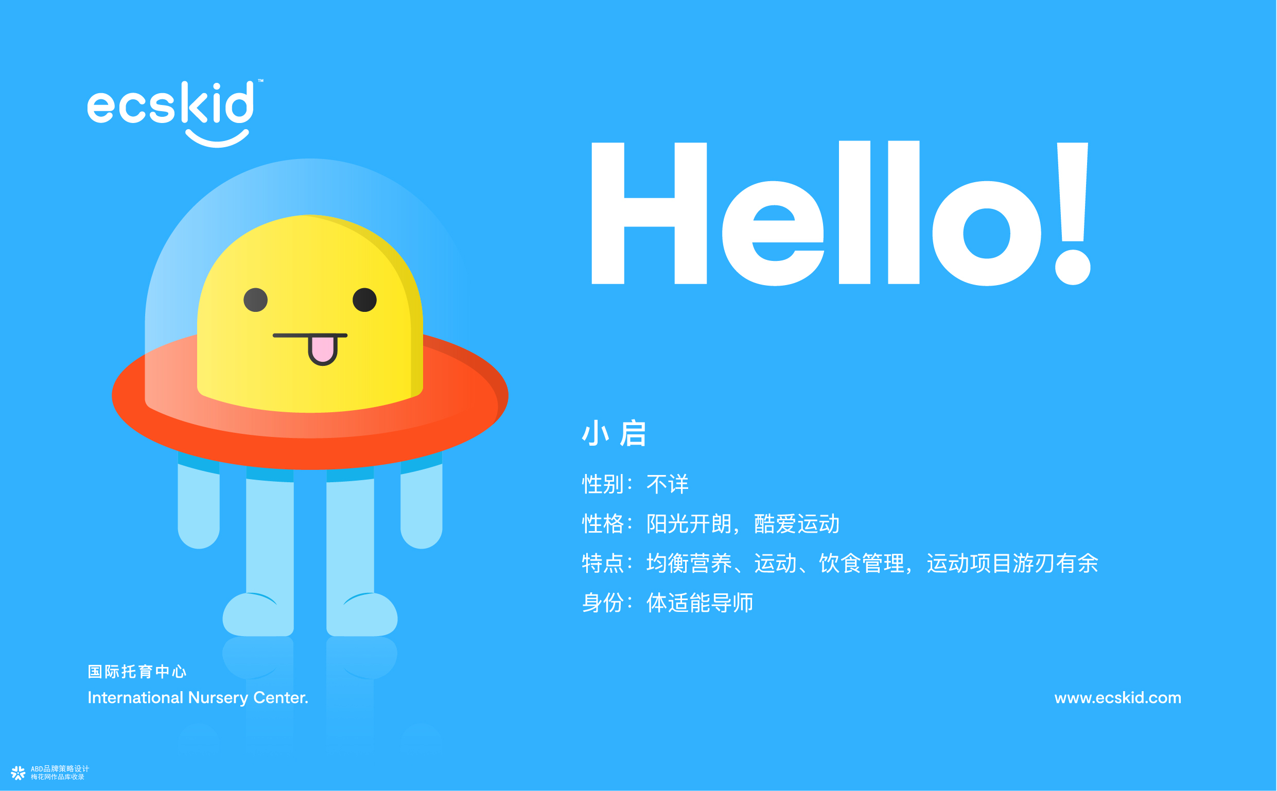 ecskid伊启萌是一家中高端早教托育园所,拥有专业的师资团队,以发育商的五大领域为核心打造课程。 为了对品牌的品类联想更清晰,我们确定了“e=education,教育;c=care,关爱照顾;s=soport,运动;kid=儿童”的品牌内涵,以此组成品牌的英文名称,以符合“专注早教、托育、体适能”的品牌定位。 伊:初始;启:启智;萌:萌发,我们尊重并理解每一位孩子的想法,依循孩子的天性,开发启迪,激发内在潜能。同时,谐音“一起萌”,朗朗上口,具有呼吁性与画面感,给人一种童趣天真的感觉。 在标识设计上,为了表现品牌倡导的教育理念,呼应“ecskid”品牌名称,巧妙的通过点缀“微笑弧线”“用心呵护”组合成为⼀种差异化的视觉记忆点。