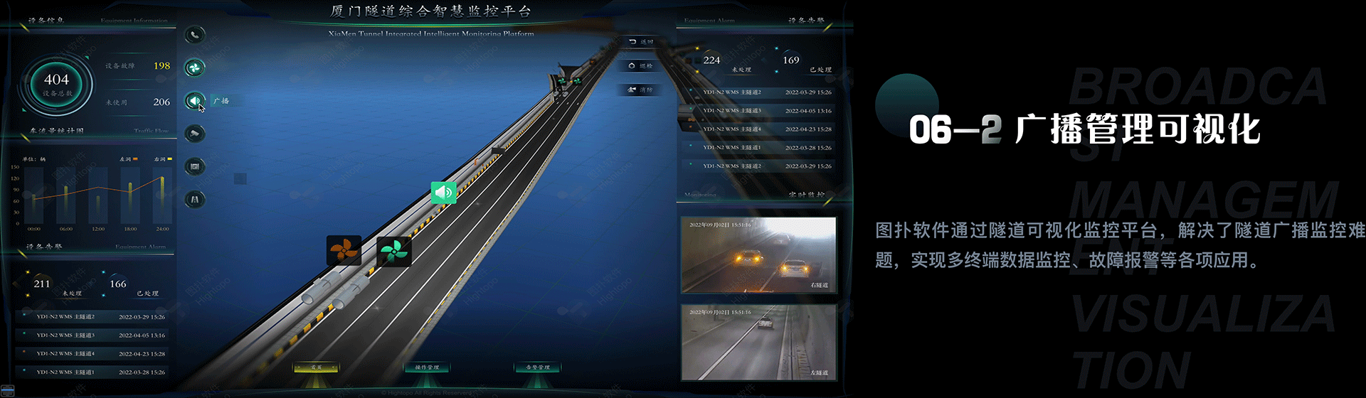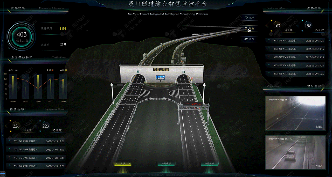 隧道作为重要交通建筑设施,为缩短运行距离、提高运输能力、减少事故等方面起到重要作用。同时隧道交通具有流量大、行车速度快的特点,且内部含有大量照明、风机、水泵、指示器、情报板、供电等设备设施,若隧道内出现交通事故或设备故障等紧急情况将会对隧道内人员安全以及交通运输等带来重大影响。传统的隧道运营管理常常因为远离中央控制管理中心,导致隧道运营管理和维护都十分困难。 图扑软件基于 HTML5 的 2D、3D 图形渲染引擎,结合 GIS 地图,以 B/S 技术架构打造一套实现智慧隧道全联接、全智能的可视化管理方案 ——智慧隧道中心调度平台。以隧道综合管控为导向,提升设备控制、事件预警、流程管理、应急处置等综合业务能力。助力隧道运营管控朝着更智慧、更安全、更便捷的方向发展,推动交通行业的数字化转型升级。