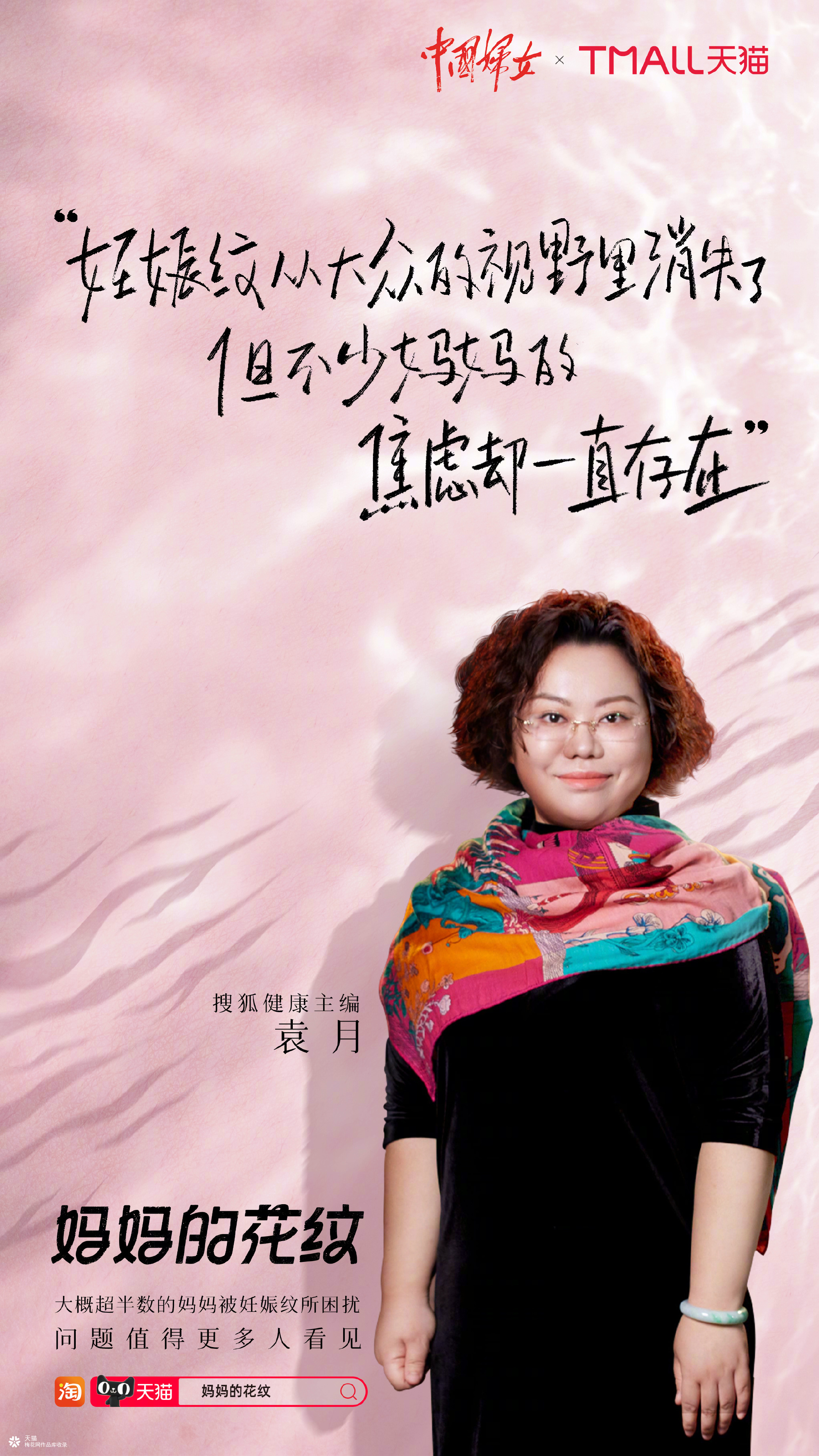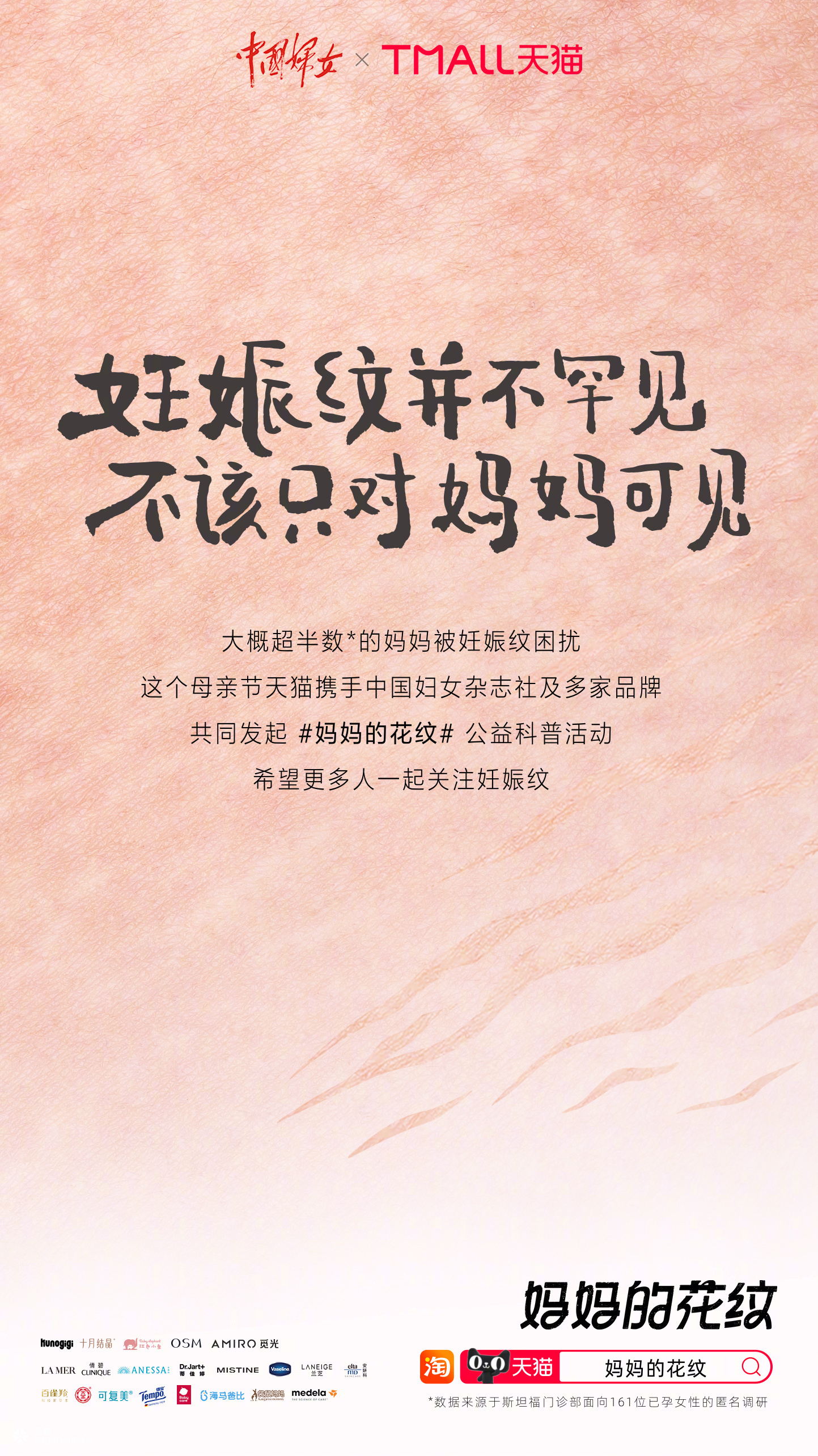 妊娠纹,是大概超过半数的妈妈都曾遇到的问题。但事实上,除了妈妈们以外,很少有人会主动去了解与关注,我们也很少在日常生活里见到或听人提起妊娠纹。妊娠纹虽然不在大家的视野里,但妈妈们的焦虑一直都存在。关注本身就是一种力量,这个母亲节,天猫携手中国妇女杂志社发起「妈妈的花纹」主题活动,力挺每一位妈妈,赢得妈妈群体以及社会的关注;希望可以通过联合品牌及明星发声、「妊娠纹科普卡片」免费派发、概念款产品打造以及主题话题征集等方式,让更多人友善和科学的关注妊娠纹,不再以美丑的目光去看待它,而是真正理解和尊重妈妈们,给予妈妈们更多支持,从而减轻她们心里的压力。