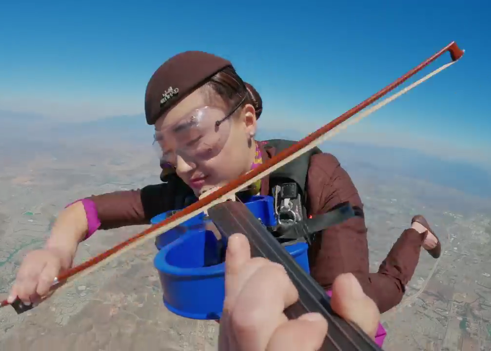 这个航空公司竟然让机组人员一边跳伞一边演奏乐曲?