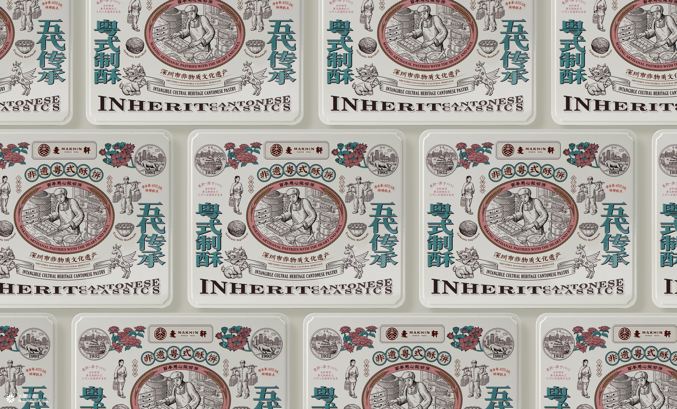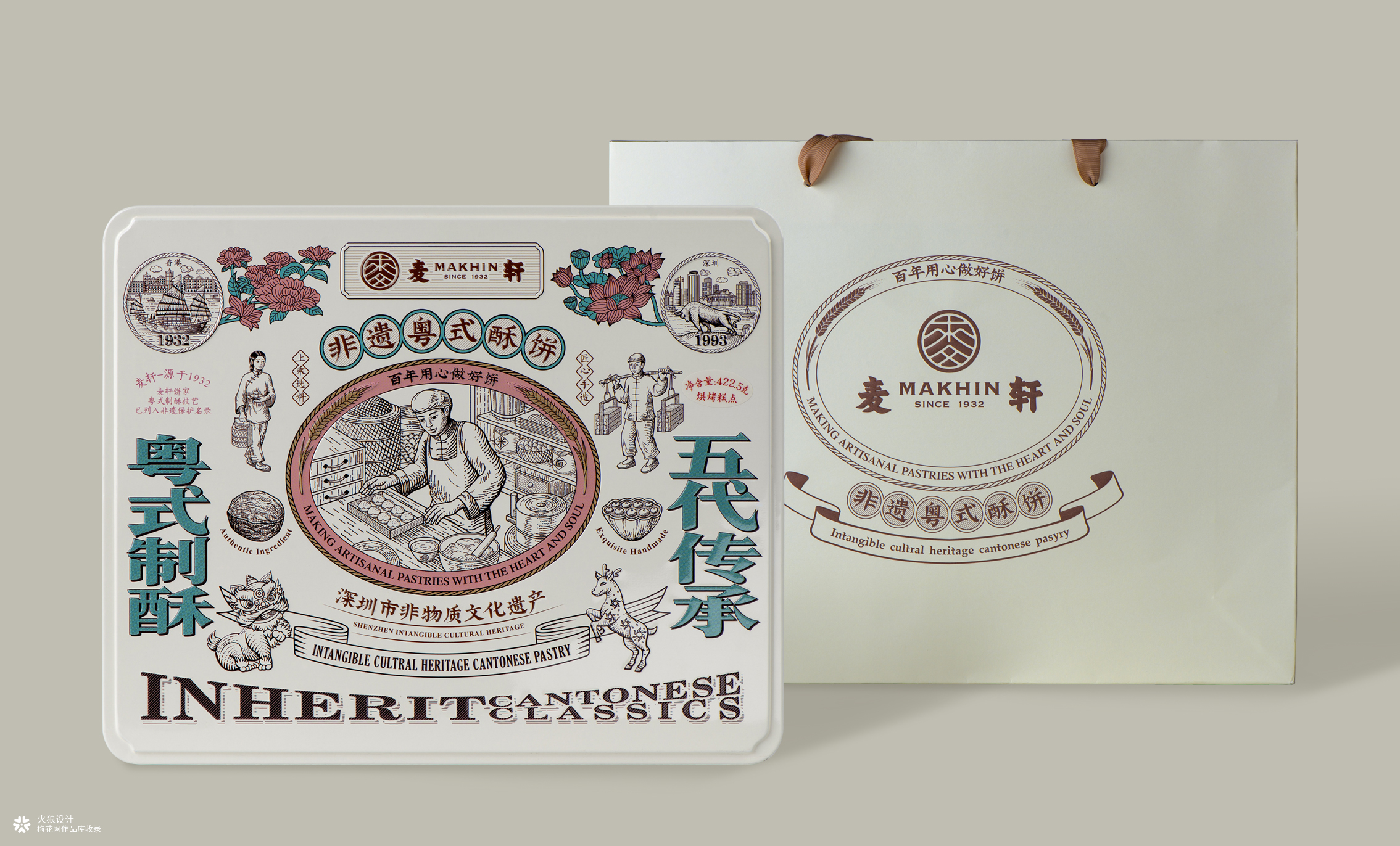 手拿酥饼的女孩,和挑担子售卖酥饼的年轻男子,是麦轩品牌起源时期:1932年香港酥饼销售的现状。醒狮是岭南的特色,鹿象征俸禄。都有吉祥之意。