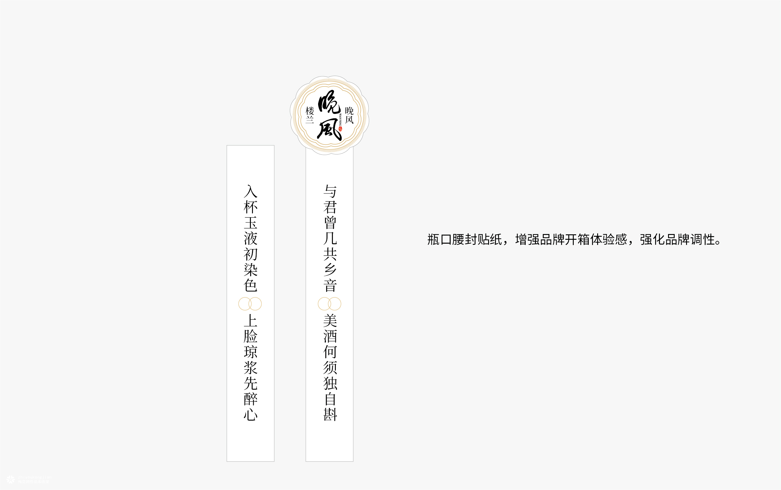 醉在晚风里 杯酒话人生 整体包装设计采用大道至简设计思路。 色彩用金色和黑色为主色,代表着高贵、典雅与经典 晚风—字体采用书法手写体,笔法洒脱、 一气呵成、灵动飘逸,轻盈活泼, 细节具有节奏美,工整讲究联结成章、 印章增加文化属性, 品牌新生流露品牌的匠心理念和气质。 玫瑰花—玫瑰花作为点缀,体现产品属性, 酒里有玫瑰香味,食之芳香甘美,令人神爽, 玫瑰,象征着爱与美, 玫瑰体现女性对浪漫,美好的向往。
