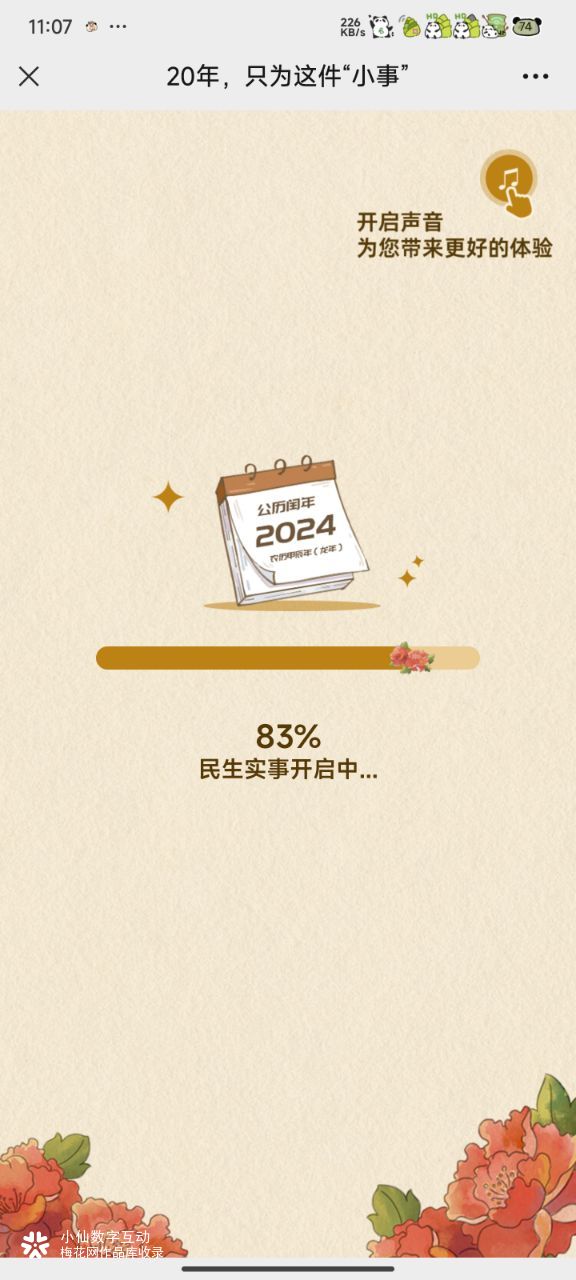 项目背景: 2023年是浙江省实行“民生实事”政策的第20年,浙江卫视向群众介绍“民生实事”政策的起源、出台的一系列政策、用于民生事业的财政制度、民生实事任务等情况,提高公众福祉,打造服务型政府的形象。 交互形式: 1、通过加载页进入首页。 2、打开背景音乐,根据页面提示向上滑动。 3、页面进行年份倒计时,从2023年到2003年。 4、页面向上滑动观看民生实事故事和数据。 应用场景:周年回顾