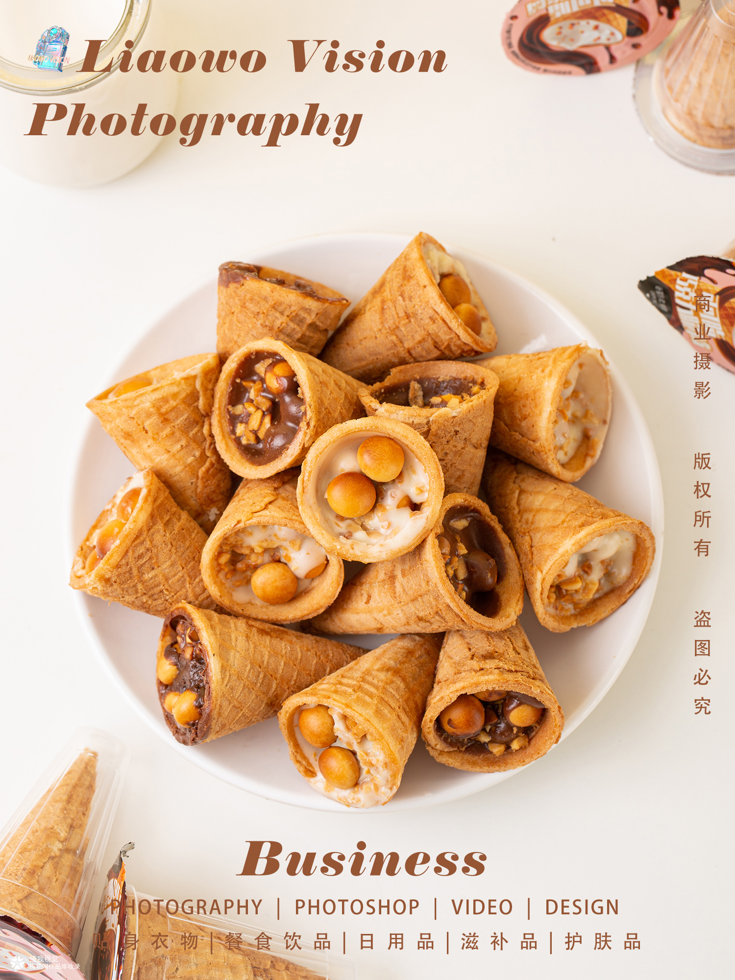 本次营业服务板块: 餐食饮品 | 巧克力脆筒 x 零食拍摄 x LIAOWO VISION 视觉全案出品:撩我视觉 注:作品仅分享,不得任何商用