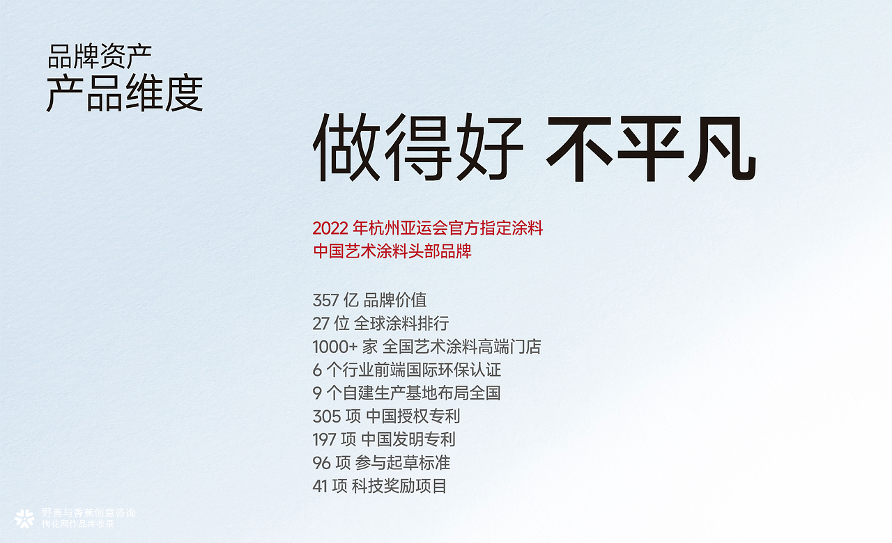嘉宝莉是涂料行业的头部品牌,也是中国较早的艺术涂料品牌之一 。 2022 年入选杭州亚运会官方指定涂料,被业内誉为中国涂料的骄傲。 2023年,野兽与香蕉和嘉宝莉建立战略合作,成为嘉宝莉长期且稳定的策划设计顾问。 野兽与香蕉团队从定位体系、视觉体系、空间体系三大核心板块入手,协助嘉宝莉艺术涂料走上发展新阶段。以全新的形象和消费者沟通,传递品牌价值和态度,将品牌打造成家居美学先行者! 客户名称 : 嘉宝莉化工集团股份有限公司 服务内容 : 艺术涂料品牌战略策划 (定位体系:产业价值定位、消费价值定位、用户沟通定位、品牌全案设计(logo、vi、超级符号、全国连锁门店空间) 所属行业:艺术涂料品牌全案丨泛家居行业品牌全案丨大建材行业品牌全案