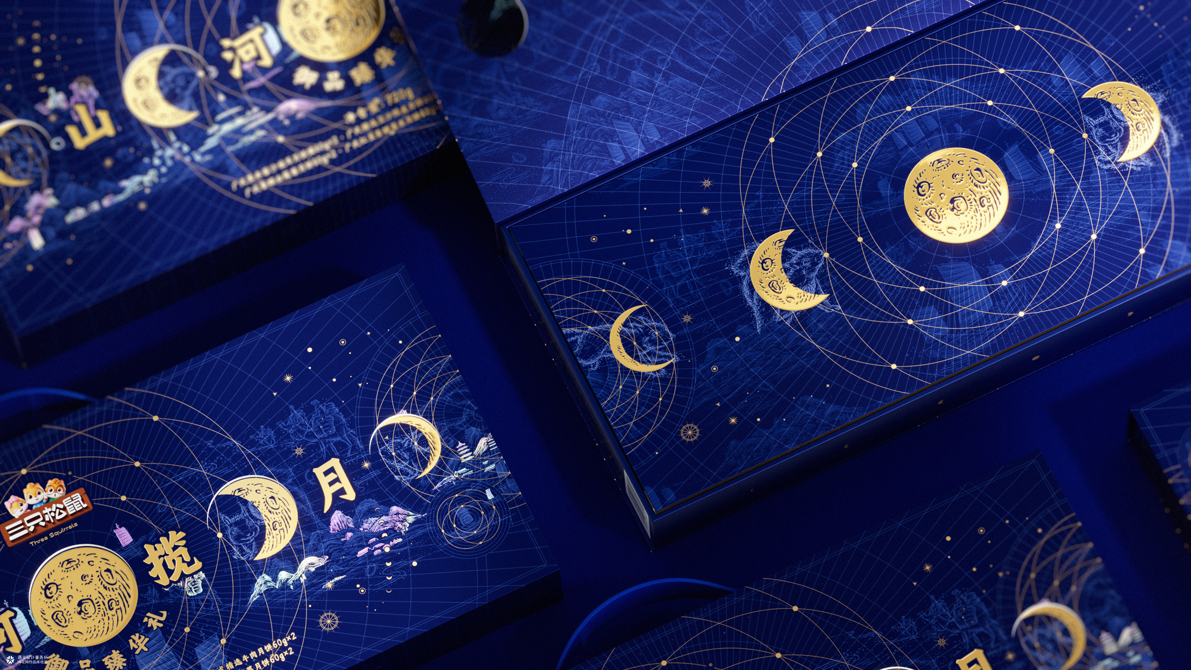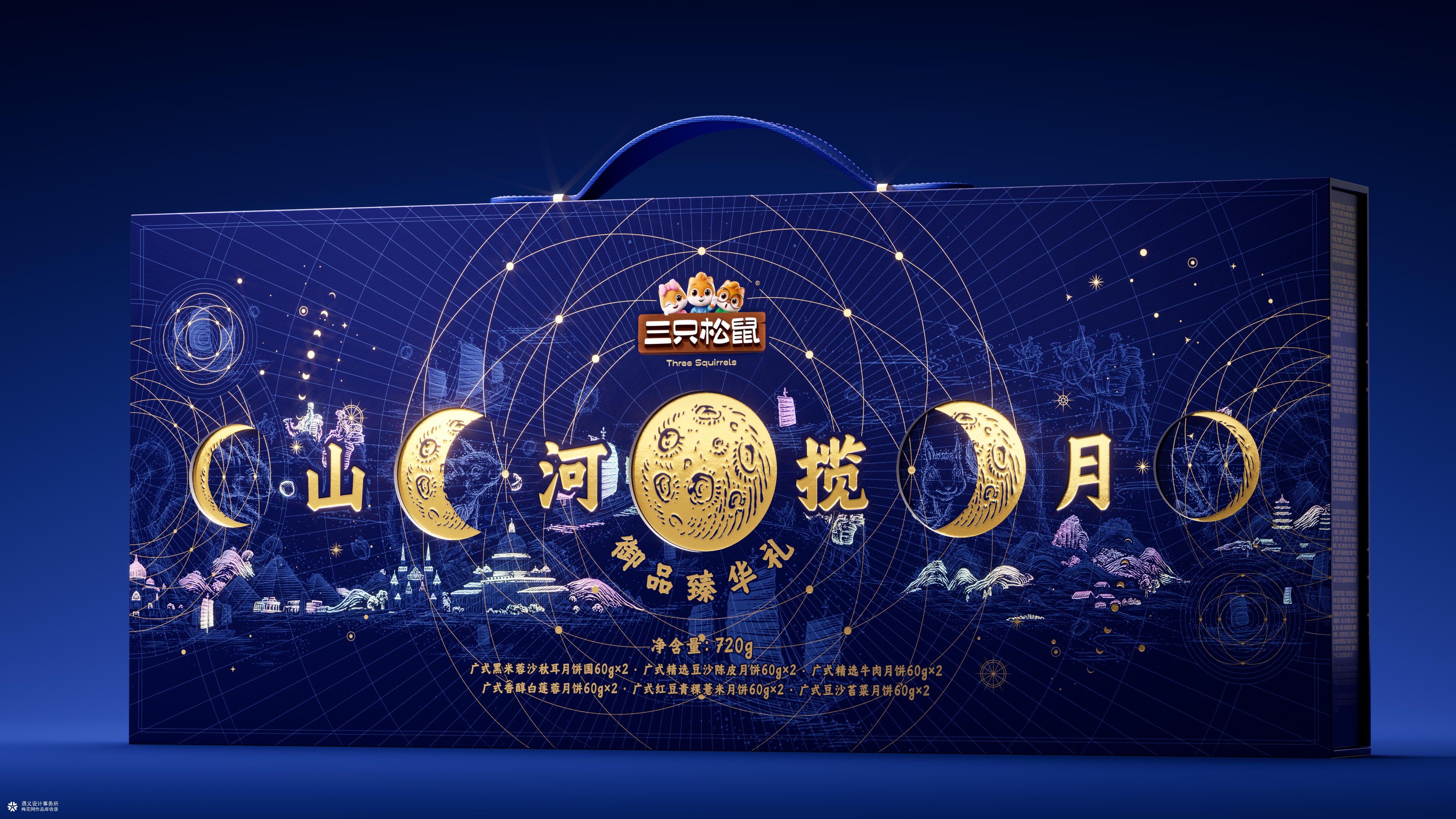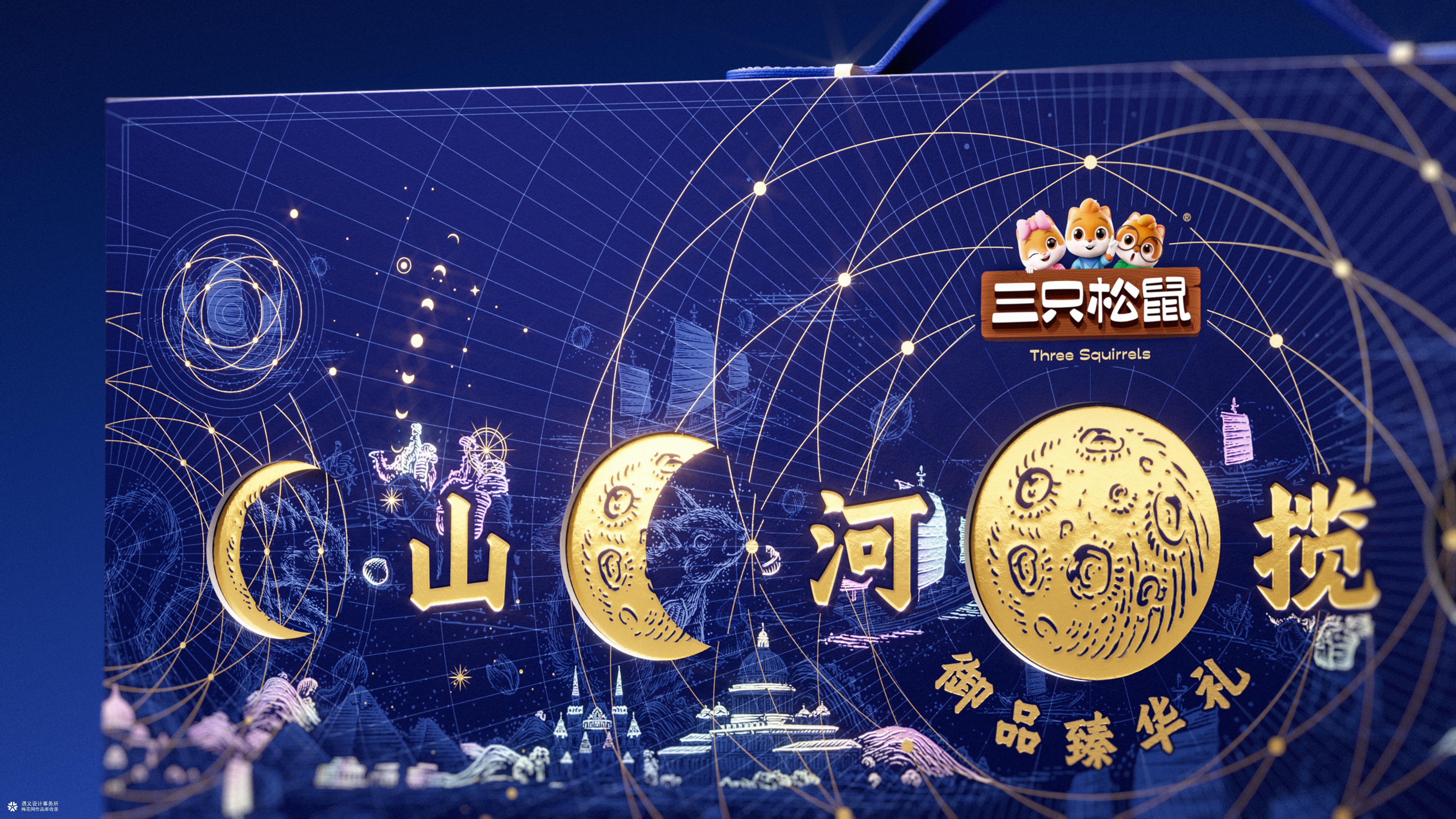 中秋的月亮,天然具有连接感。它既属于东方的诗意,也能成为世界共享的符号。深蓝色对应海与夜空的辽阔,圆的秩序去呼应月亮的轨迹。无论相隔多远,我们都在同一轮明月之下。礼盒正面,“开窗”留出月相,你透过它看到月相的变换,也在与礼盒之外的世界建立连接。圆缺有序,往复不息,距离可以很远,心意却能同步。 松鼠携带果实,成为跨越山海的信使,坚果因此化作一种文化的媒介,承载着情感与祝福。星图与航海线路,让画面具备方向与流动,也呼应着“跨越山海”的主题。连接、共享、秩序 —— 这是松鼠文化宇宙里的“星辰与海”。 创作信息 作品名称:三只松鼠 山河揽月御品臻华礼月饼礼盒 品牌持有:三只松鼠 股份有限公司 包装设计:遇义设计事务所 Lascaux Design Firm 品 牌 方:鼠 瑰琦 原创设计:陈 义文 许 英达 谷 振 视觉表现:董 天 干 丁哲 项目推广:吕 宇星 王 钰