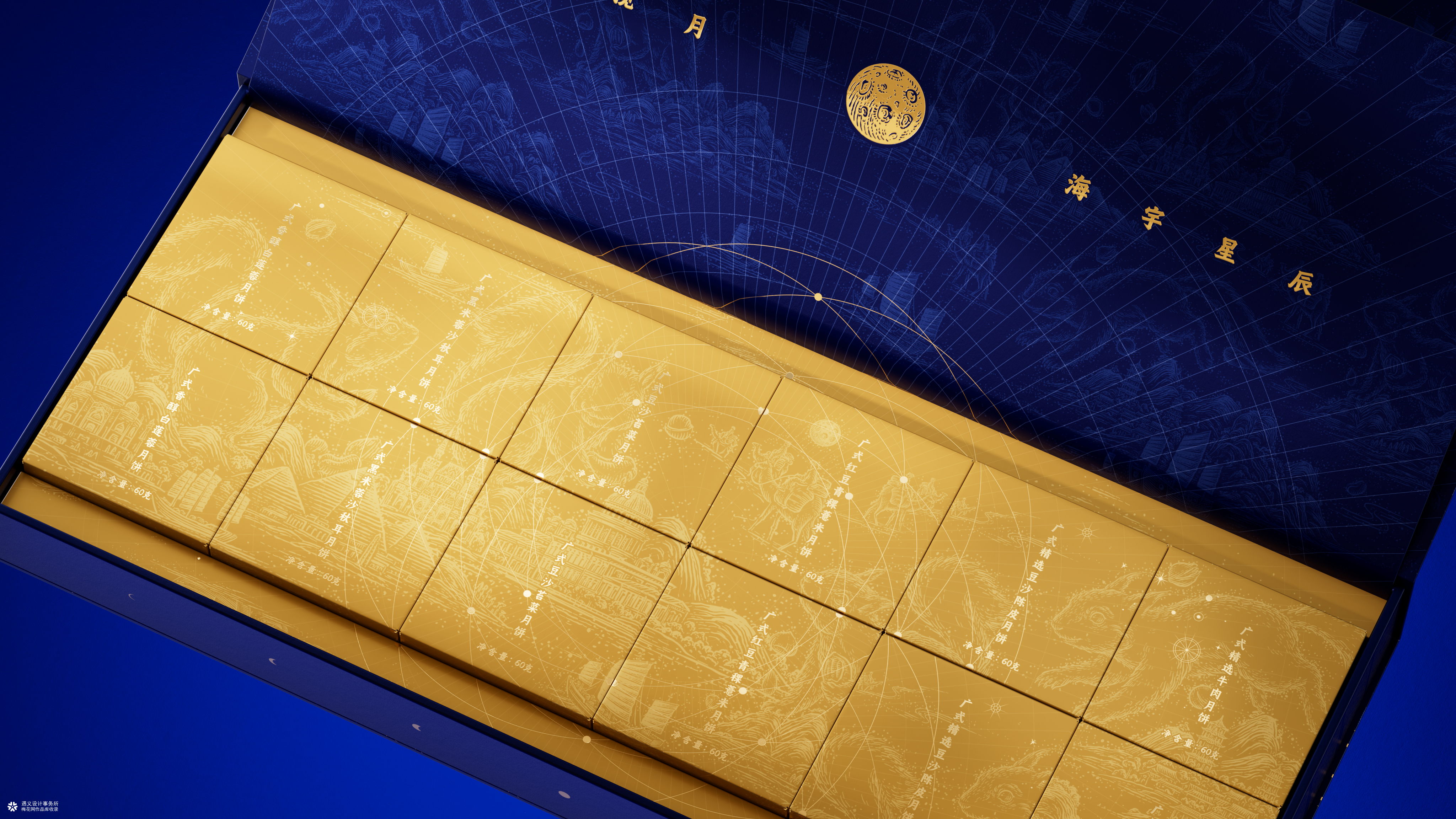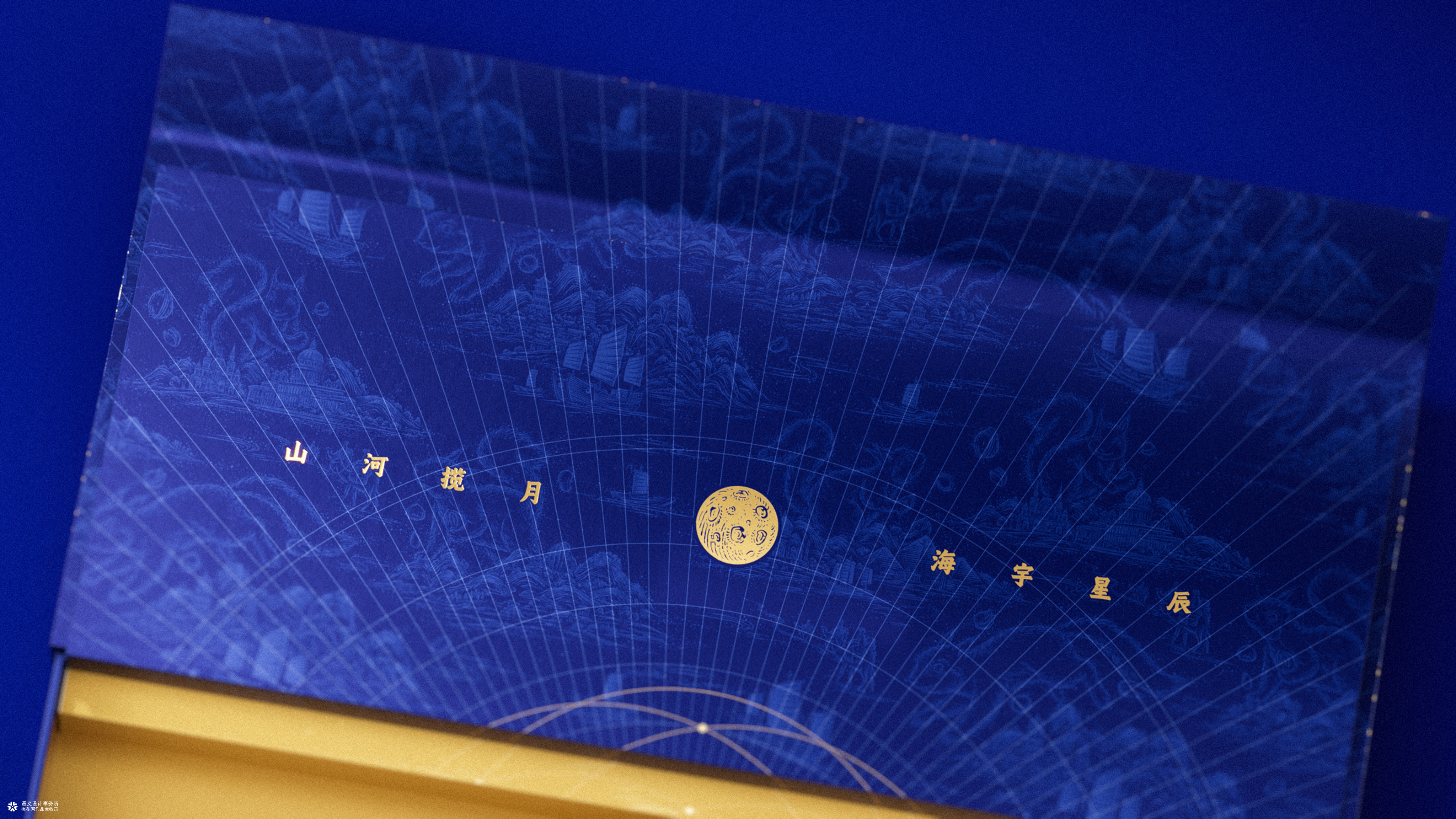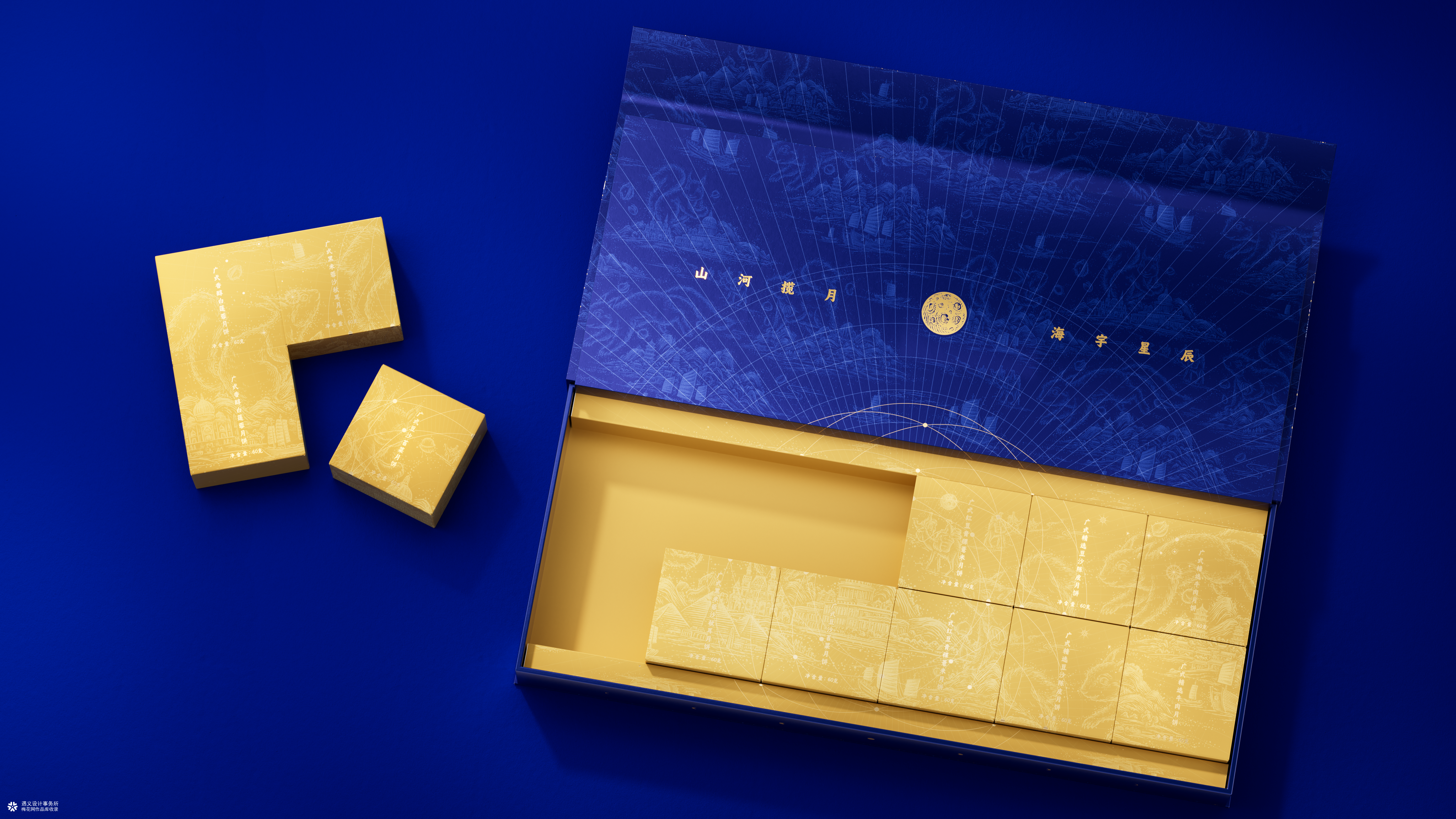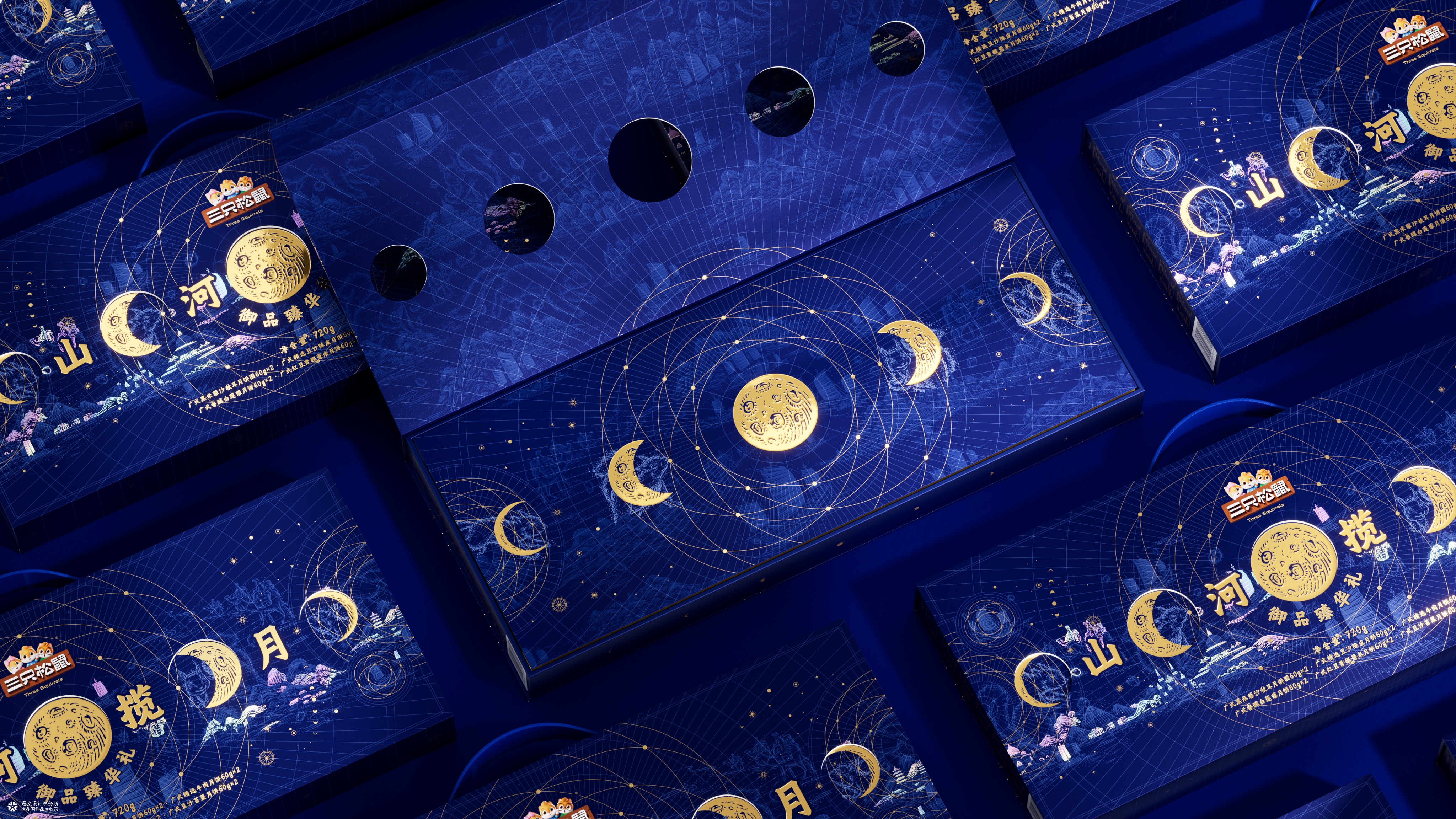 中秋的月亮,天然具有连接感。它既属于东方的诗意,也能成为世界共享的符号。深蓝色对应海与夜空的辽阔,圆的秩序去呼应月亮的轨迹。无论相隔多远,我们都在同一轮明月之下。礼盒正面,“开窗”留出月相,你透过它看到月相的变换,也在与礼盒之外的世界建立连接。圆缺有序,往复不息,距离可以很远,心意却能同步。 松鼠携带果实,成为跨越山海的信使,坚果因此化作一种文化的媒介,承载着情感与祝福。星图与航海线路,让画面具备方向与流动,也呼应着“跨越山海”的主题。连接、共享、秩序 —— 这是松鼠文化宇宙里的“星辰与海”。 创作信息 作品名称:三只松鼠 山河揽月御品臻华礼月饼礼盒 品牌持有:三只松鼠 股份有限公司 包装设计:遇义设计事务所 Lascaux Design Firm 品 牌 方:鼠 瑰琦 原创设计:陈 义文 许 英达 谷 振 视觉表现:董 天 干 丁哲 项目推广:吕 宇星 王 钰