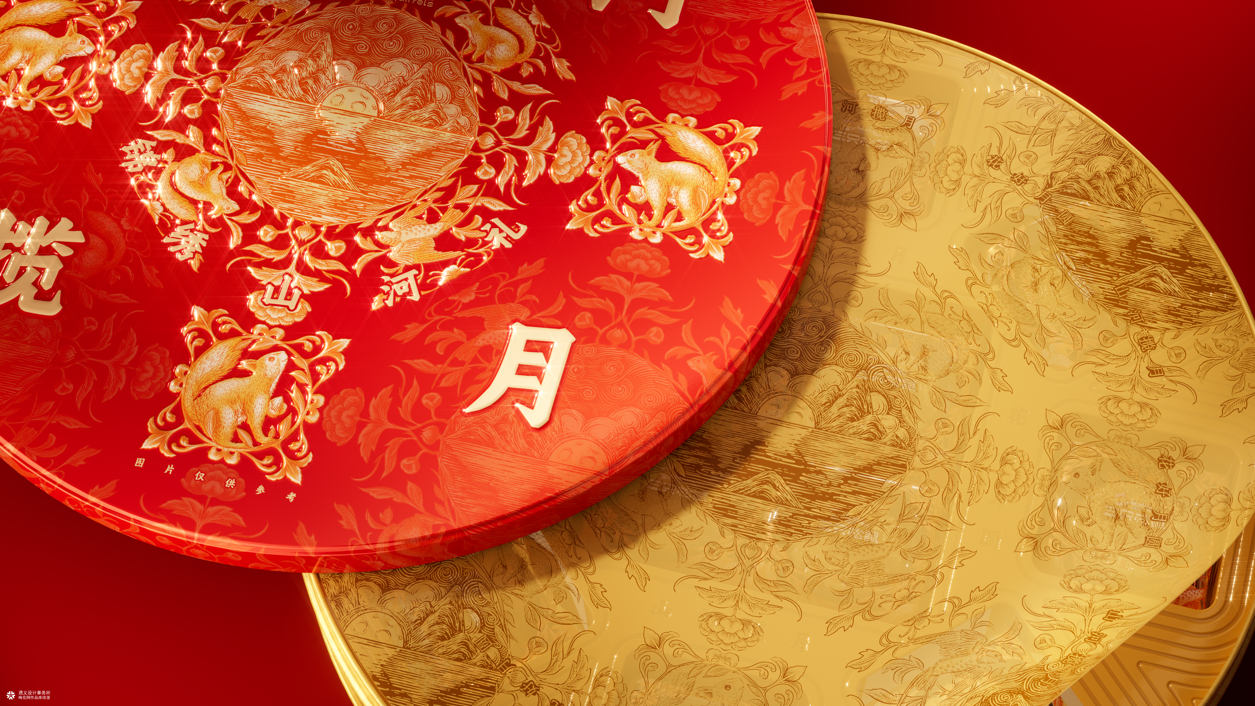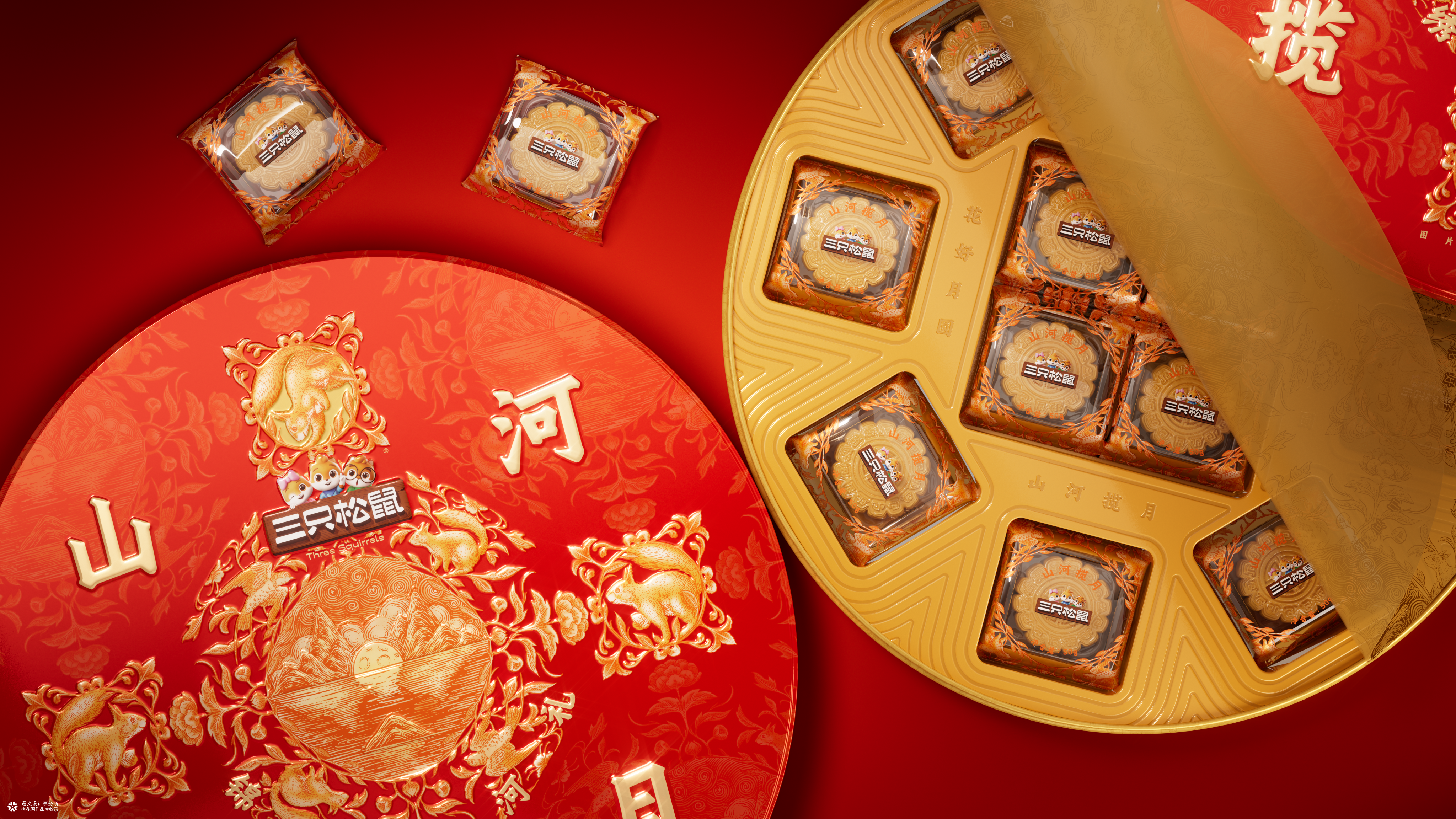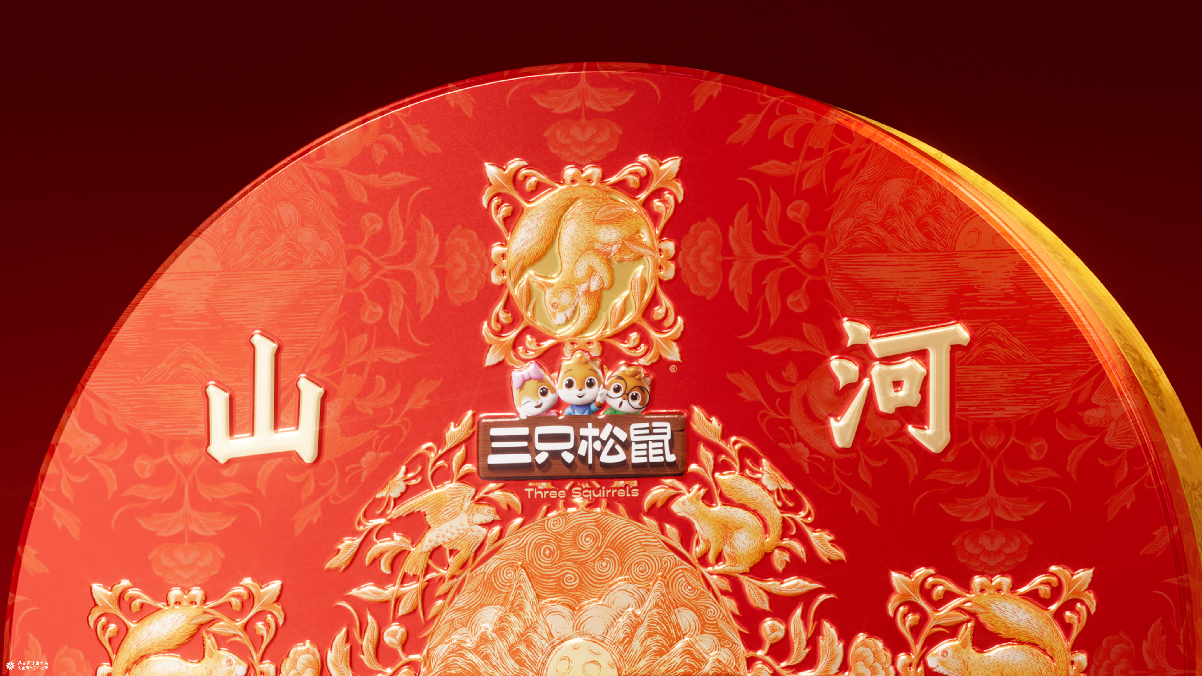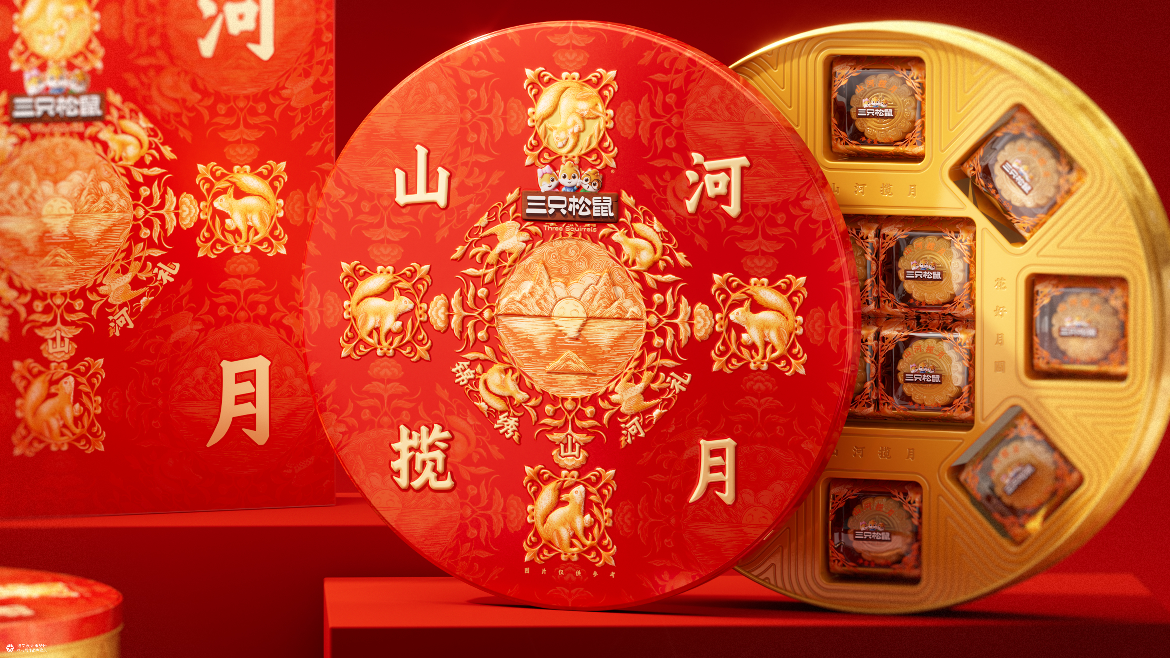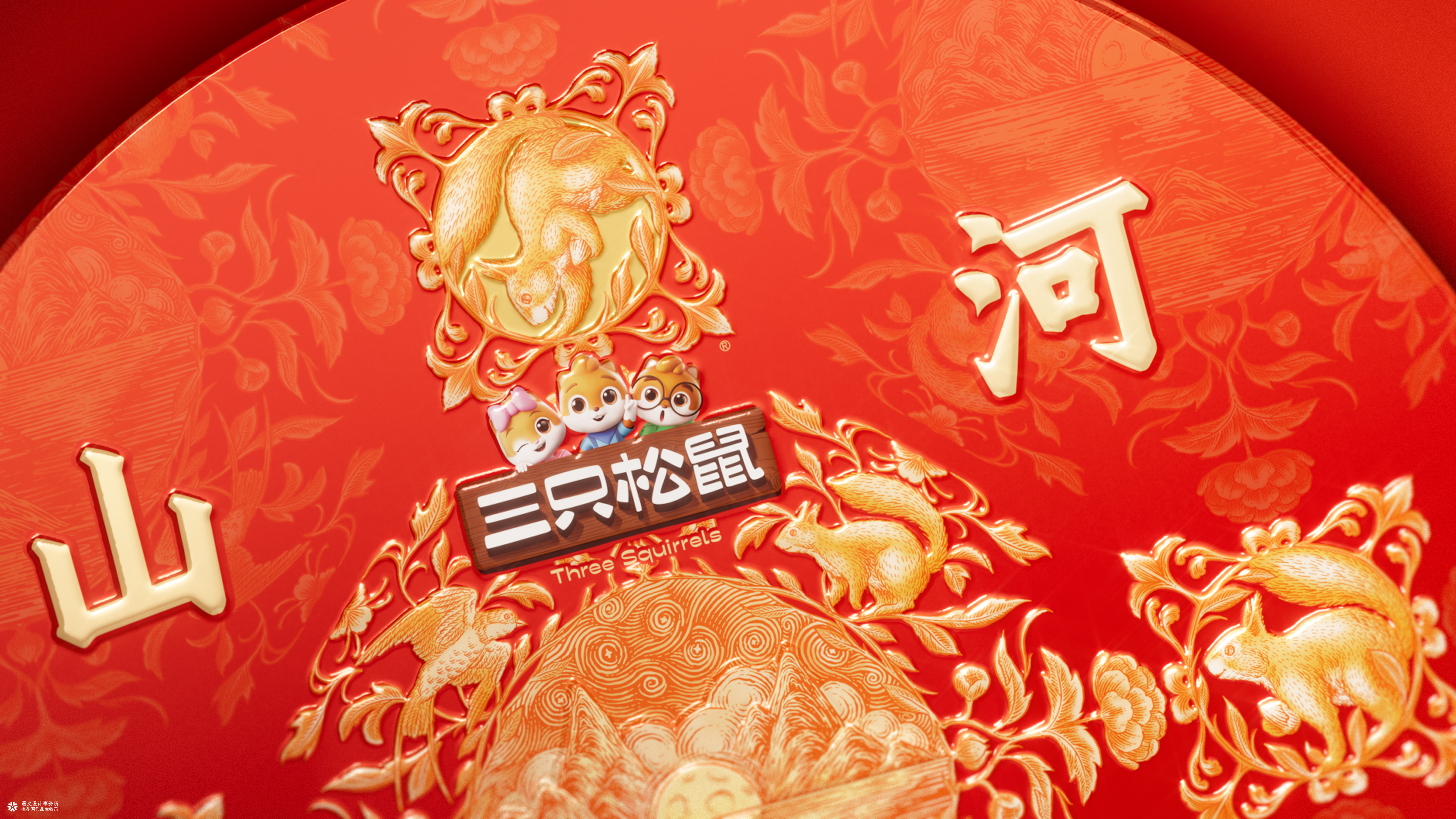 花好月圆,这是最质朴的中秋心愿,也是最恒久的中国式祝福。礼盒以万花筒为灵感,当山河、松鼠和中秋符号在图案里不断交织,层层叠叠,四方延展。像老花一样永续,又像月圆一样周而复始。橙金基调,体面而热烈,带着节日的能量与礼赠的仪式感,让祝福在视觉上就能被感知。 图案的“四方连续”工艺,让画面可以无边延展,既是东方纹样的传统,也是“团圆”在设计语言上的再一次强化。松鼠的形象被嵌入其中,它不再只是符号点缀,而是成为万花筒图景里循环不息的一部分,如同生命的延续,世代相传。团圆、传承、生命 —— 这是松鼠文化宇宙里的“生生不息。 创作信息 作品名称:三只松鼠 山河揽月锦绣山河礼 月饼礼盒 品牌持有:三只松鼠 股份有限公司 包装设计:遇义设计事务所 Lascaux Design Firm 品 牌 方:鼠 瑰琦 原创设计:陈 义文 许 英达 谷 振 视觉表现:董 天 干 丁哲 项目推广:吕 宇星 王 钰