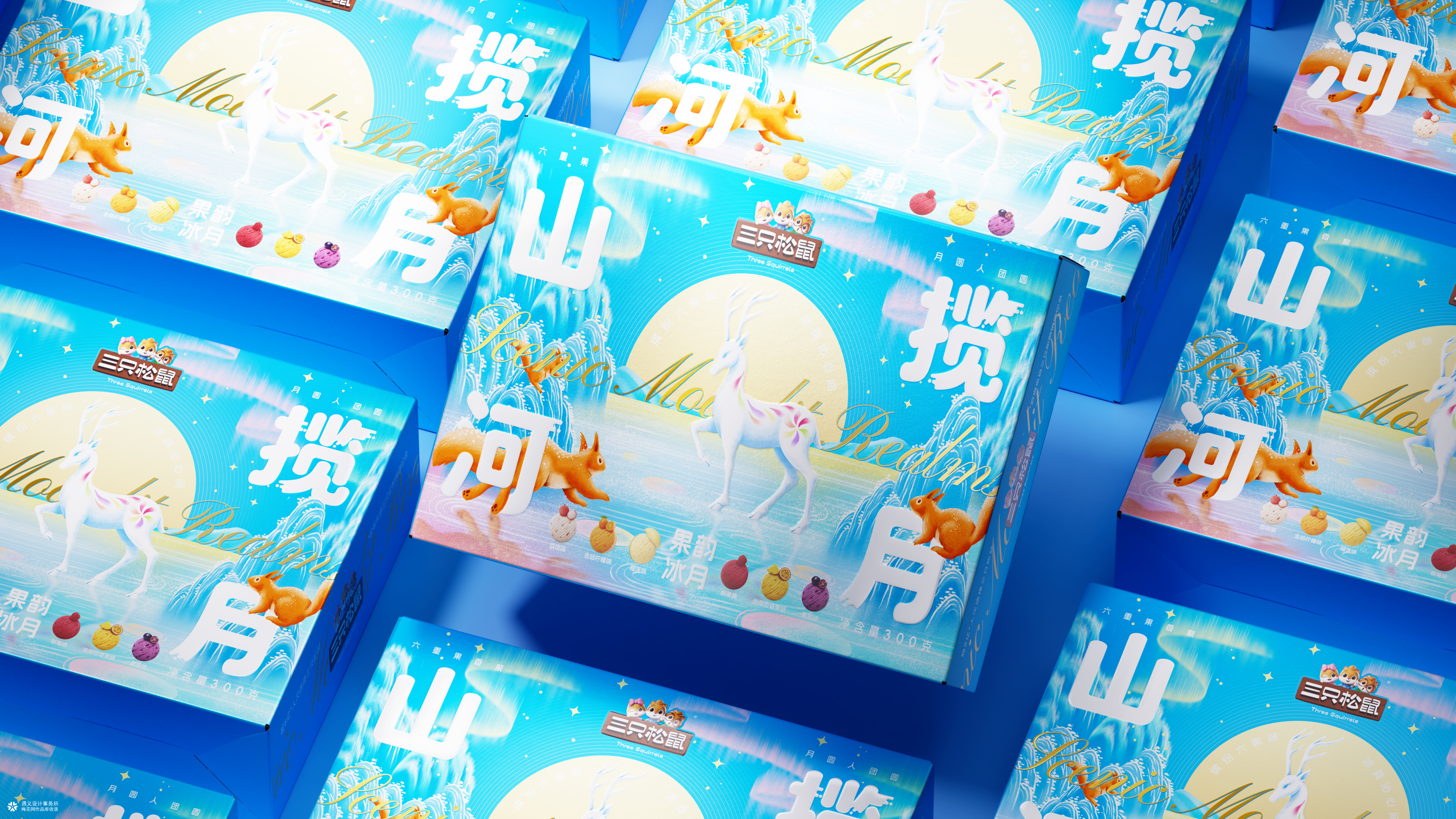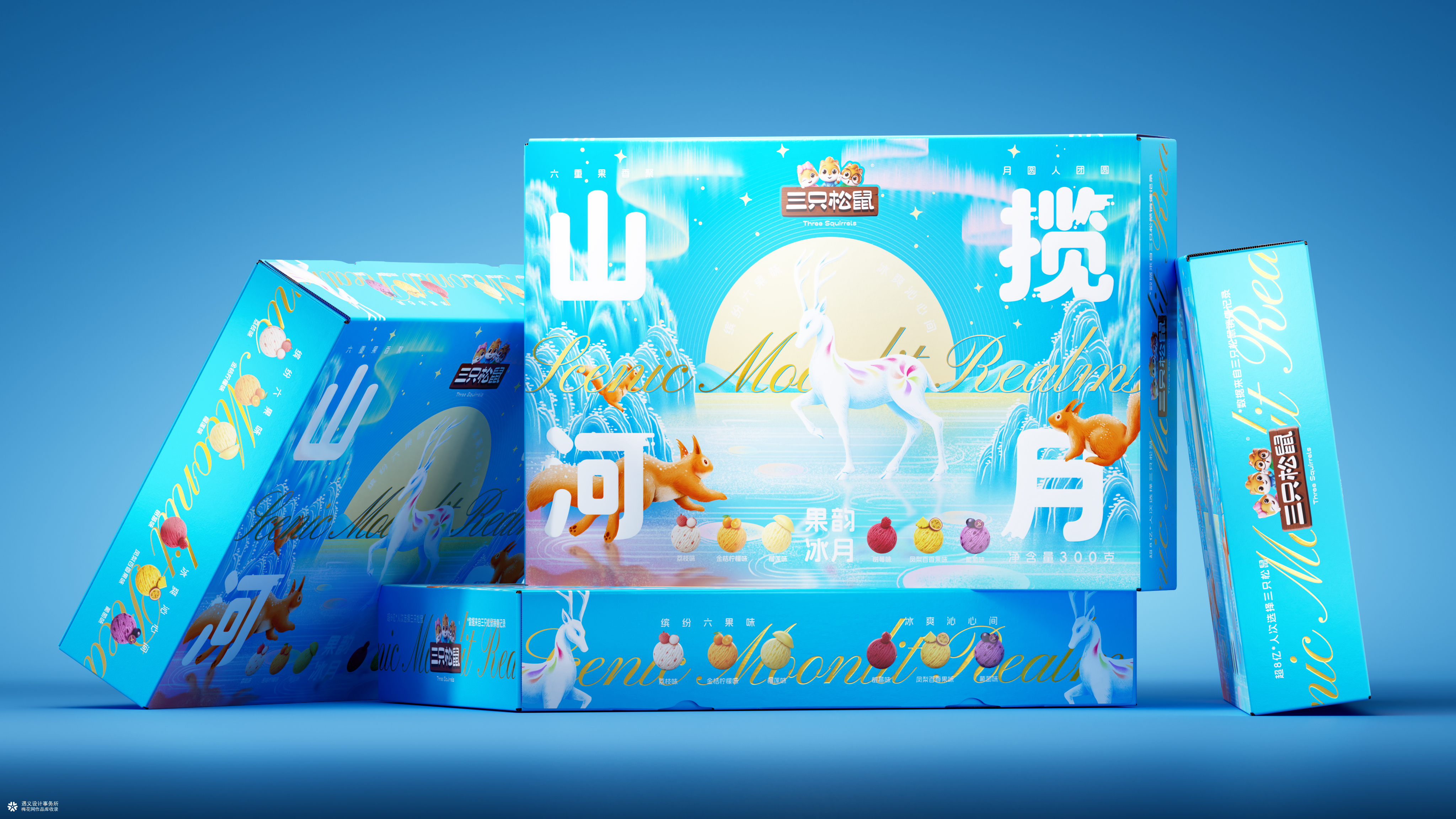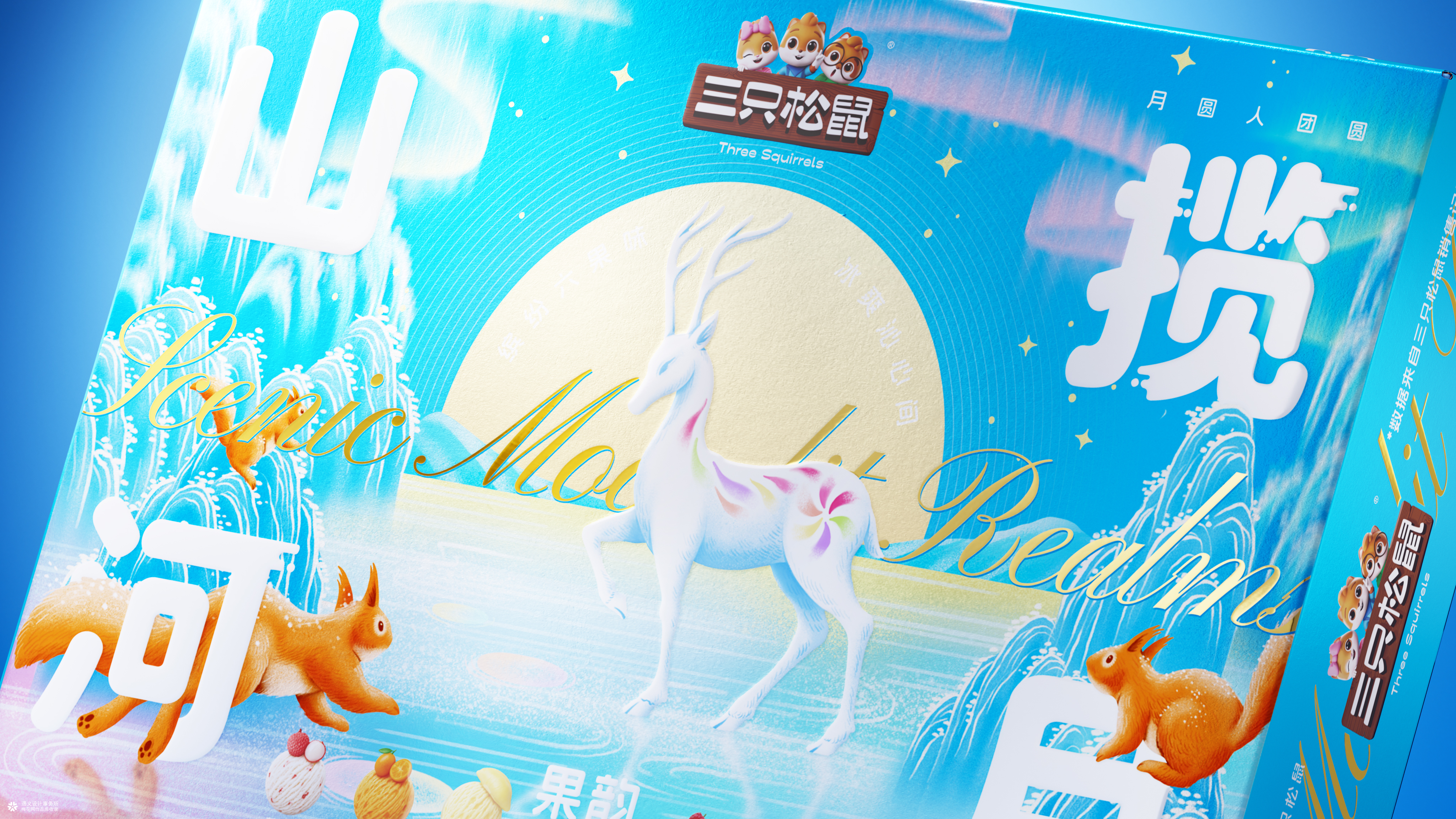 冰淇淋月饼的属性生发出来的视觉和文化语境,把我们带入冰雪世界。敦煌壁画里,九色鹿常被视作祥瑞之兽,它出现的地方,总能带来庇佑与安宁。浅蓝的纯净映衬圆月,在极境的静谧里,白鹿揽月入怀,为冷冽的世界带来守护与安宁。 转化为视觉层次的果味色彩融入鹿身,让冰雪背景更生动,冷中有暖,静中见光。中式山水点缀其间,把幻境和人间烟火轻轻相连,它寄托的,是纯净长久的愿望,也是祥瑞守护的心意:愿团圆如月,安宁常在。祥瑞、守护、纯净——这是松鼠文化宇宙里的“守望与庇佑”。 创作信息 作品名称:三只松鼠 山河揽月果韵冰月 月饼礼盒 品牌持有:三只松鼠 股份有限公司 包装设计:遇义设计事务所 Lascaux Design Firm 品 牌 方:鼠 瑰琦 原创设计:陈 义文 许 英达 谷 振 视觉表现:董 天 干 丁哲 项目推广:吕 宇星 王 钰