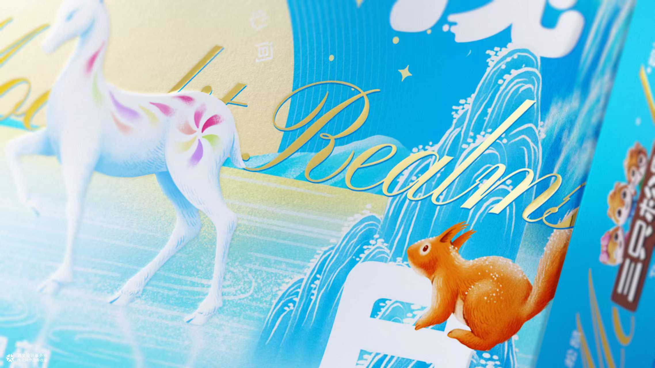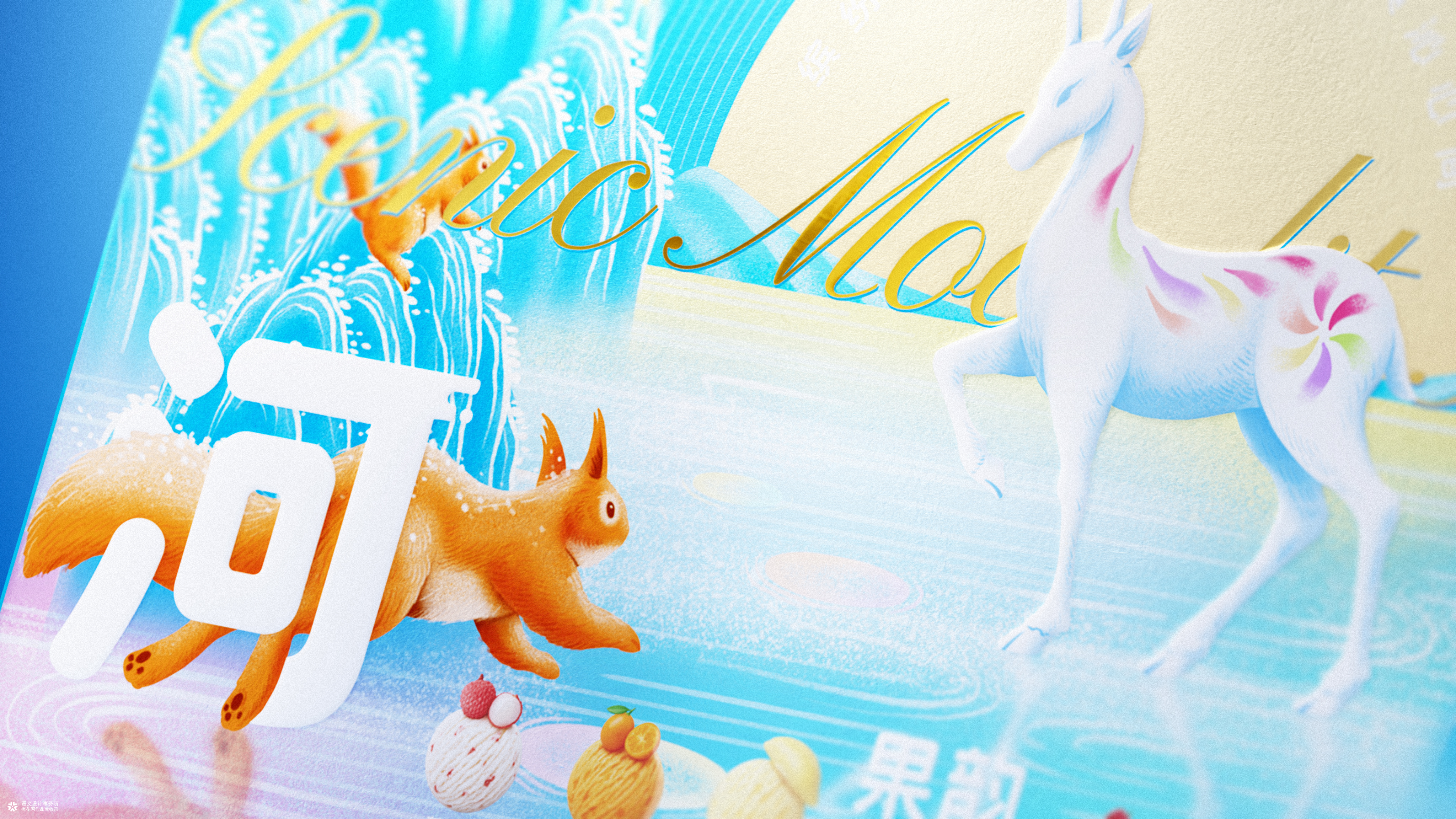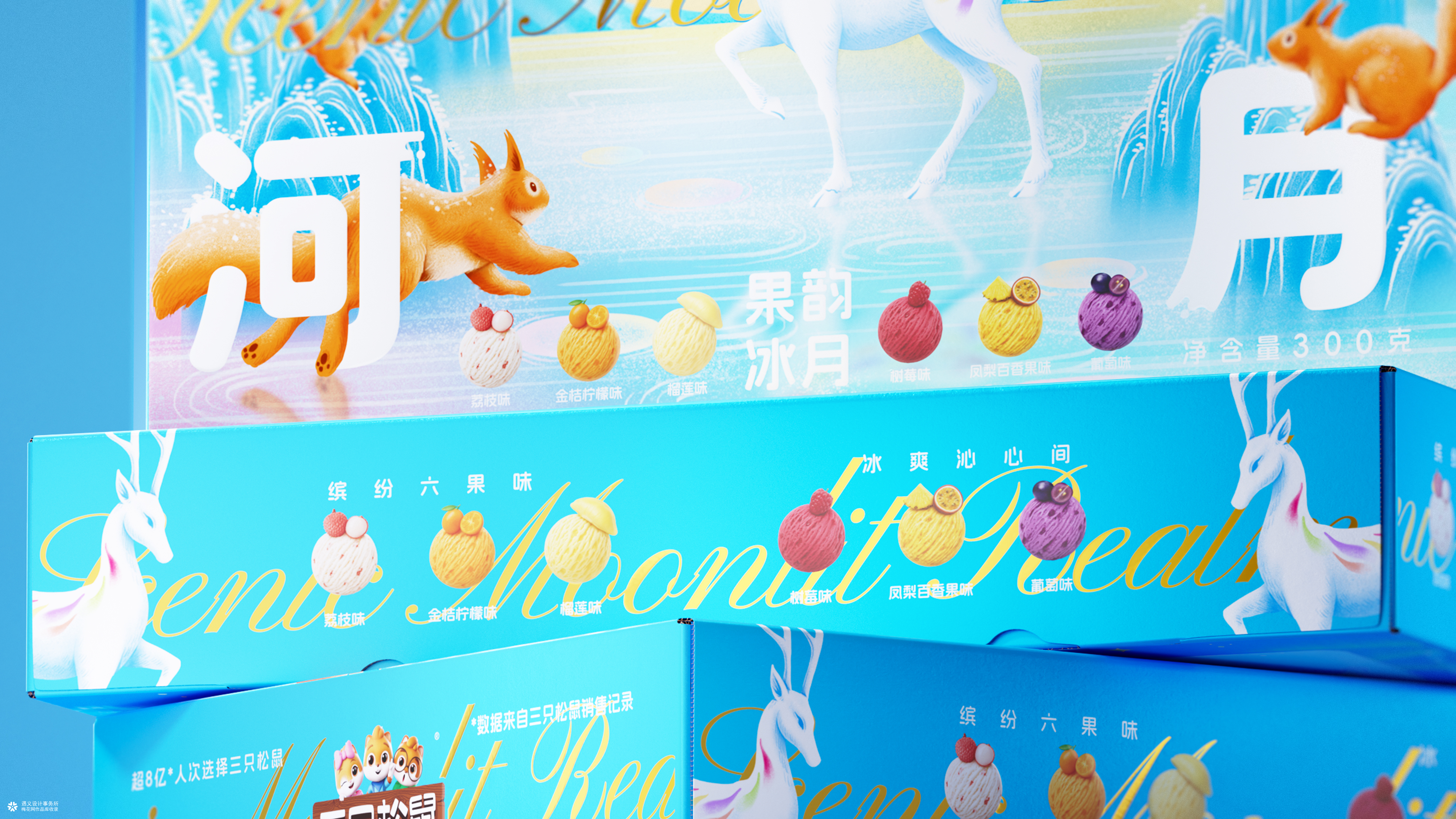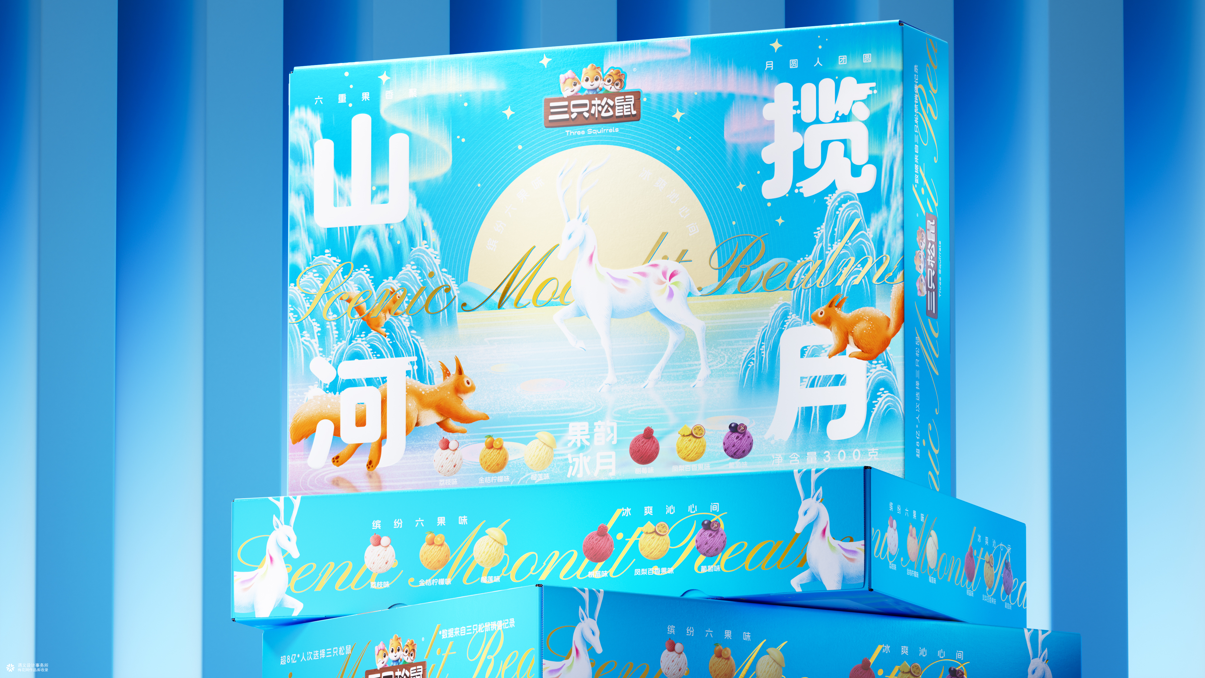 冰淇淋月饼的属性生发出来的视觉和文化语境,把我们带入冰雪世界。敦煌壁画里,九色鹿常被视作祥瑞之兽,它出现的地方,总能带来庇佑与安宁。浅蓝的纯净映衬圆月,在极境的静谧里,白鹿揽月入怀,为冷冽的世界带来守护与安宁。 转化为视觉层次的果味色彩融入鹿身,让冰雪背景更生动,冷中有暖,静中见光。中式山水点缀其间,把幻境和人间烟火轻轻相连,它寄托的,是纯净长久的愿望,也是祥瑞守护的心意:愿团圆如月,安宁常在。祥瑞、守护、纯净——这是松鼠文化宇宙里的“守望与庇佑”。 创作信息 作品名称:三只松鼠 山河揽月果韵冰月 月饼礼盒 品牌持有:三只松鼠 股份有限公司 包装设计:遇义设计事务所 Lascaux Design Firm 品 牌 方:鼠 瑰琦 原创设计:陈 义文 许 英达 谷 振 视觉表现:董 天 干 丁哲 项目推广:吕 宇星 王 钰