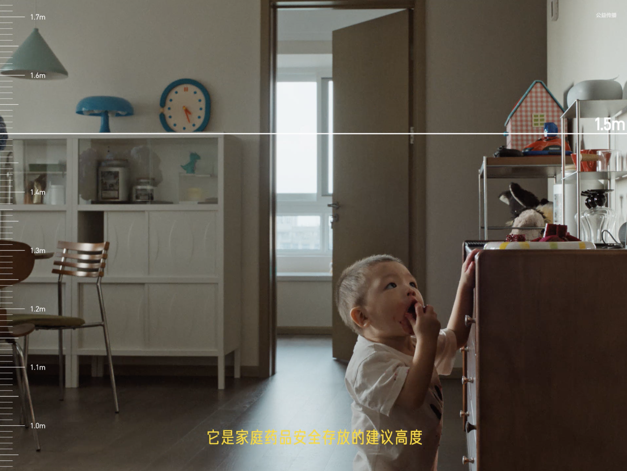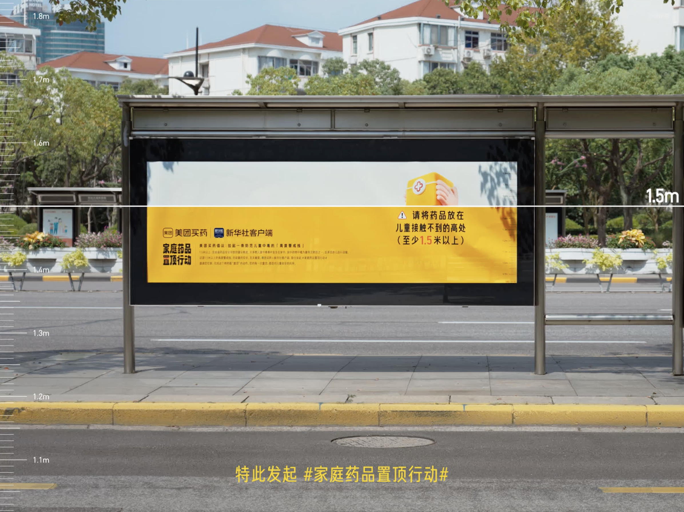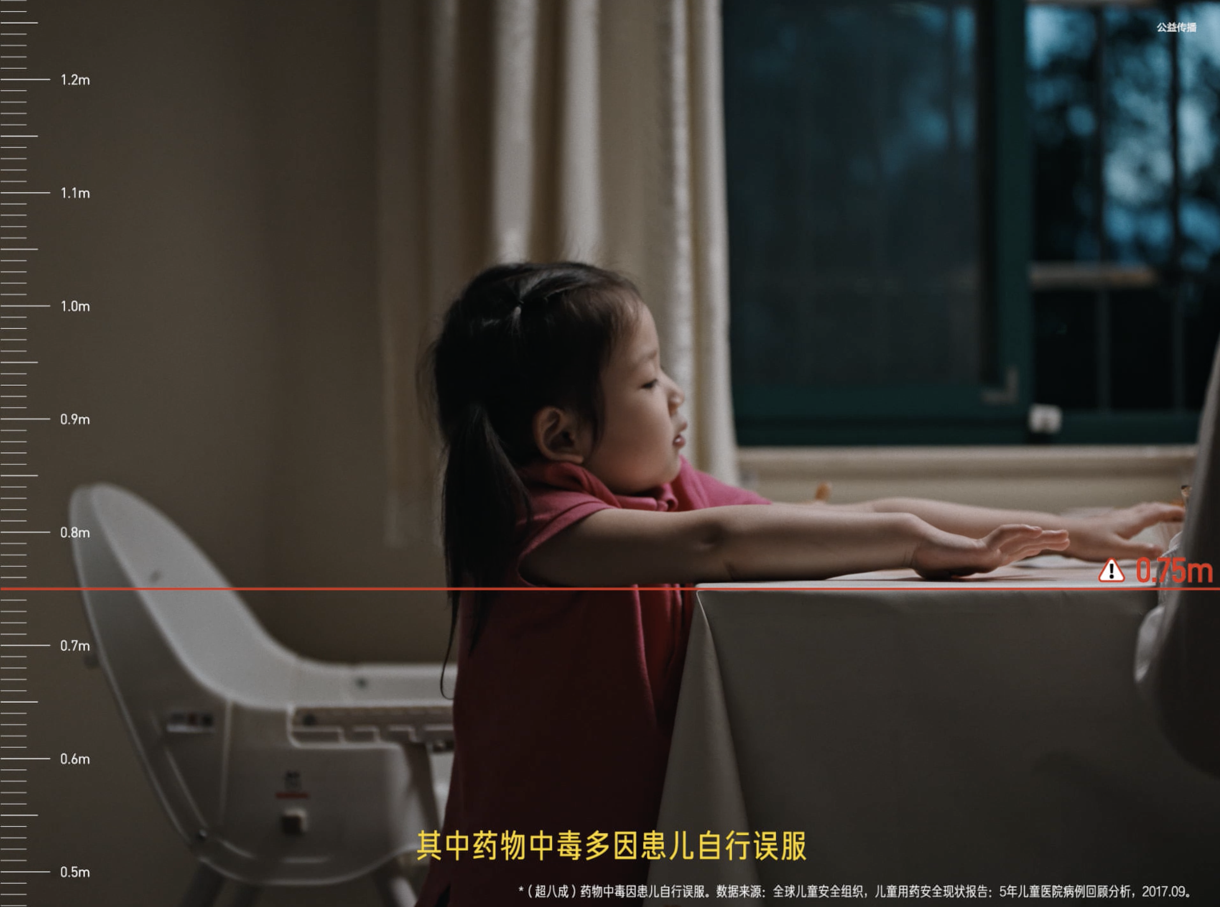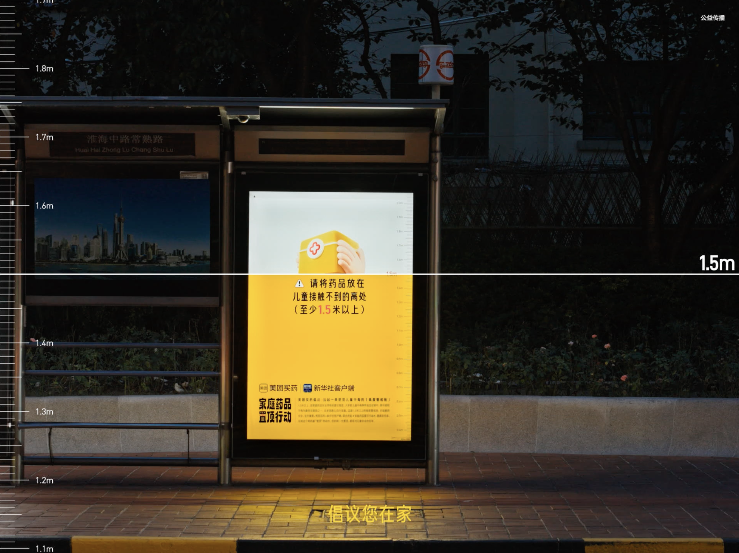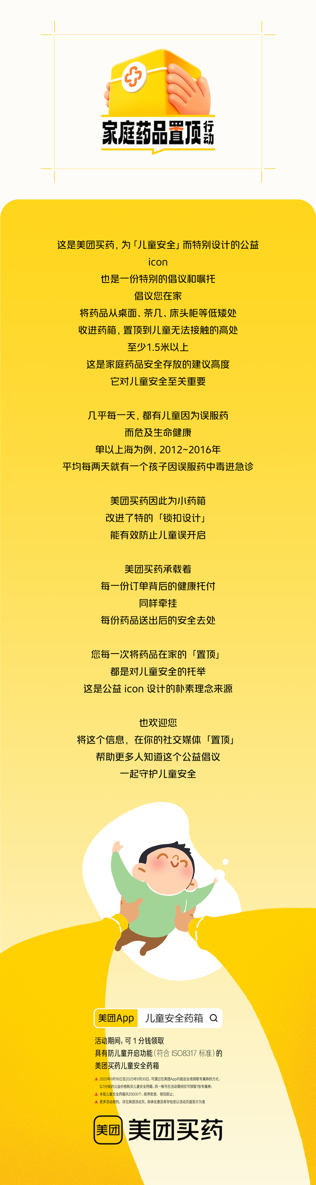 这是一个倡议大家为了儿童安全的「置顶」行动,也是一条希望大家能够帮忙置顶的公益广告。 从美团买药的公益brief说起:大多数儿童中毒事件,发生在家中,其中药物中毒多因患儿自行误服。应对儿童误服药,需要更多药品换用儿童安全包装,也需要家⻓建立安全意识,将药品放在离孩子的地方。希望通过一场公益传播,让大家提升关乎儿童安全的药品存放意识,减少此类事件发生。 我们在创意发想的时候,反而将引发儿童在家误服药的客观原因,作为突破口:大多数儿童中毒事件,发生在家中,那些停留在桌面、床头柜等低矮处的药品,很容易导致患儿自行误服。以上海为例,2012~2016 年,平均每两天就有一个孩子因误服药中毒进急诊。 运用品牌小药箱资产,我们发起了一个公益倡议,希望大家将停留在低矮处的药品收进药箱,并且「置顶」到儿童接触不到的高处。 这个公益icon的设计,带点仰视的视角,做出动作示范和置顶感的同时,希望您置顶药箱的动作,就像双手托举起家里的小不点儿一样。 我们查阅了很多关于用药安全的文章,发现儿童安全机构和专家,对于药品存放的建议“必须存放在儿童无法触及的高处”后面,都有一个括号(建议1.5米以上)。我们给所有广告牌,加了把尺子,把1.5米的刻度标红。并且保证每个广告点位,上面的1.5米刻度线距离地面都做到现实层面的1米5。变成可实际测量的一次互动。 感谢这个项目背后辛苦付出,并肩努力的每一位。让我们继续传递善意,也成为善意。