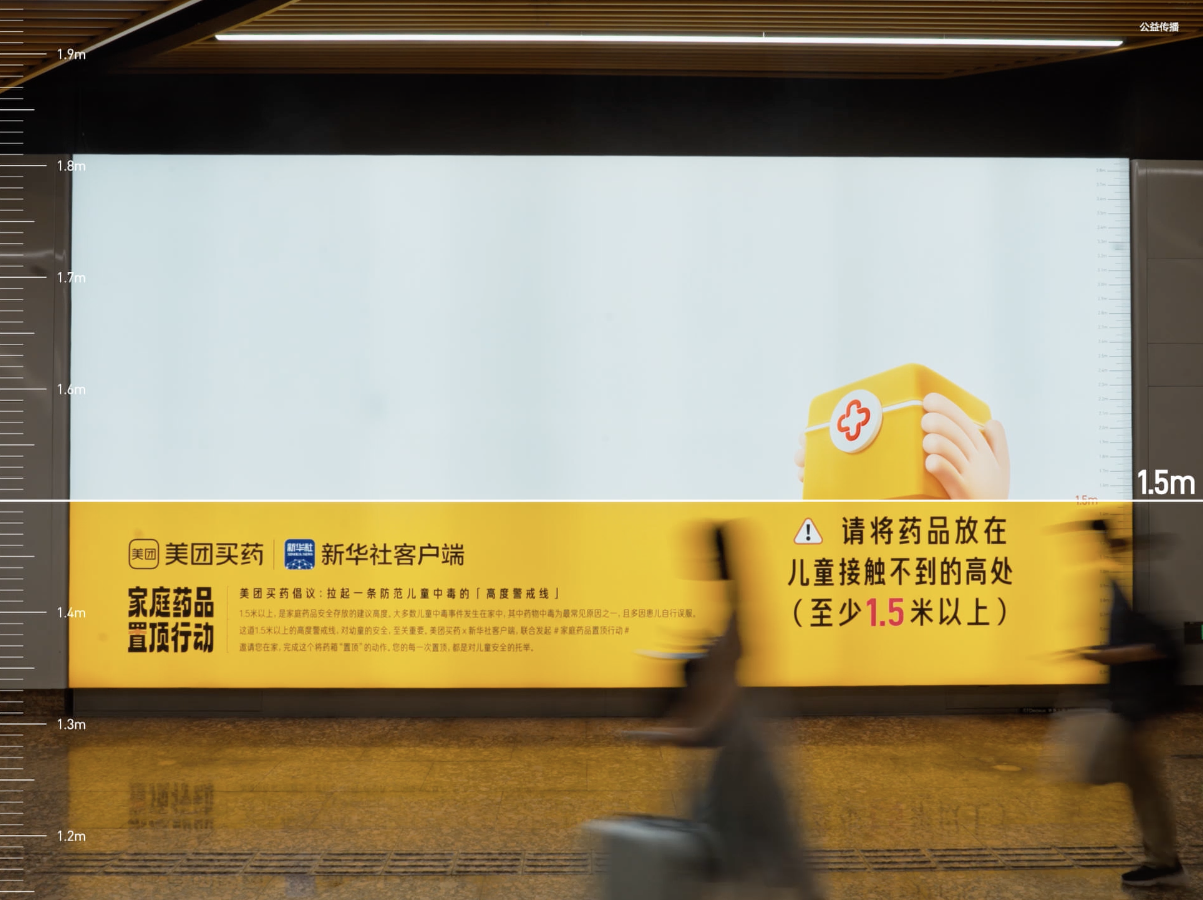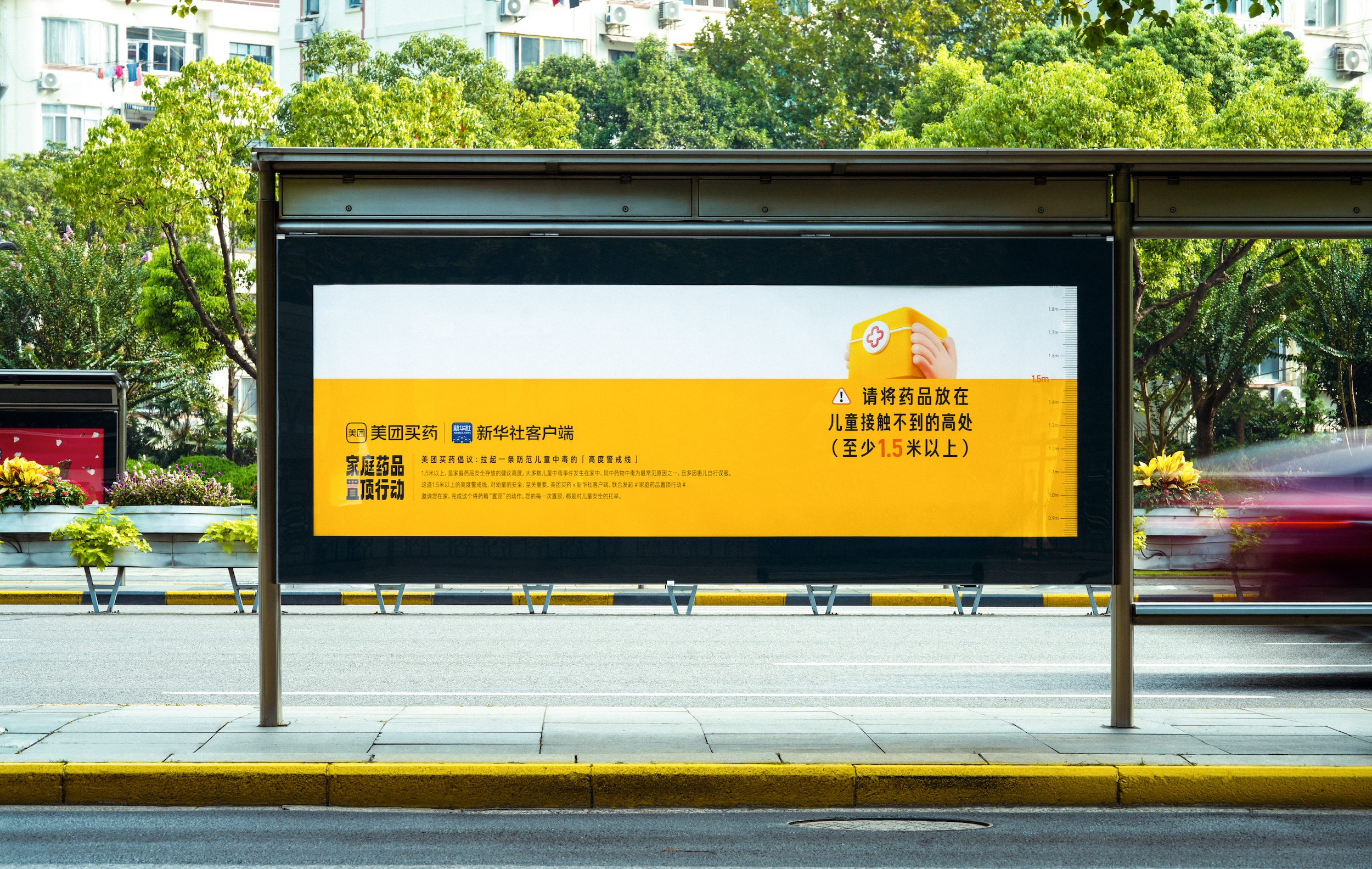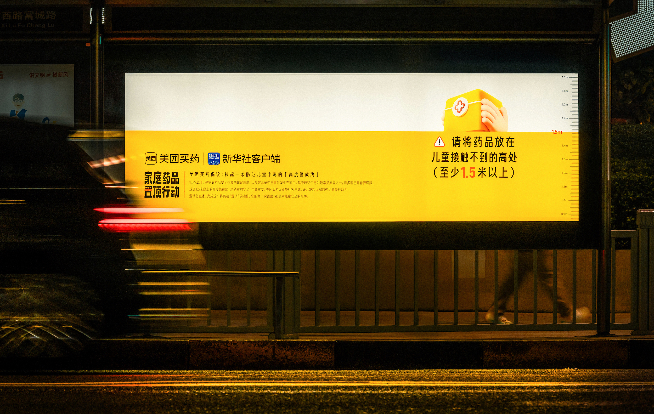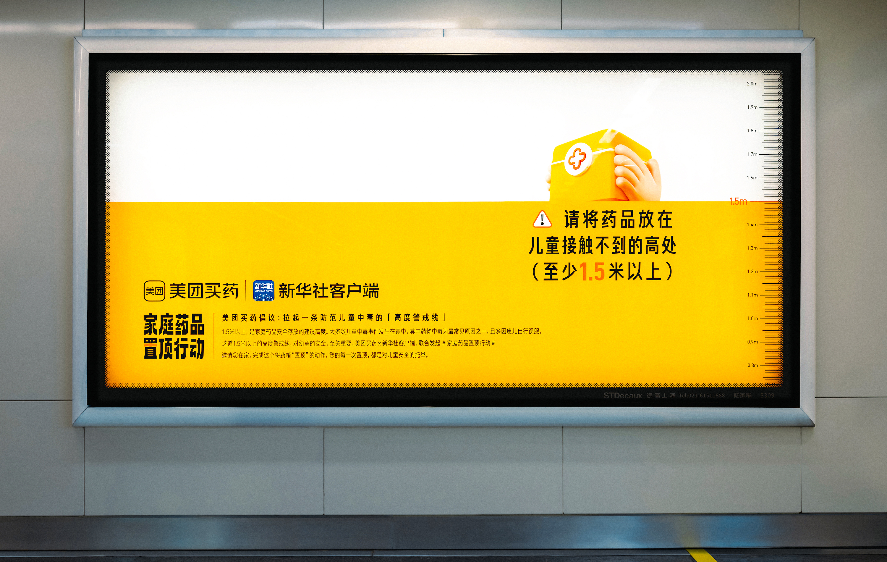 这是一个倡议大家为了儿童安全的「置顶」行动,也是一条希望大家能够帮忙置顶的公益广告。 从美团买药的公益brief说起:大多数儿童中毒事件,发生在家中,其中药物中毒多因患儿自行误服。应对儿童误服药,需要更多药品换用儿童安全包装,也需要家⻓建立安全意识,将药品放在离孩子的地方。希望通过一场公益传播,让大家提升关乎儿童安全的药品存放意识,减少此类事件发生。 我们在创意发想的时候,反而将引发儿童在家误服药的客观原因,作为突破口:大多数儿童中毒事件,发生在家中,那些停留在桌面、床头柜等低矮处的药品,很容易导致患儿自行误服。以上海为例,2012~2016 年,平均每两天就有一个孩子因误服药中毒进急诊。 运用品牌小药箱资产,我们发起了一个公益倡议,希望大家将停留在低矮处的药品收进药箱,并且「置顶」到儿童接触不到的高处。 这个公益icon的设计,带点仰视的视角,做出动作示范和置顶感的同时,希望您置顶药箱的动作,就像双手托举起家里的小不点儿一样。 我们查阅了很多关于用药安全的文章,发现儿童安全机构和专家,对于药品存放的建议“必须存放在儿童无法触及的高处”后面,都有一个括号(建议1.5米以上)。我们给所有广告牌,加了把尺子,把1.5米的刻度标红。并且保证每个广告点位,上面的1.5米刻度线距离地面都做到现实层面的1米5。变成可实际测量的一次互动。 感谢这个项目背后辛苦付出,并肩努力的每一位。让我们继续传递善意,也成为善意。