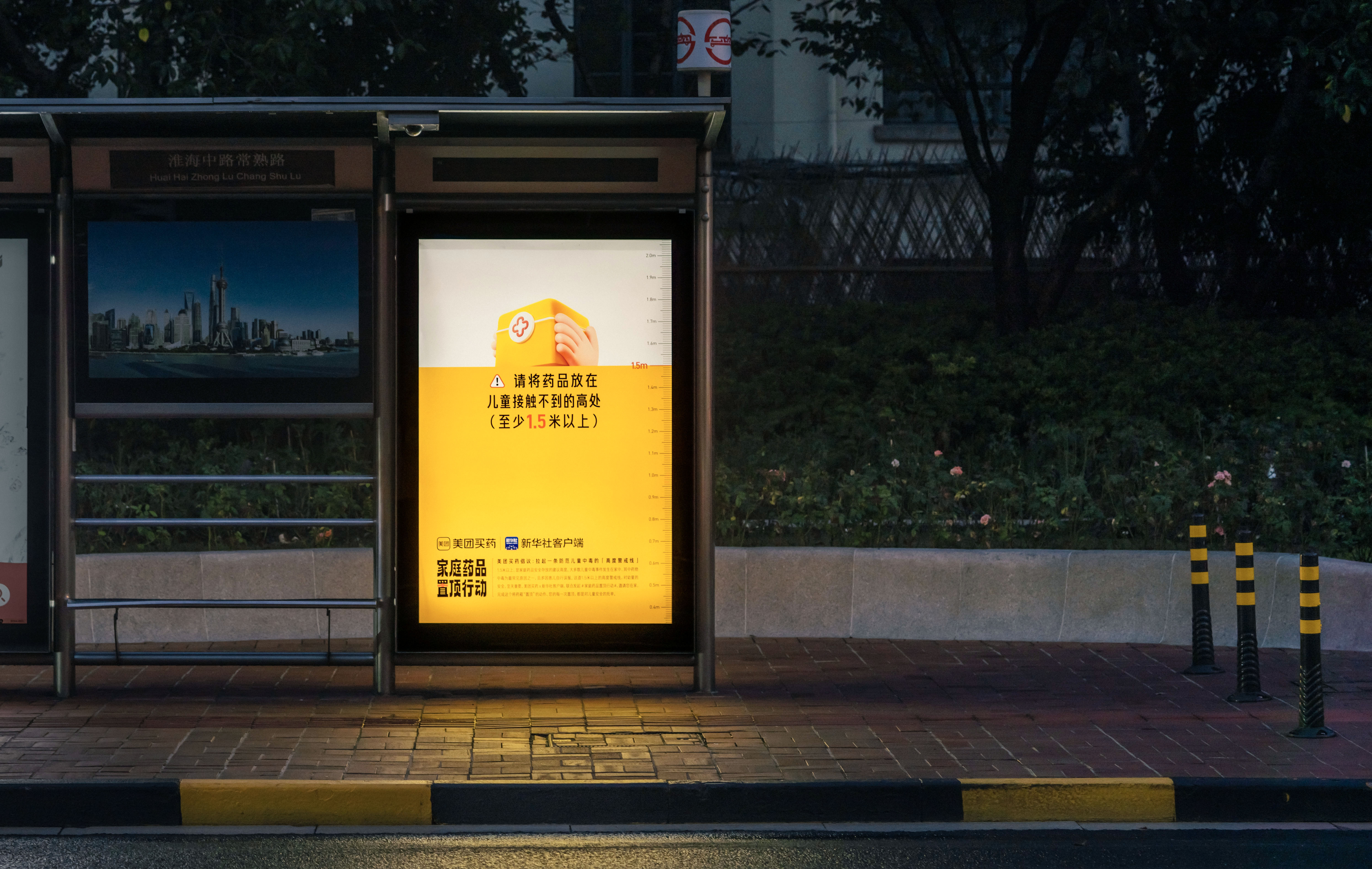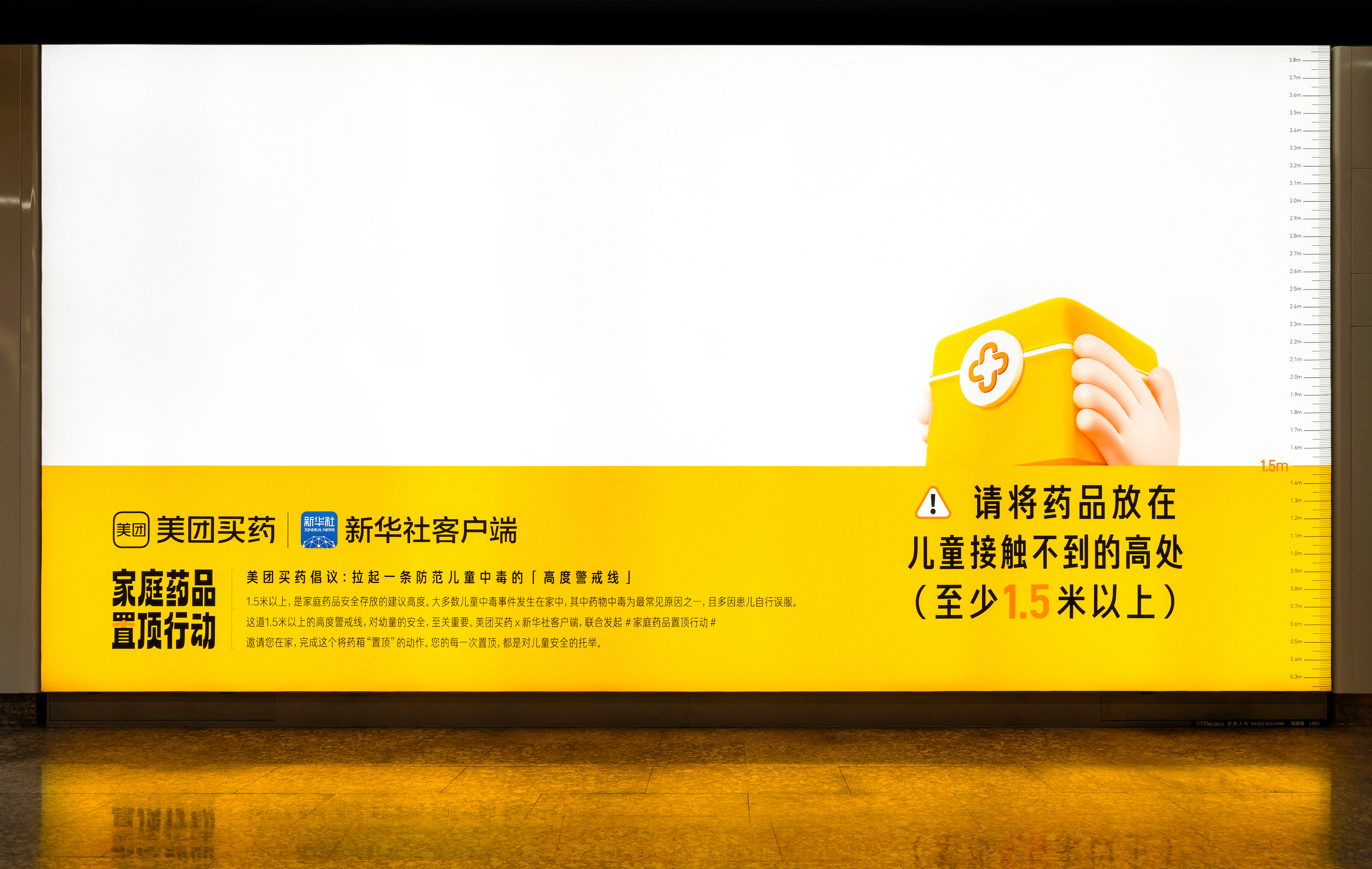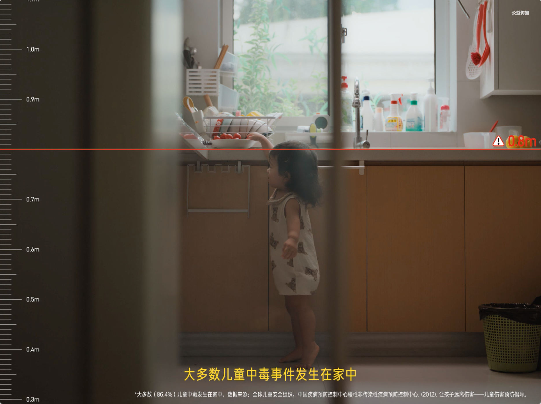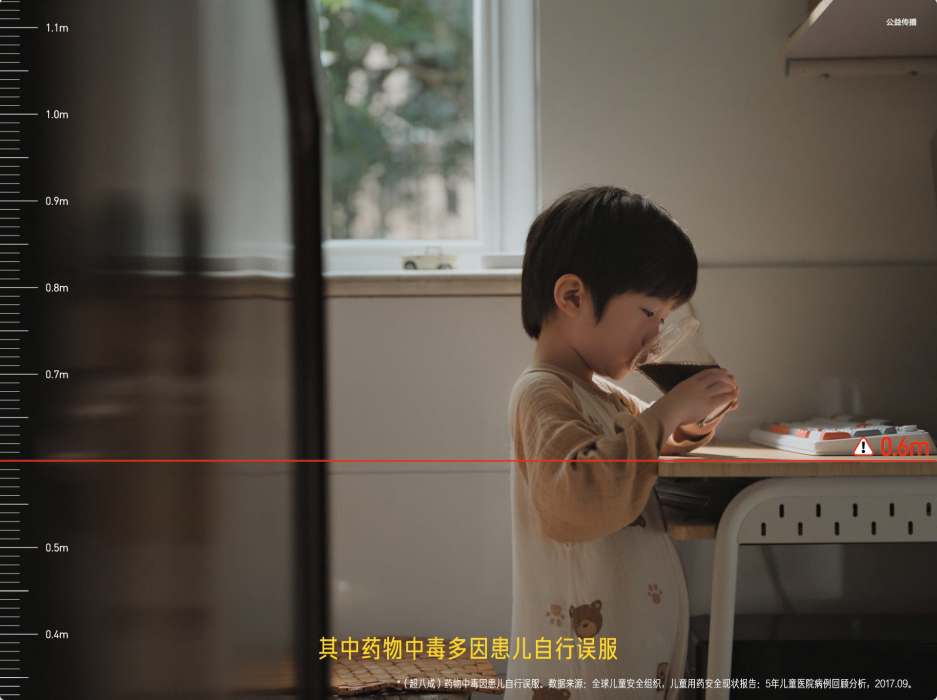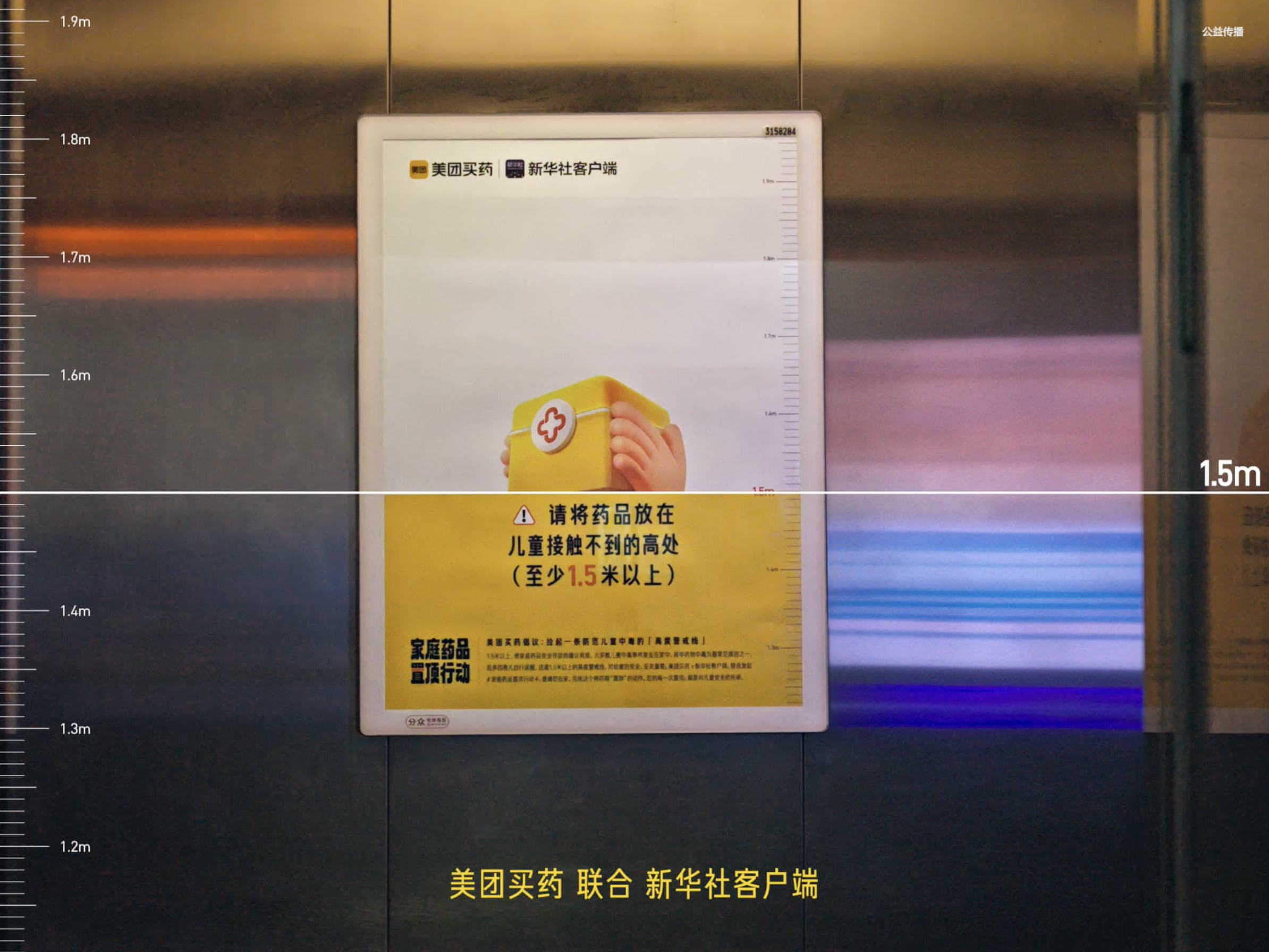 这是一个倡议大家为了儿童安全的「置顶」行动,也是一条希望大家能够帮忙置顶的公益广告。 从美团买药的公益brief说起:大多数儿童中毒事件,发生在家中,其中药物中毒多因患儿自行误服。应对儿童误服药,需要更多药品换用儿童安全包装,也需要家⻓建立安全意识,将药品放在离孩子的地方。希望通过一场公益传播,让大家提升关乎儿童安全的药品存放意识,减少此类事件发生。 我们在创意发想的时候,反而将引发儿童在家误服药的客观原因,作为突破口:大多数儿童中毒事件,发生在家中,那些停留在桌面、床头柜等低矮处的药品,很容易导致患儿自行误服。以上海为例,2012~2016 年,平均每两天就有一个孩子因误服药中毒进急诊。 运用品牌小药箱资产,我们发起了一个公益倡议,希望大家将停留在低矮处的药品收进药箱,并且「置顶」到儿童接触不到的高处。 这个公益icon的设计,带点仰视的视角,做出动作示范和置顶感的同时,希望您置顶药箱的动作,就像双手托举起家里的小不点儿一样。 我们查阅了很多关于用药安全的文章,发现儿童安全机构和专家,对于药品存放的建议“必须存放在儿童无法触及的高处”后面,都有一个括号(建议1.5米以上)。我们给所有广告牌,加了把尺子,把1.5米的刻度标红。并且保证每个广告点位,上面的1.5米刻度线距离地面都做到现实层面的1米5。变成可实际测量的一次互动。 感谢这个项目背后辛苦付出,并肩努力的每一位。让我们继续传递善意,也成为善意。