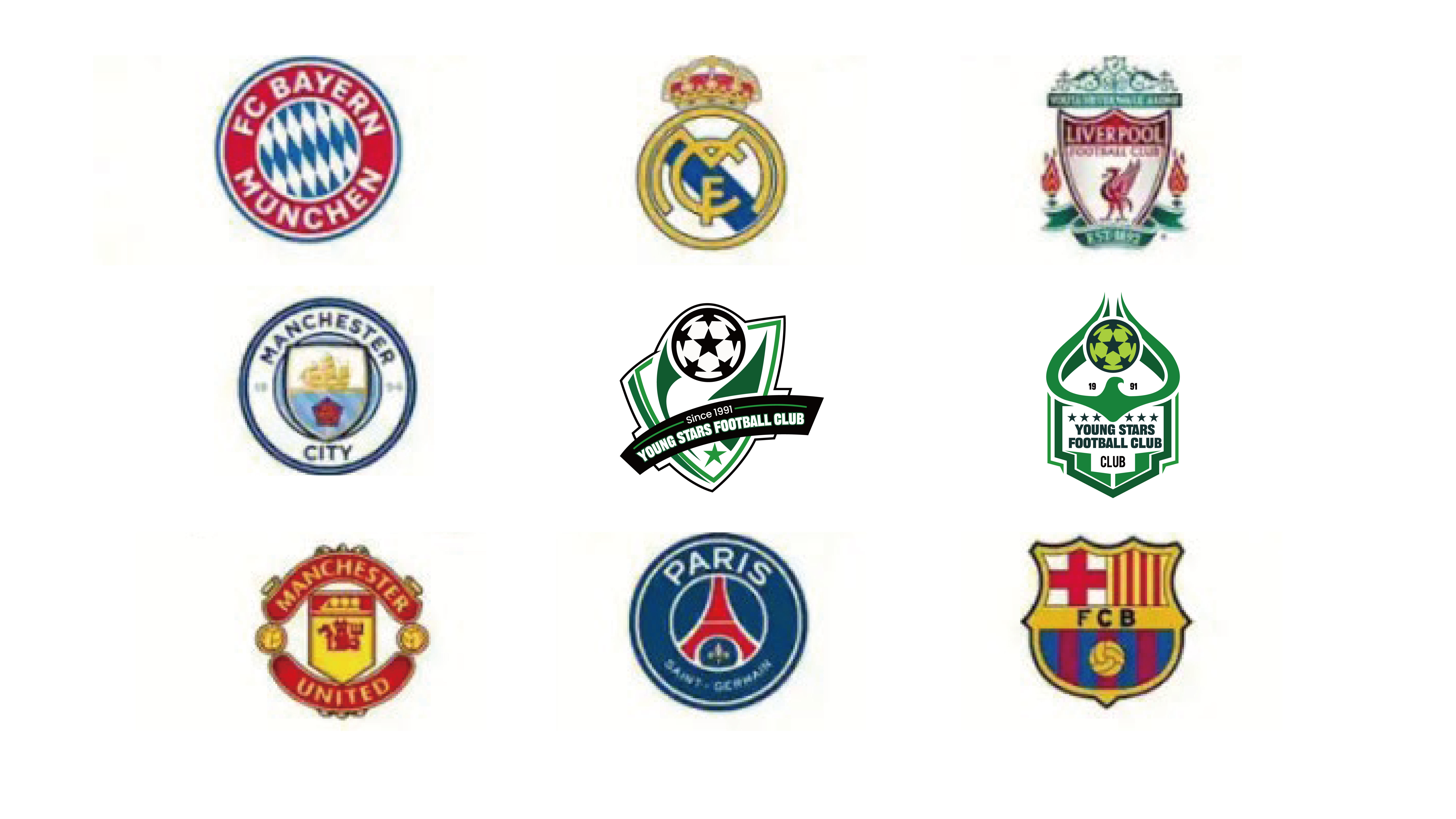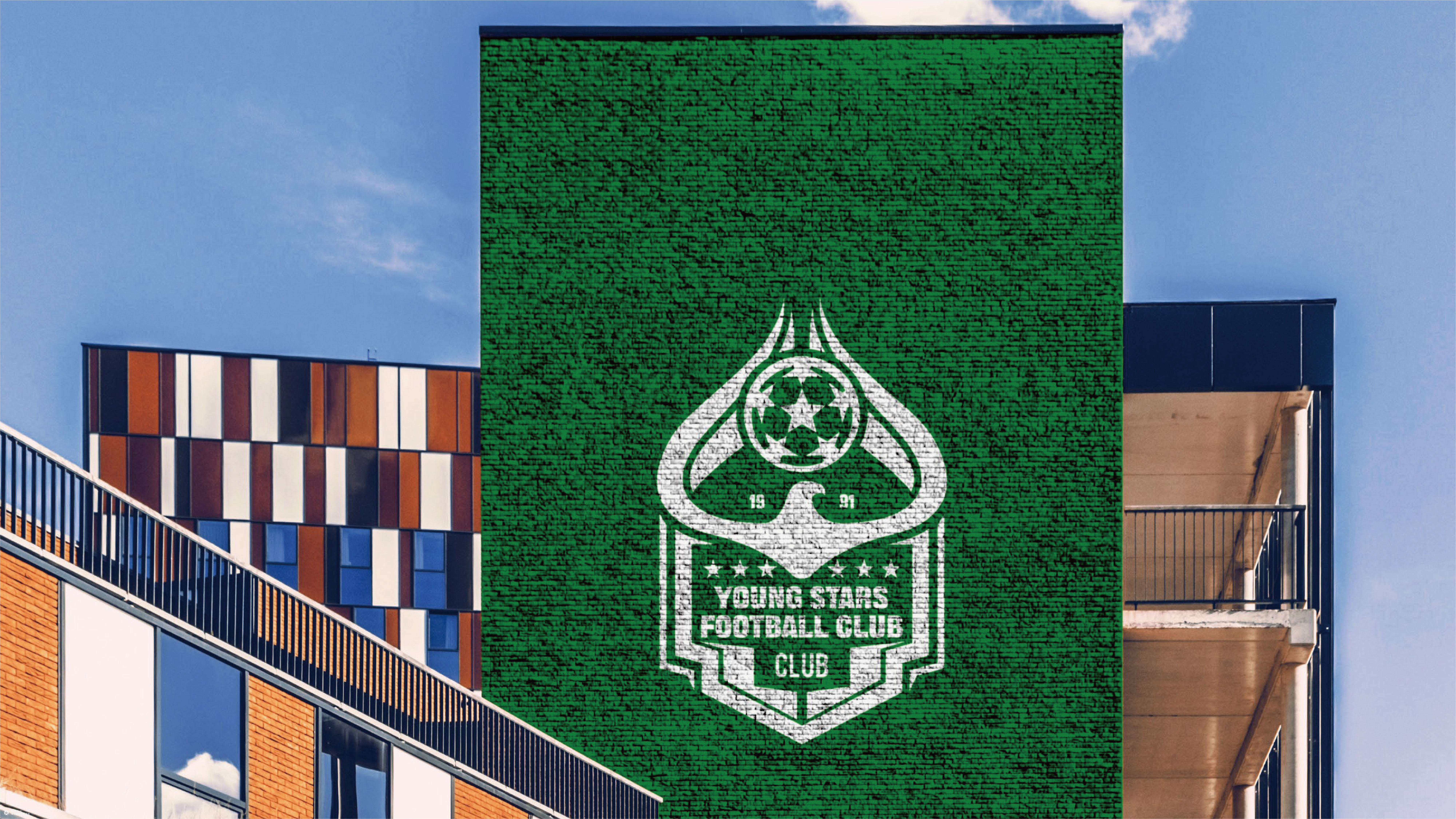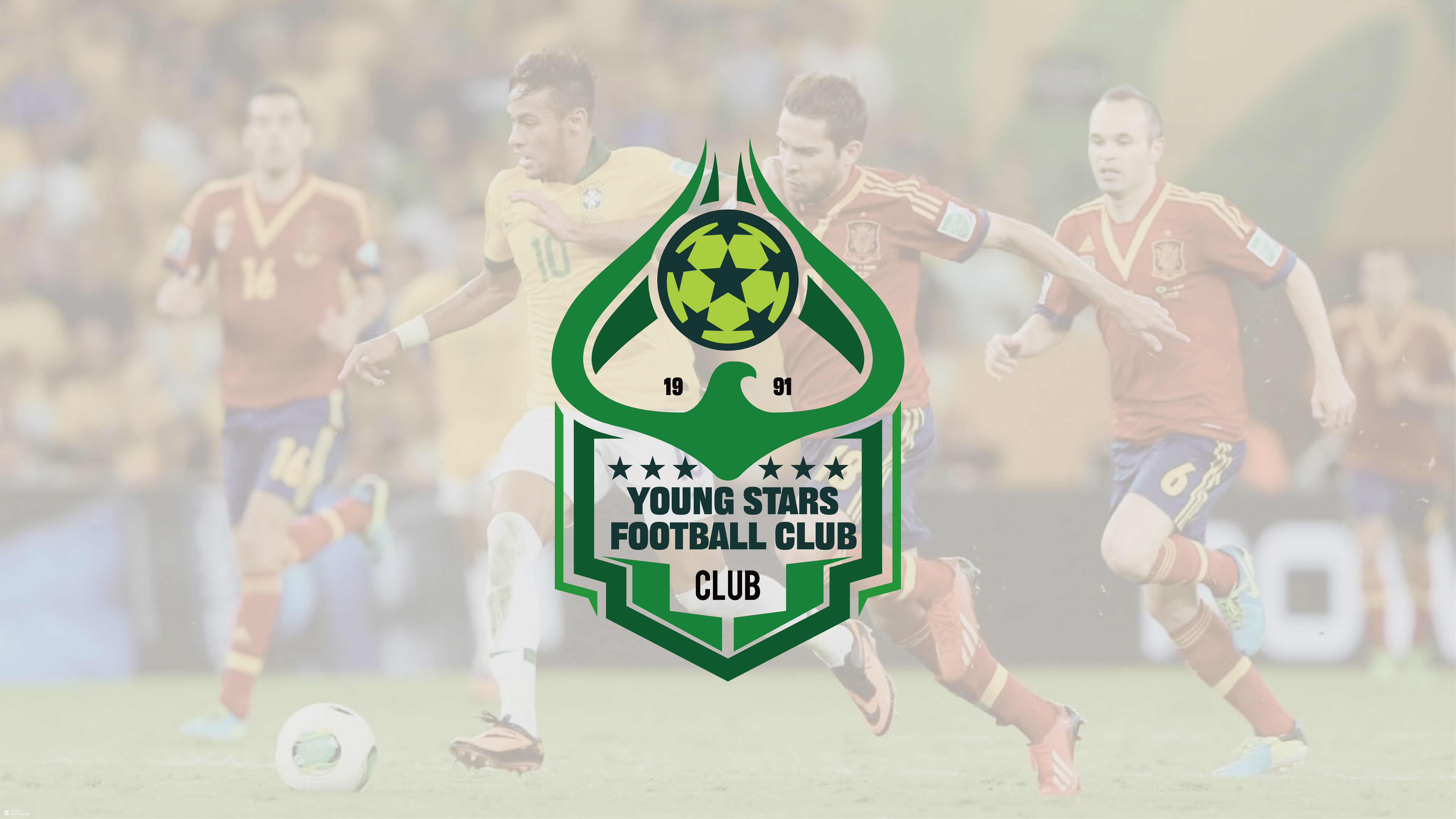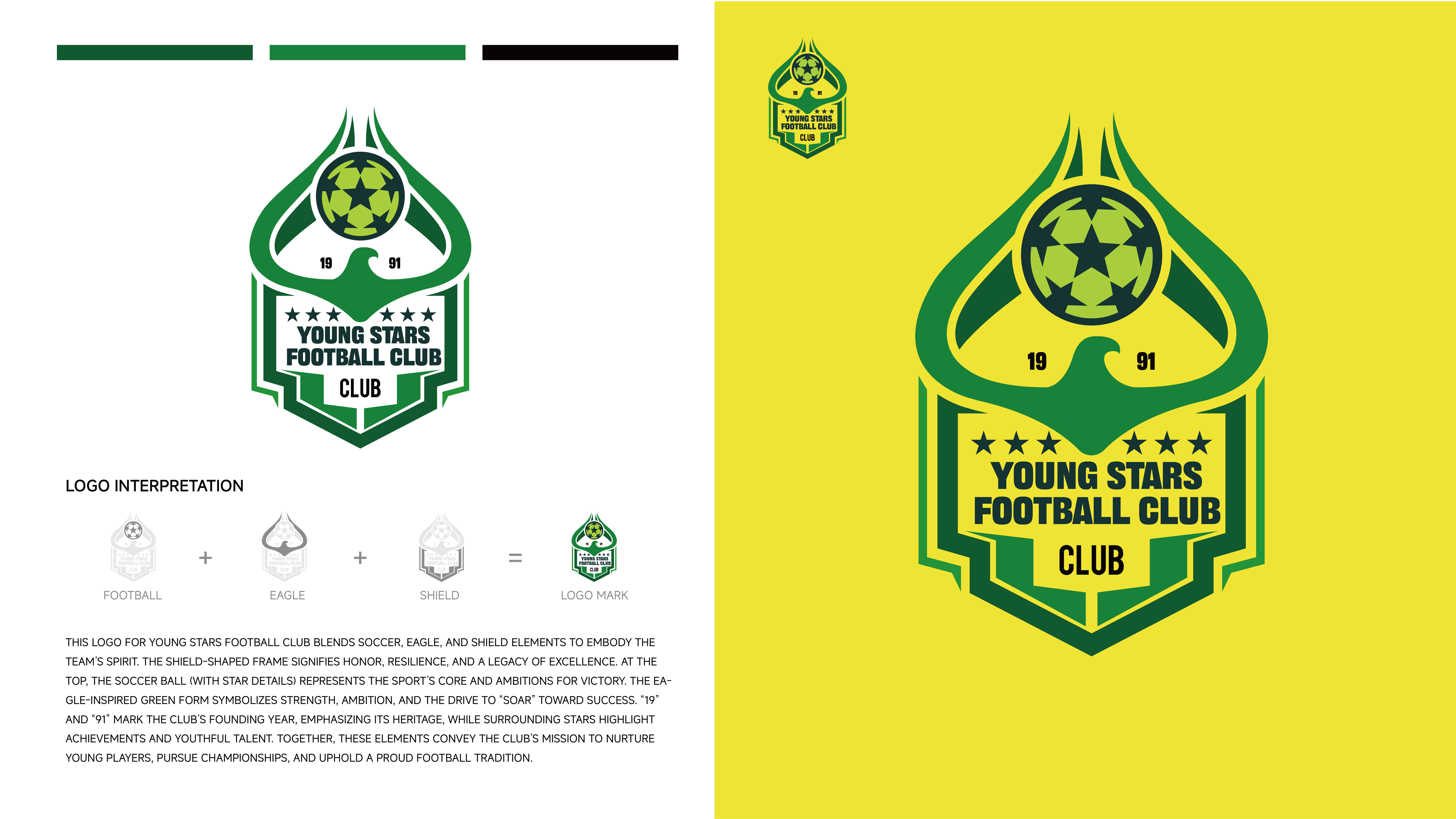 作品名称丨Young Stars Football Club 标志释义丨Logo 图形巧妙融合足球、鹰与盾牌三大元素。盾牌造型的外框,象征着荣誉、坚韧与卓越的传承,寓意俱乐部在足球征程中坚守品质、砥砺前行;顶部的足球(带有星形细节),代表足球运动的核心本质,也寄托着俱乐部对胜利的渴望与追求;以绿色呈现的鹰形元素,象征着力量、雄心,以及向着成功 “翱翔” 的动力,契合俱乐部培育年轻球员、助力他们在足球领域展翅高飞的愿景。“19” 与 “91” 字样,标注了俱乐部的成立年份,强调其历史底蕴;周围的星星则凸显了俱乐部的成就与年轻 talent(人才)的风采。 色彩丨采用绿色为主色调,绿色象征着生机与活力,契合年轻球员蓬勃的朝气与足球运动的生命力。搭配黑色与白色,黑色增添稳重感,白色则让整体视觉更显清晰明快,三者相互配合,既营造出强烈的视觉层次,又从不同维度诠释出俱乐部充满活力且专业严谨的品牌特质。