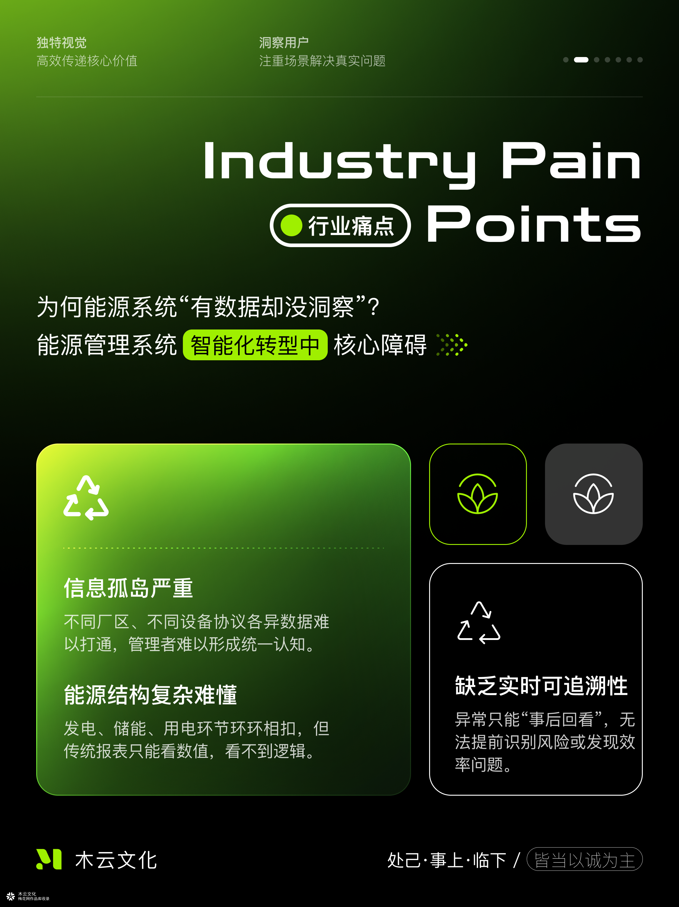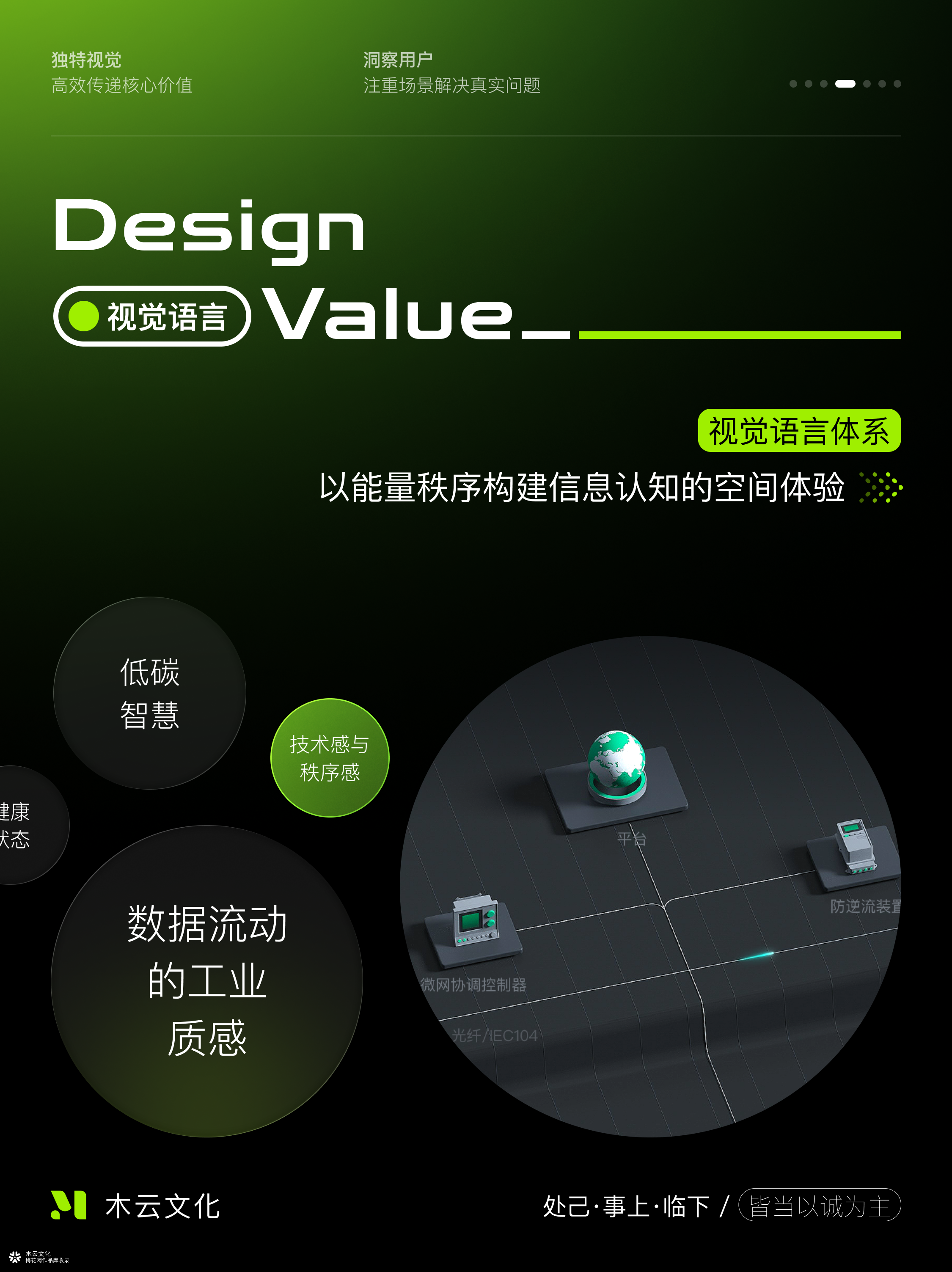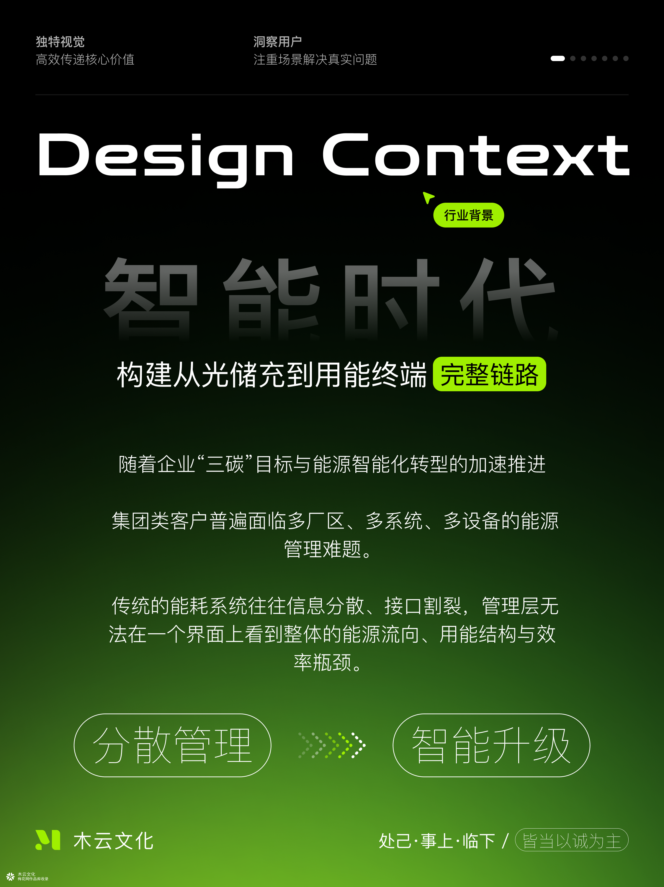 哈喽大家好,我是交互视觉设计师青云。 案例是我们近期做的一个智慧能源管理平台。 这几年,越来越多的企业在做能源智能化转型。 但很多时候,系统是分散的,设备协议又不统一。 各个环节都有数据,却没有一个地方能把这些数据“串”起来。 管理层看不到全局,工程师看不到趋势。 能量到底从哪来、流向哪去、效率损失在哪儿,没人能说清。 这其实是整个行业普遍的痛点。 在这样的背景下,我们的设计挑战就变成了: 怎么用一张图,把能源系统的“逻辑”讲清楚? 既能展示设备关系,又不让人被复杂的线路吓到。 同时,还要满足不同角色的使用需求—— 领导看的是结果,运维看的是细节。 于是我们提出了一个策略: 让界面从“显示数据”,变成“讲述系统”。 我们把光伏、储能、充电、用电这些模块全部可视化, 做成一个动态的能量拓扑。 每个节点代表设备,线条表示数据与能量流向, 再结合实时指标和趋势图,就能一眼看出哪块状态异常。 视觉上,我们用暗色空间作为底, 用发光节点和细线去模拟能量流动。 这样做,一方面呈现一种科技感,另一方面也更容易聚焦重点。 而且整套界面的信息密度被严格控制, 看起来干净、有层次,不会眼花。 对企业来说,这样的平台能真正让能源“看得见”。 能看全局、能看趋势、能看问题。 不再是堆数据的报表,而是能辅助决策的系统。 当一个企业能“看懂自己”, 那一刻,你就会觉得:设计真的在创造价值。