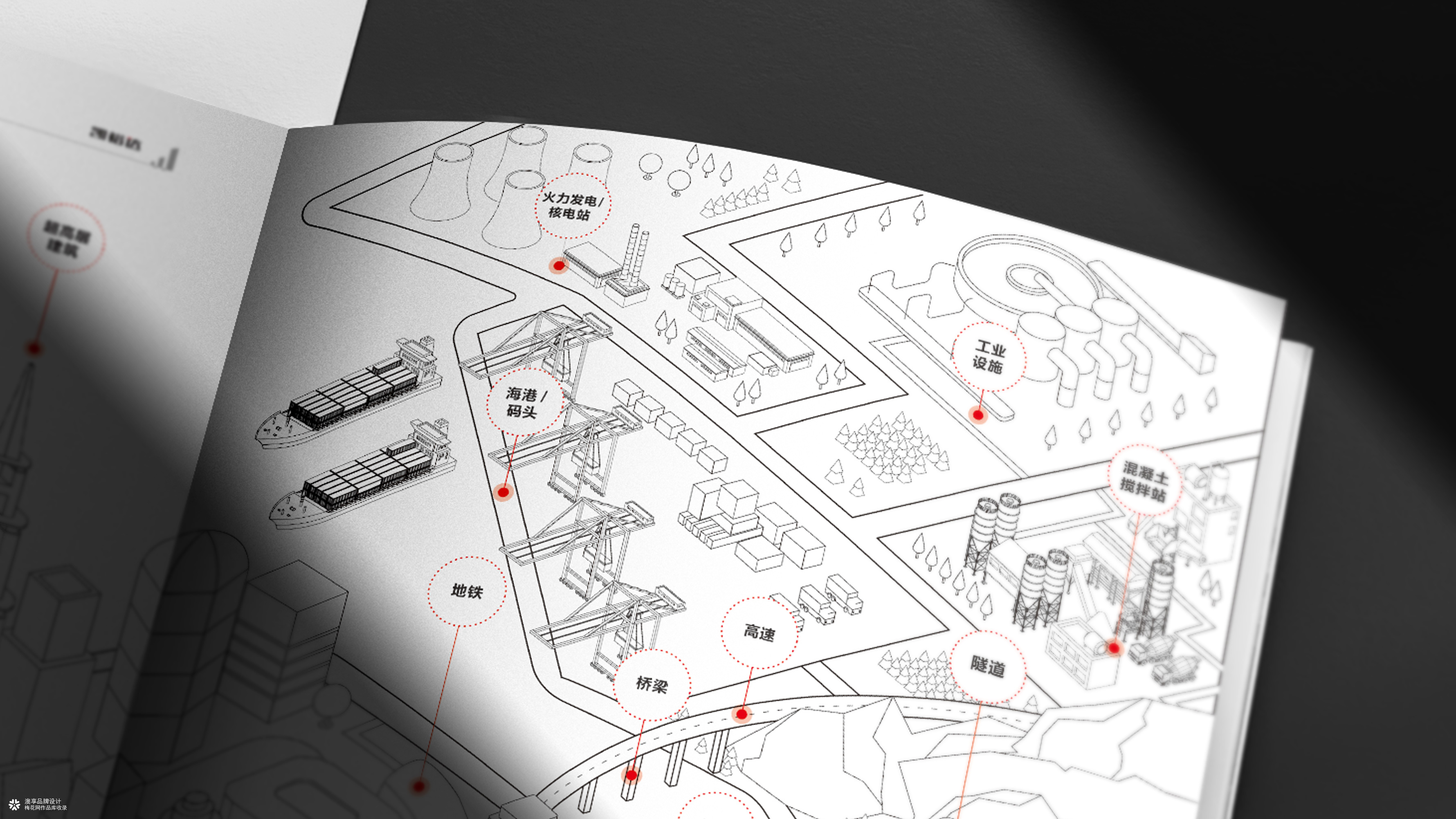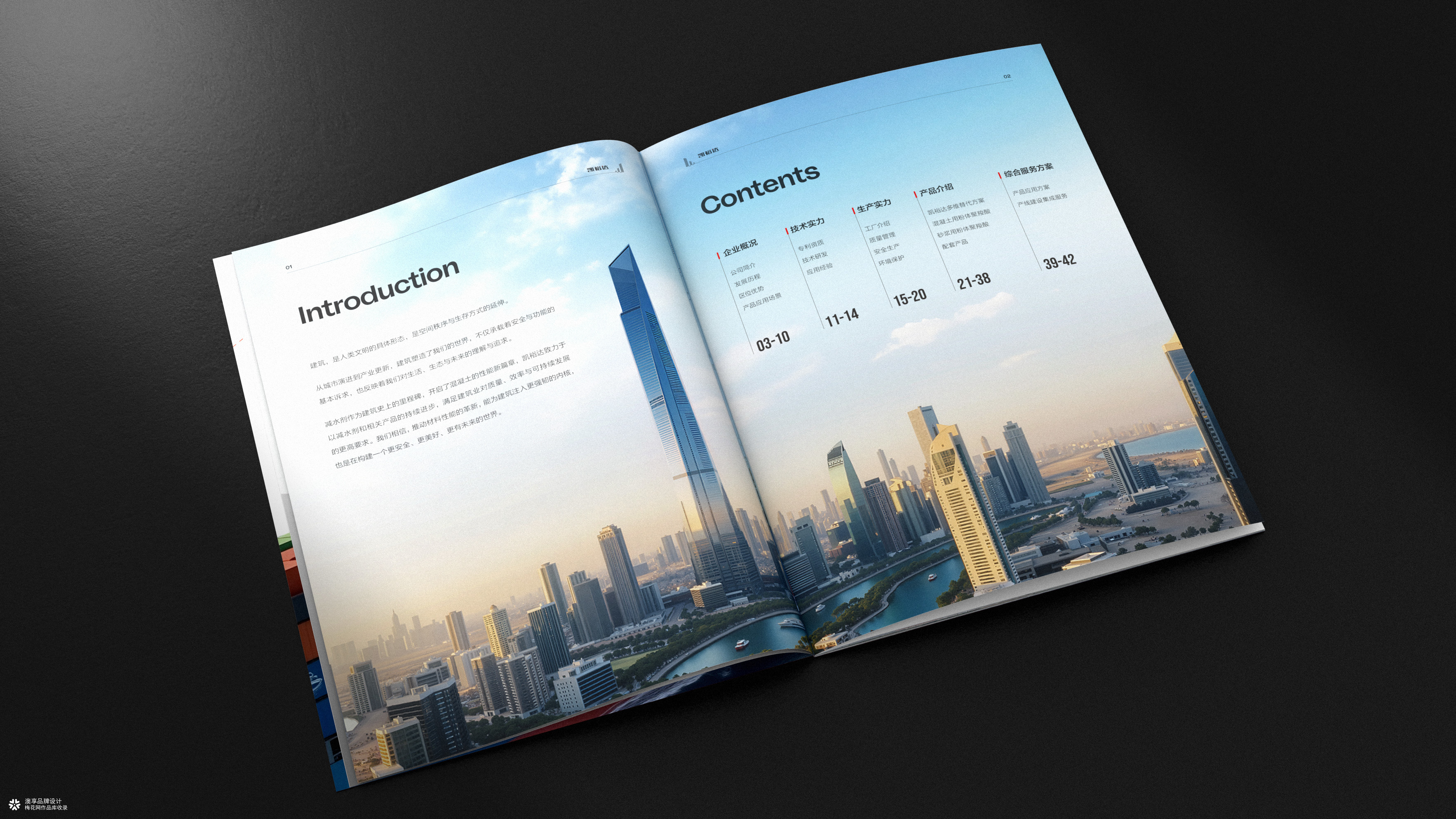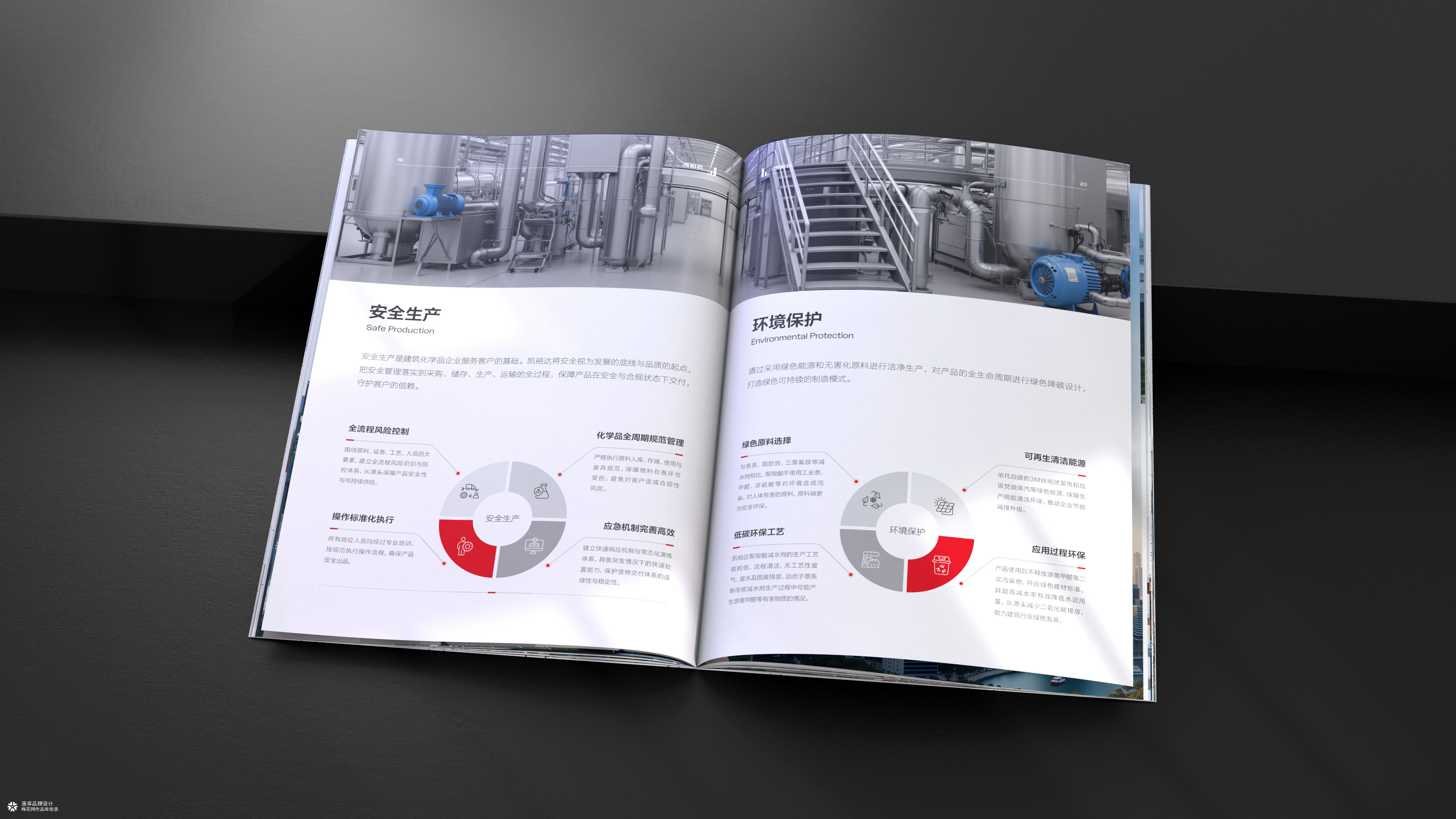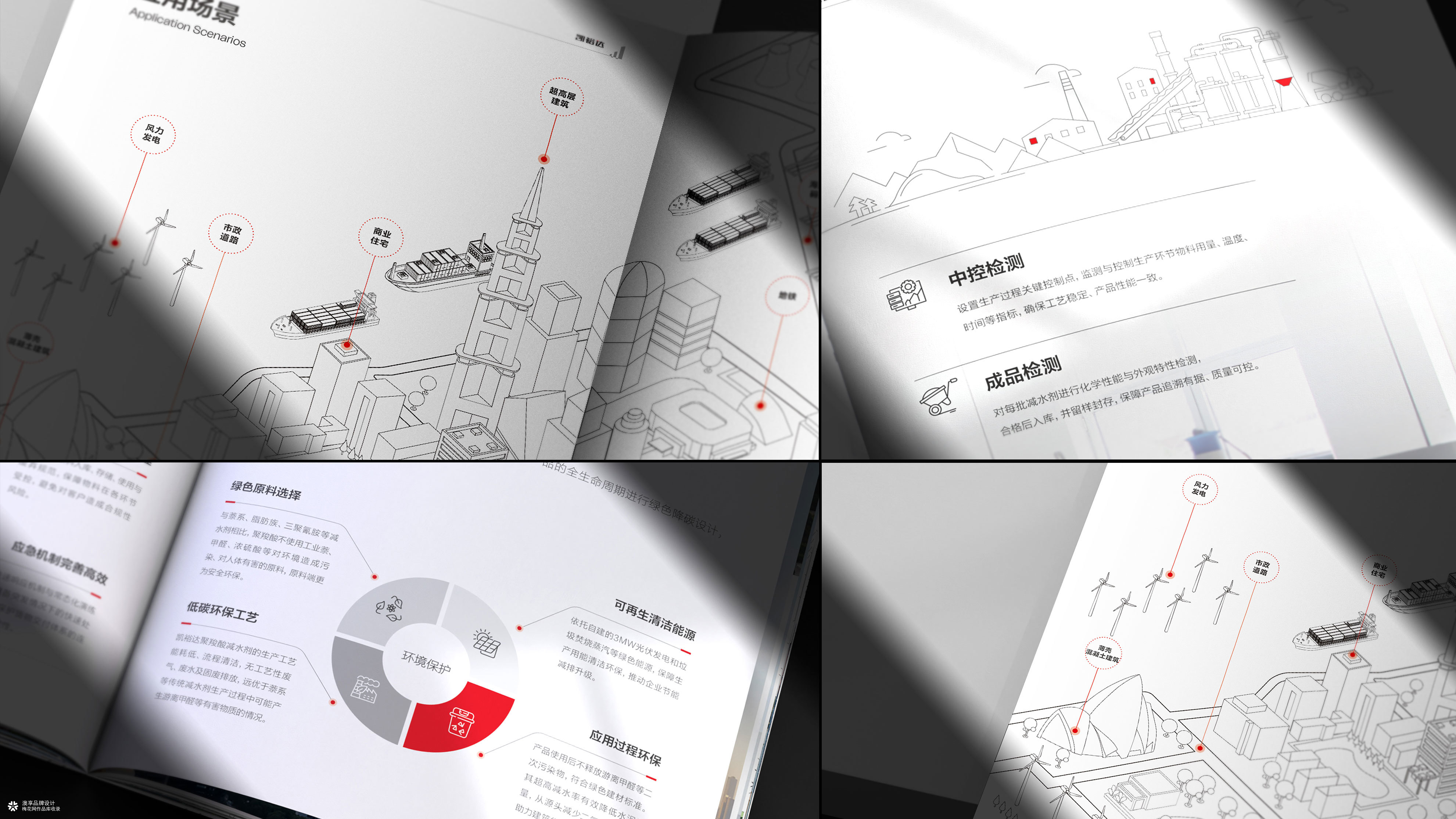 一、封面采用简洁的几何切面造型,通过利落的线条,展现出产品所属领域的严谨性与技术属性,同时搭配浅灰色与白色的基底,更具现代感与视觉层次,传递出企业在相关领域追求精准、高效的理念。 二、内页采用跨页的城市建筑景观图,展现出大气、开阔的视觉效果,文字排版简洁明了,便于读者快速获取企业相关介绍信息,体现出画册内容的条理性。以时间轴形式搭配红色节点标识梳理发展历程,增强视觉引导; 三、可视化+场景化: 1、地图 + 实景图将区位地图 + 实景图将区位,使物流优势具象化,分栏资质专利以 “数据 + 解读” 构建信任,降低技术信息传播门槛,适配多元受众。 2、以黑白灰线稿城市图结合红色标注,直观呈现多领域应用场景;通过圆形图示展示安全生产环节,以实验室实景图凸显质量管控的重视与投入,全方位传递企业与产品的专业形象、优势及理念。