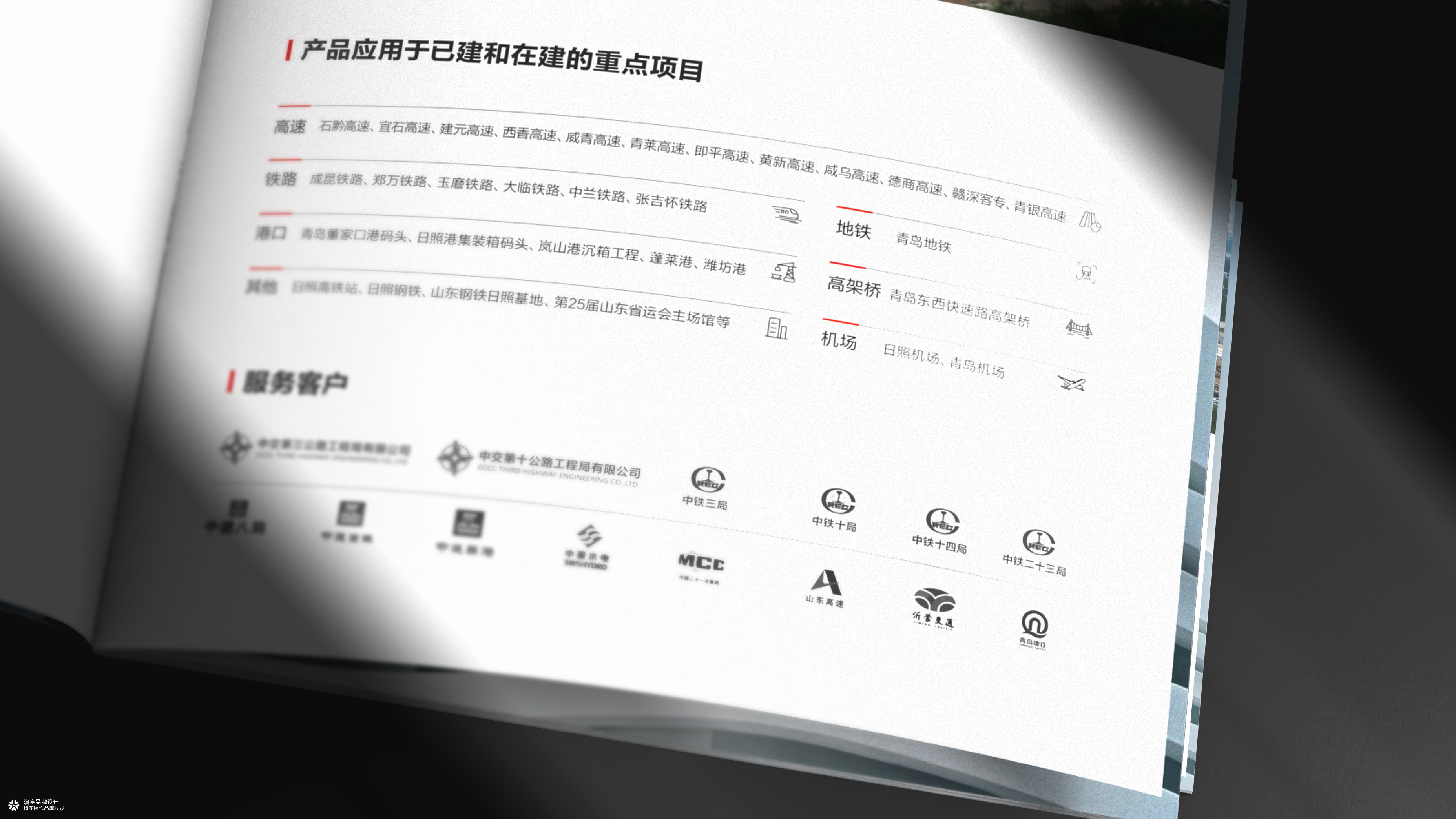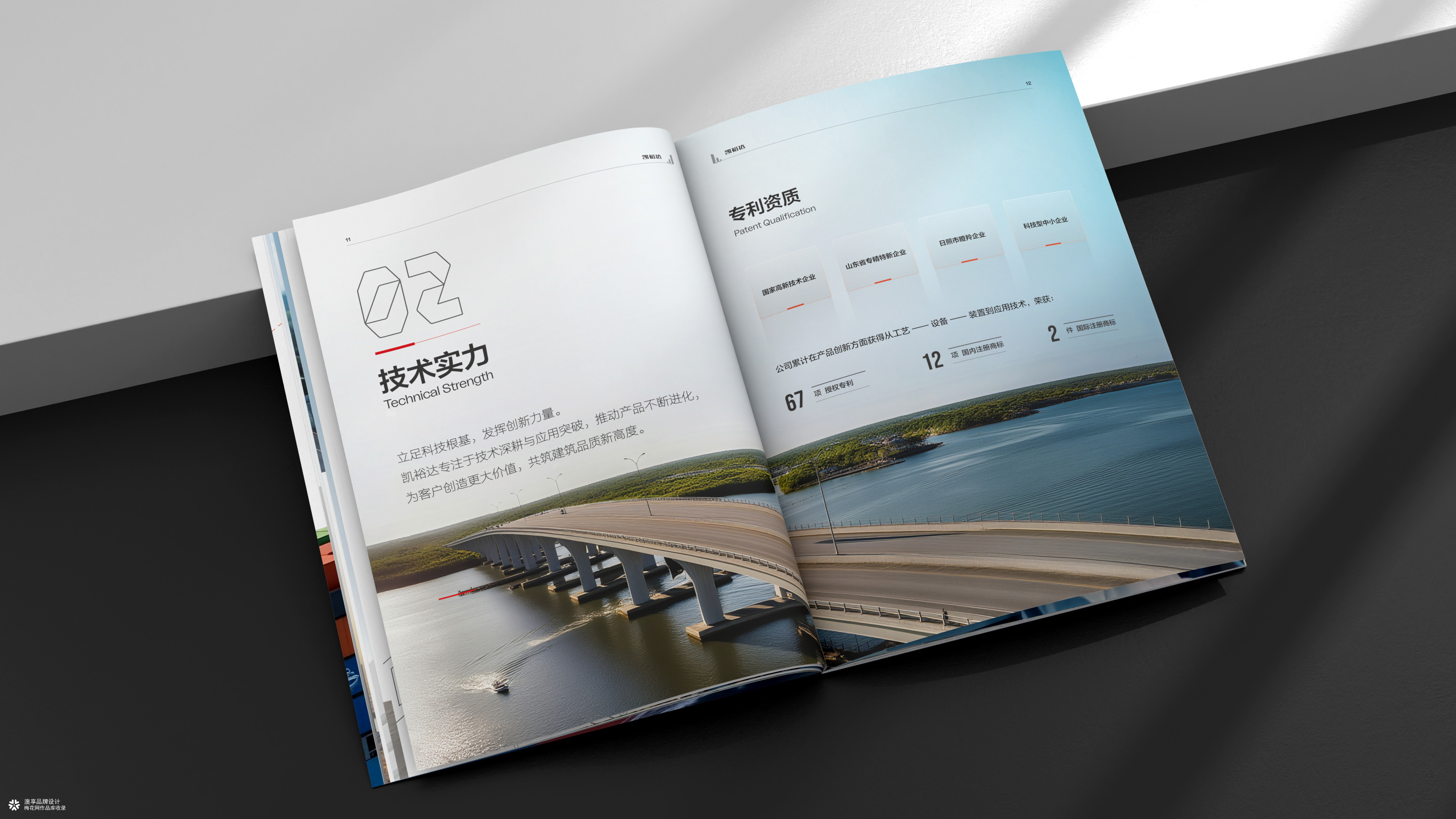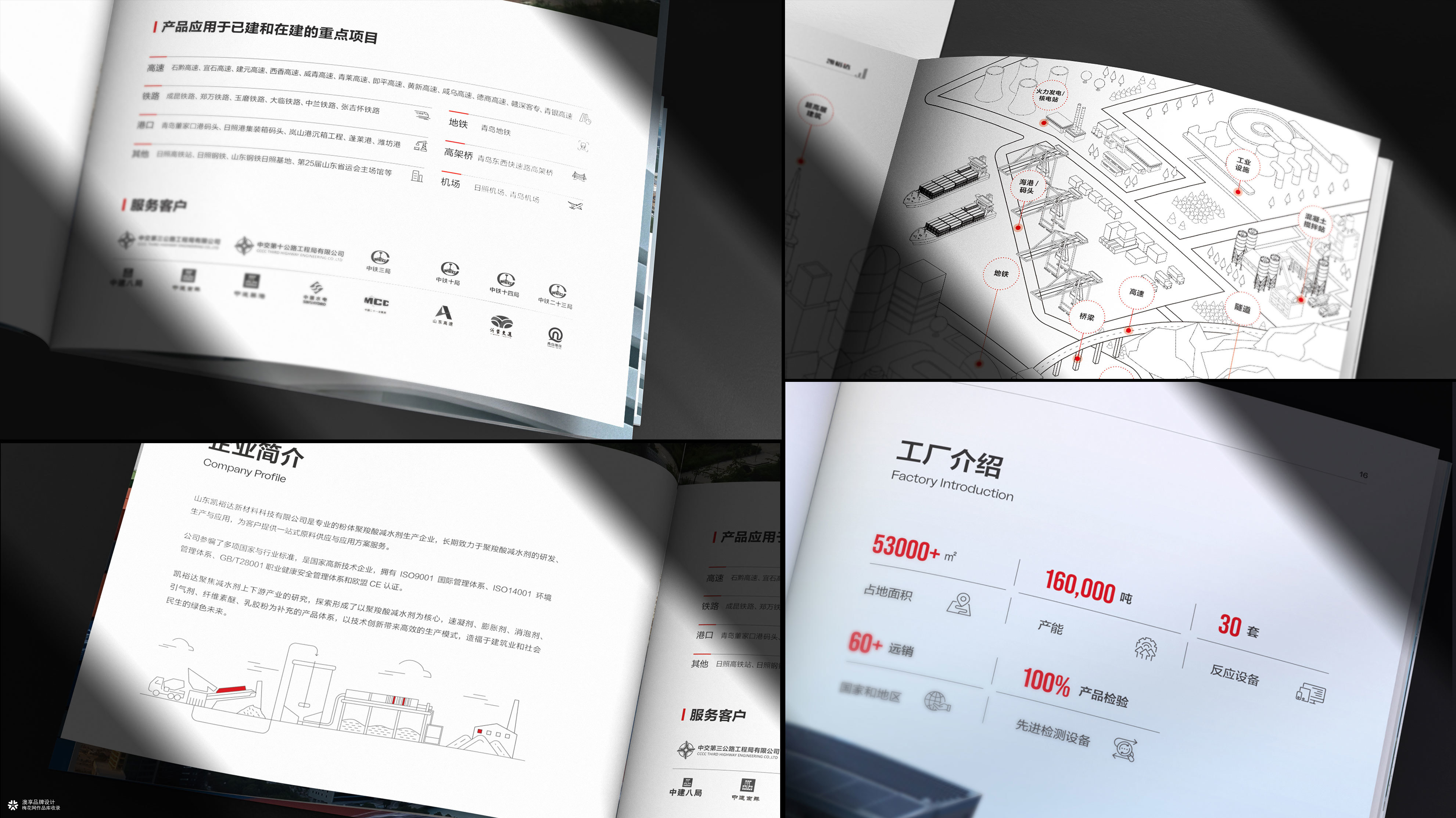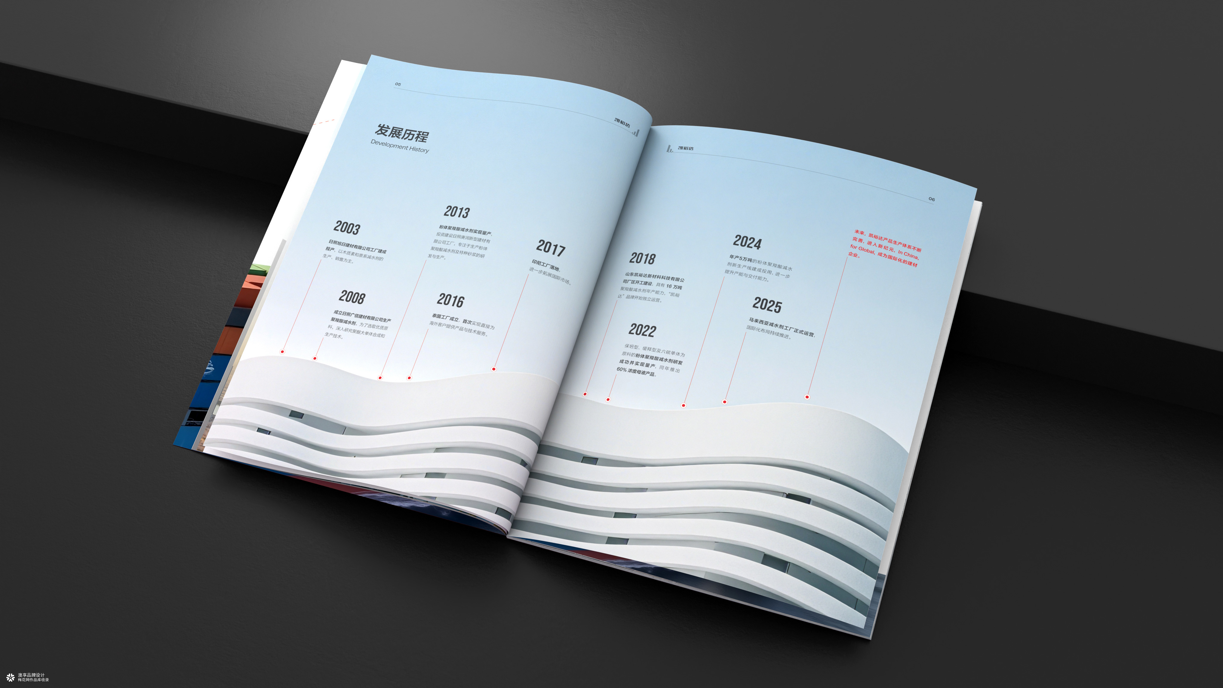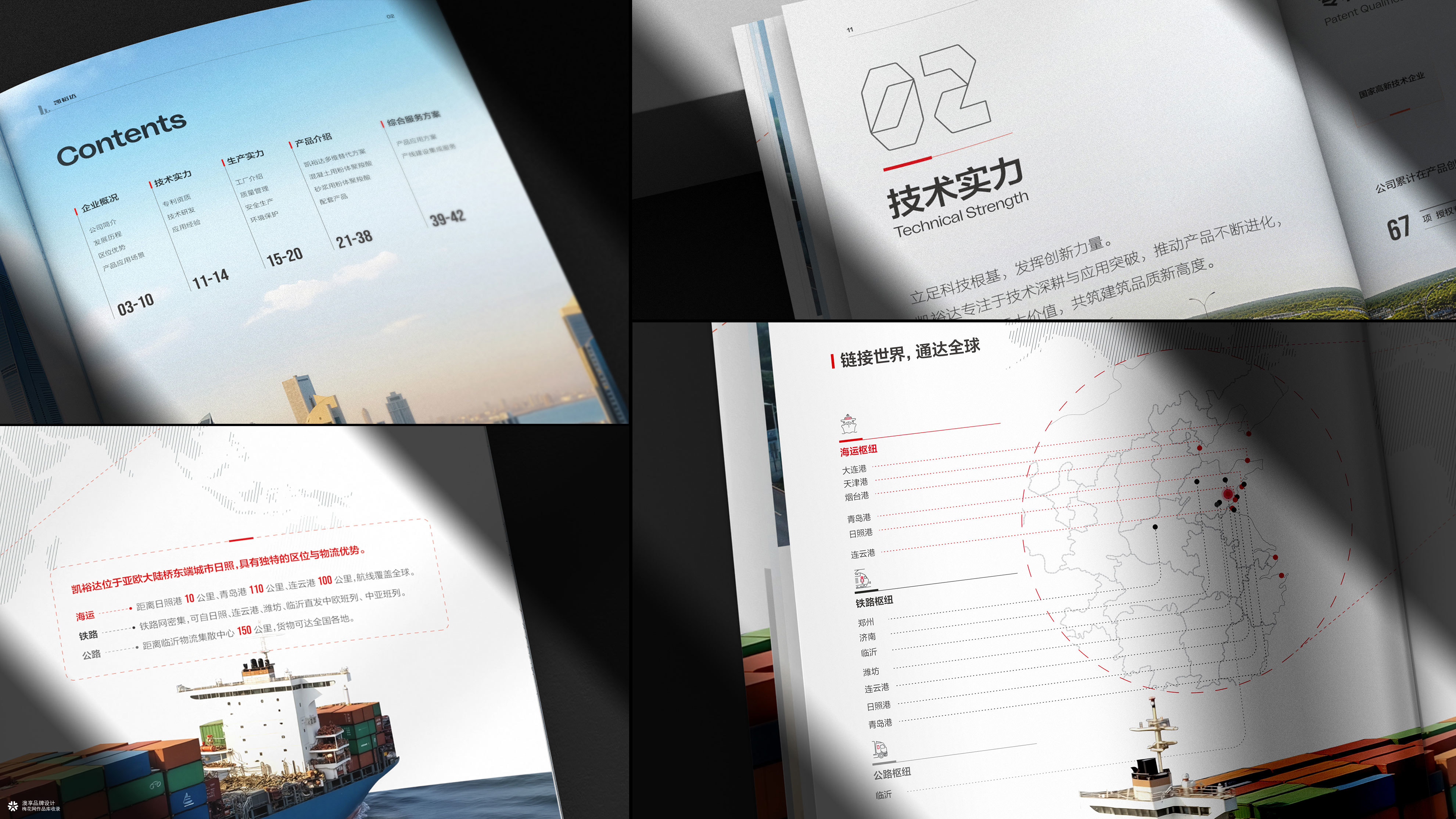 一、封面采用简洁的几何切面造型,通过利落的线条,展现出产品所属领域的严谨性与技术属性,同时搭配浅灰色与白色的基底,更具现代感与视觉层次,传递出企业在相关领域追求精准、高效的理念。 二、内页采用跨页的城市建筑景观图,展现出大气、开阔的视觉效果,文字排版简洁明了,便于读者快速获取企业相关介绍信息,体现出画册内容的条理性。以时间轴形式搭配红色节点标识梳理发展历程,增强视觉引导; 三、可视化+场景化: 1、地图 + 实景图将区位地图 + 实景图将区位,使物流优势具象化,分栏资质专利以 “数据 + 解读” 构建信任,降低技术信息传播门槛,适配多元受众。 2、以黑白灰线稿城市图结合红色标注,直观呈现多领域应用场景;通过圆形图示展示安全生产环节,以实验室实景图凸显质量管控的重视与投入,全方位传递企业与产品的专业形象、优势及理念。