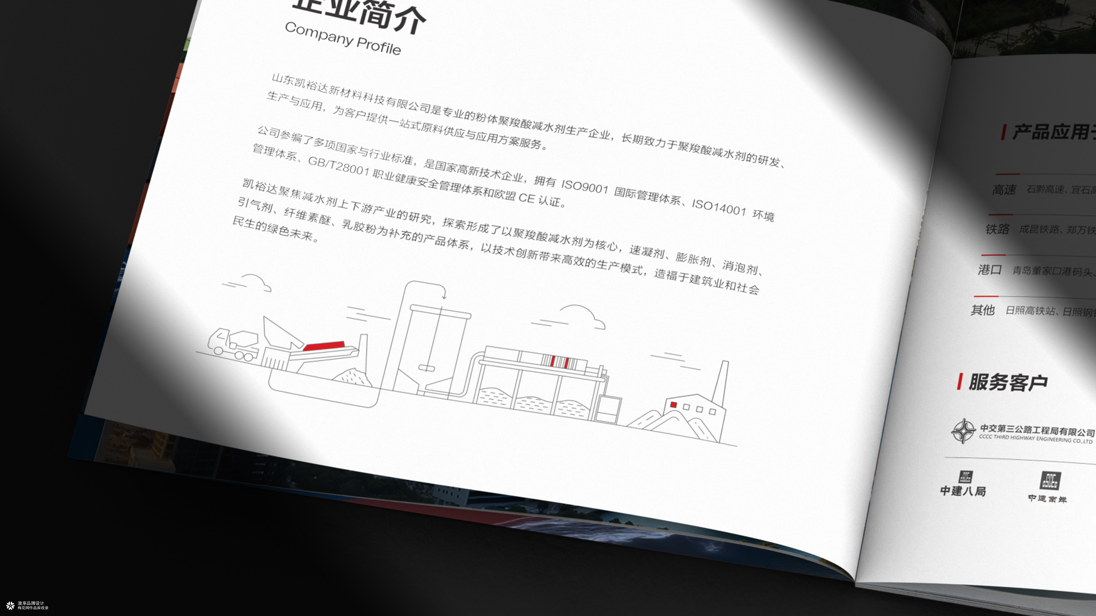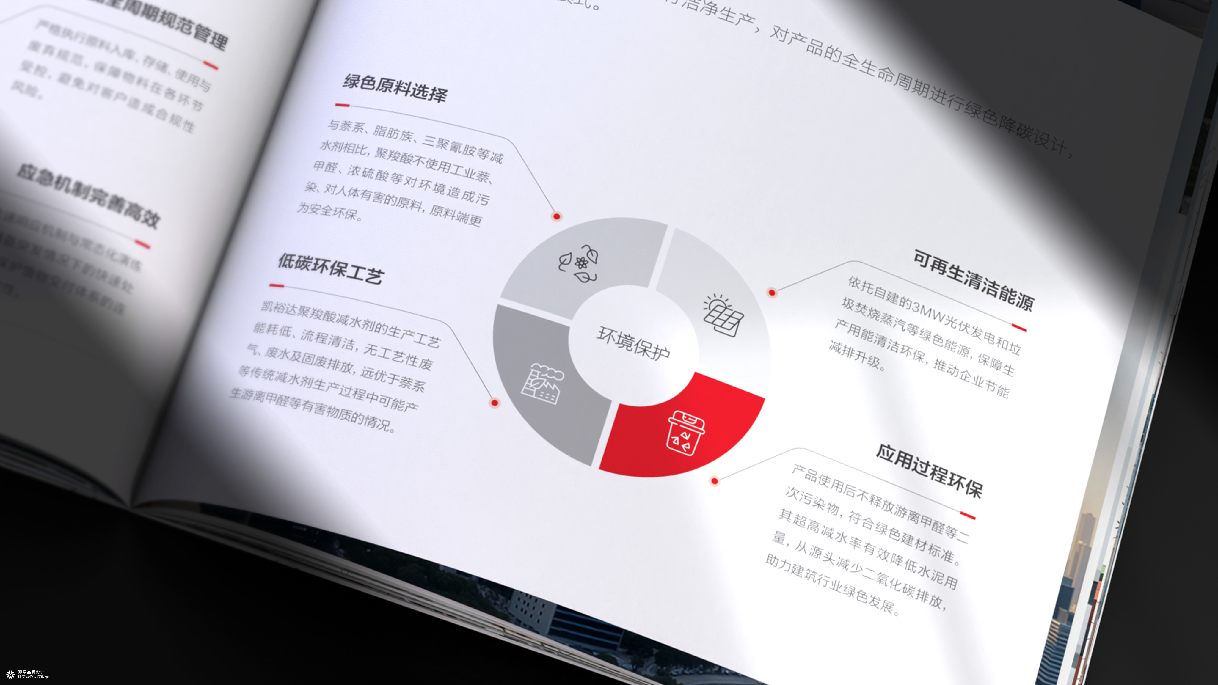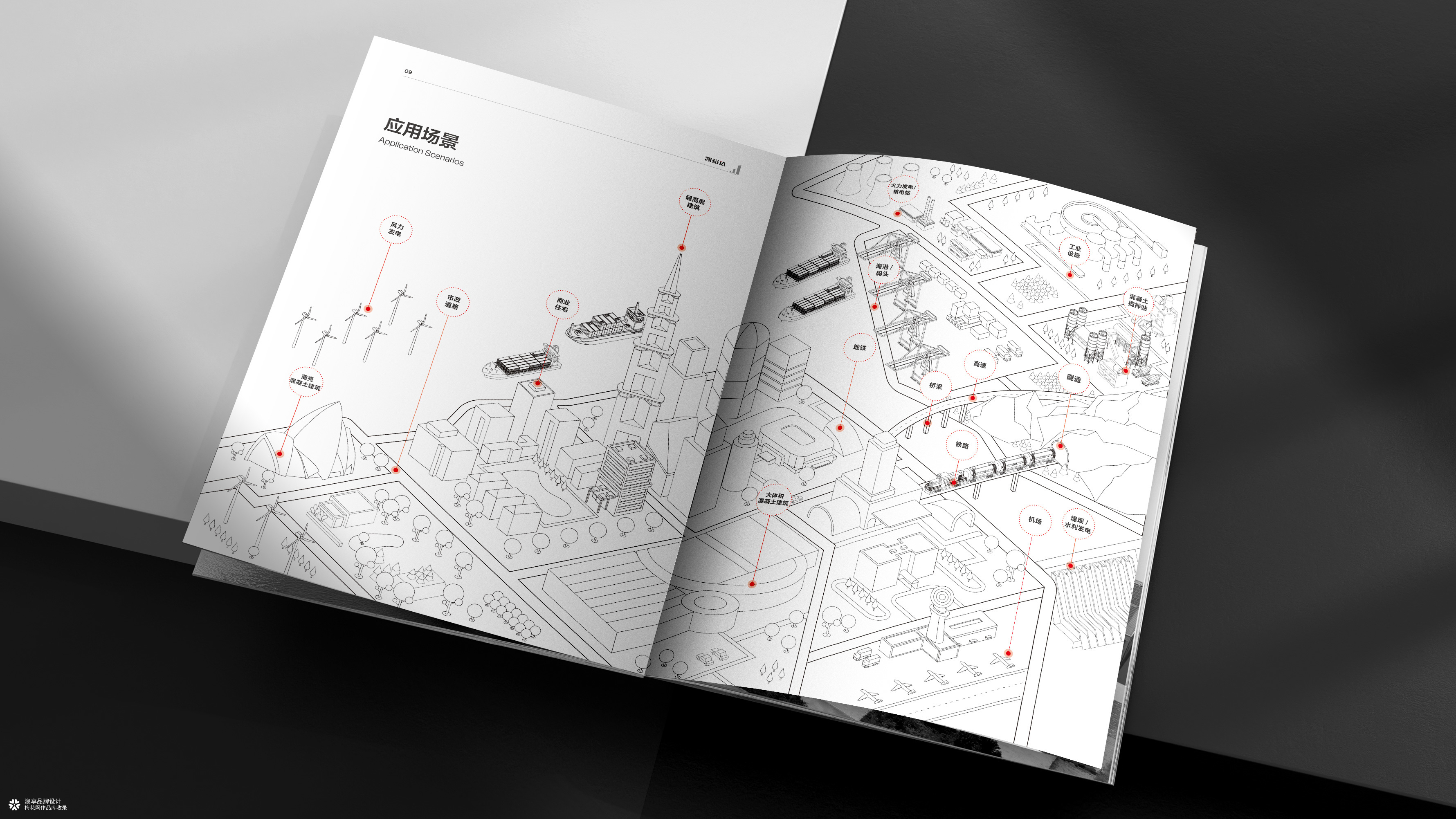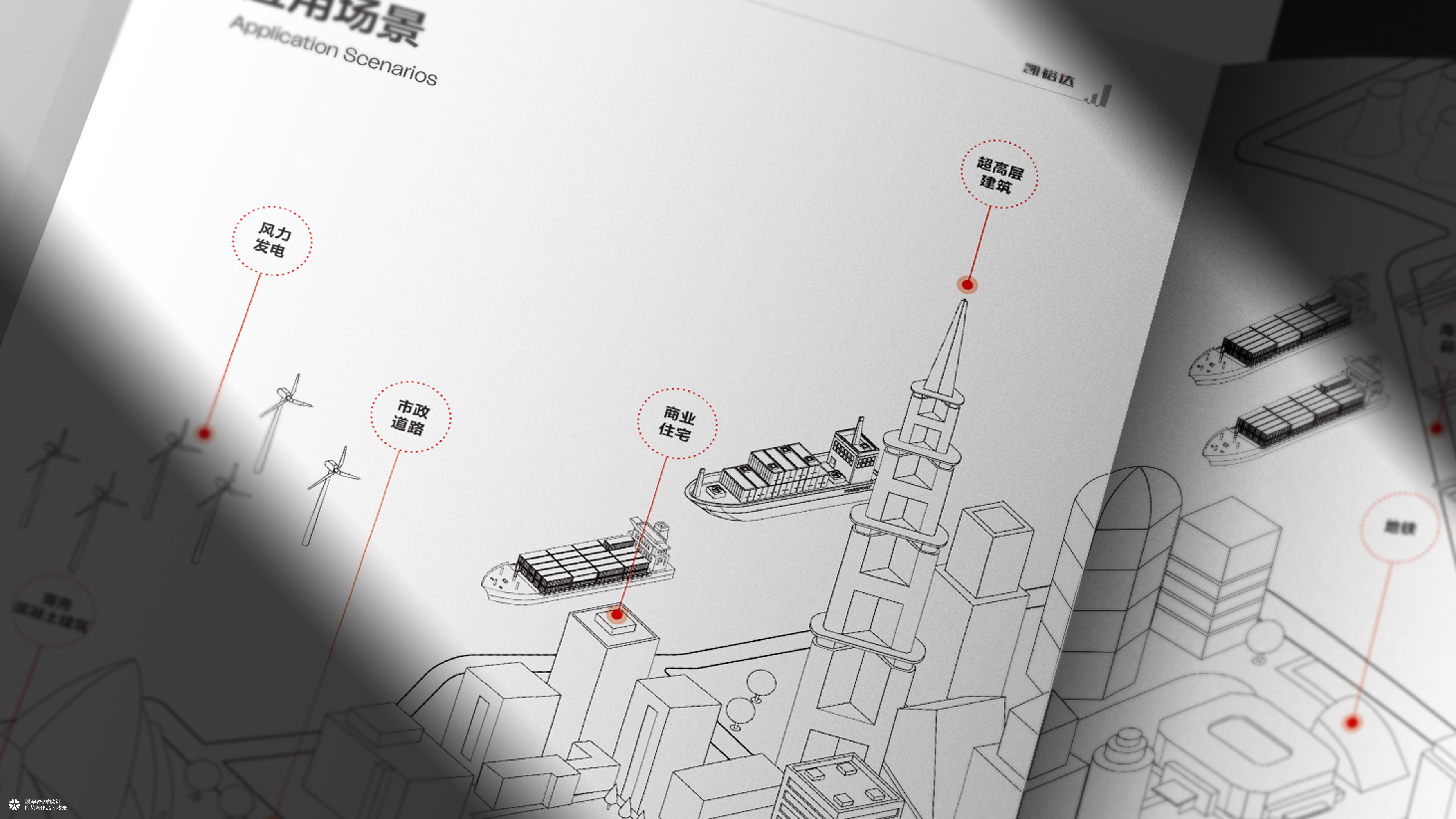 一、封面采用简洁的几何切面造型,通过利落的线条,展现出产品所属领域的严谨性与技术属性,同时搭配浅灰色与白色的基底,更具现代感与视觉层次,传递出企业在相关领域追求精准、高效的理念。 二、内页采用跨页的城市建筑景观图,展现出大气、开阔的视觉效果,文字排版简洁明了,便于读者快速获取企业相关介绍信息,体现出画册内容的条理性。以时间轴形式搭配红色节点标识梳理发展历程,增强视觉引导; 三、可视化+场景化: 1、地图 + 实景图将区位地图 + 实景图将区位,使物流优势具象化,分栏资质专利以 “数据 + 解读” 构建信任,降低技术信息传播门槛,适配多元受众。 2、以黑白灰线稿城市图结合红色标注,直观呈现多领域应用场景;通过圆形图示展示安全生产环节,以实验室实景图凸显质量管控的重视与投入,全方位传递企业与产品的专业形象、优势及理念。
