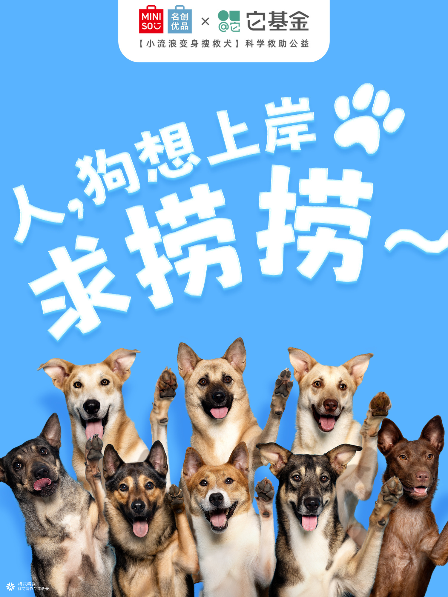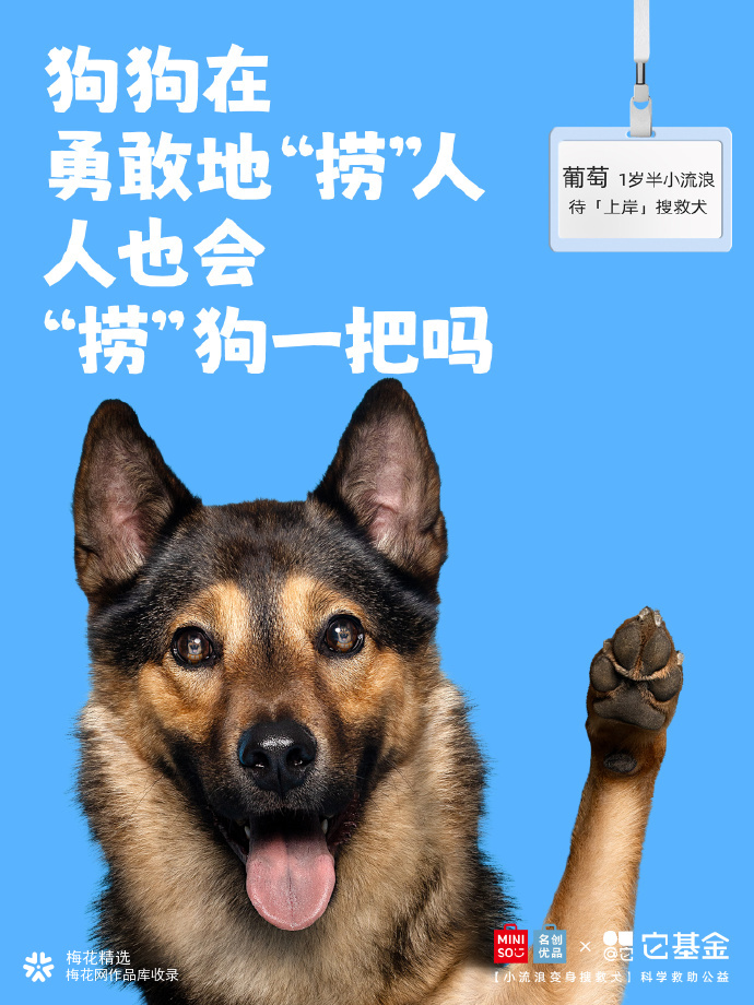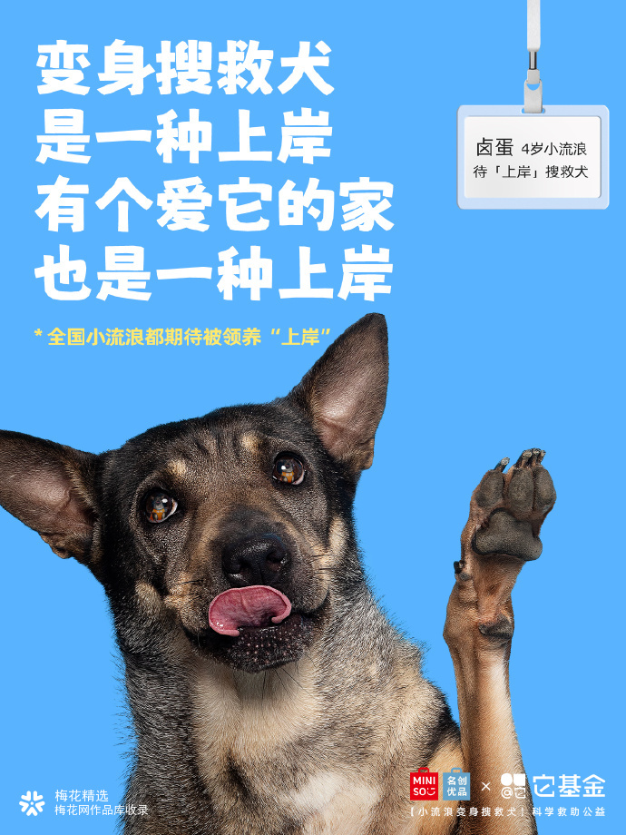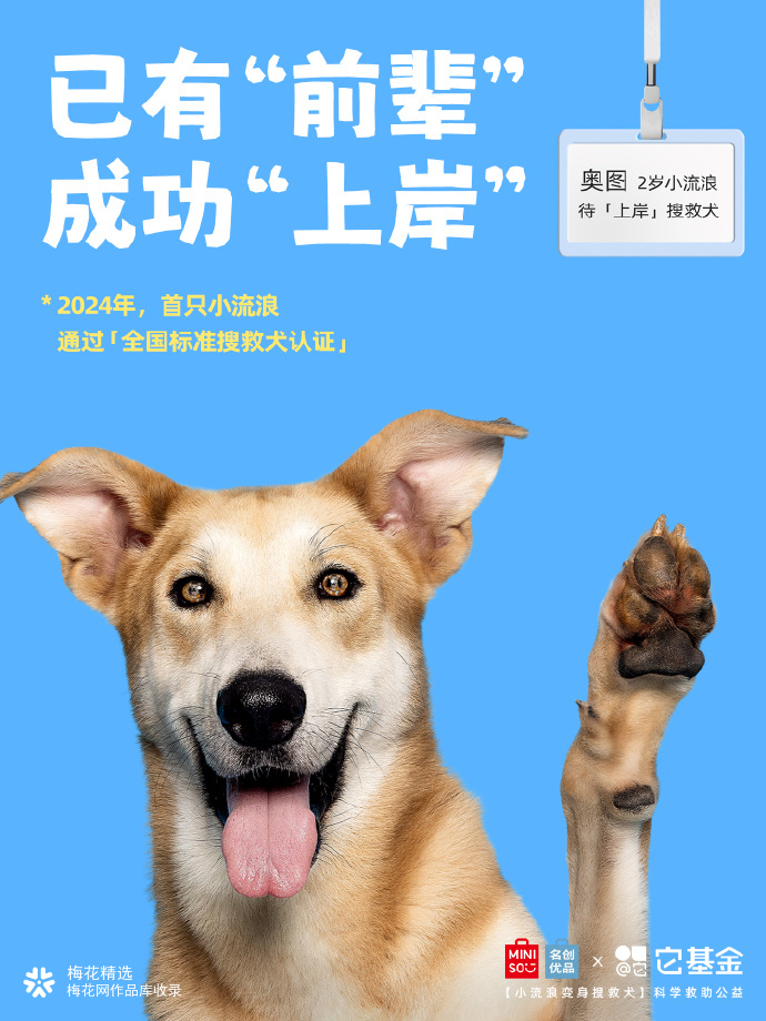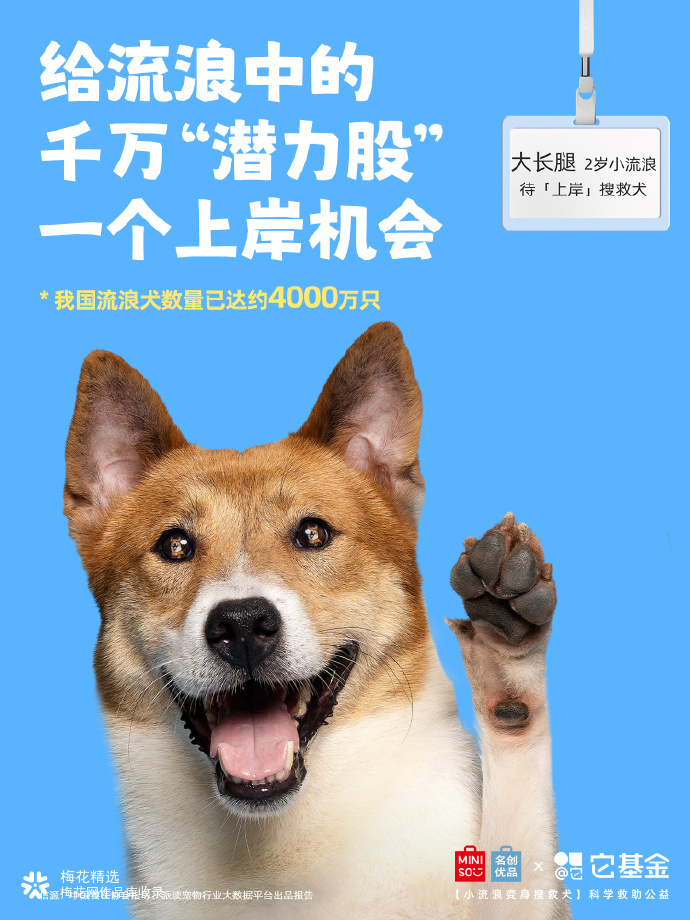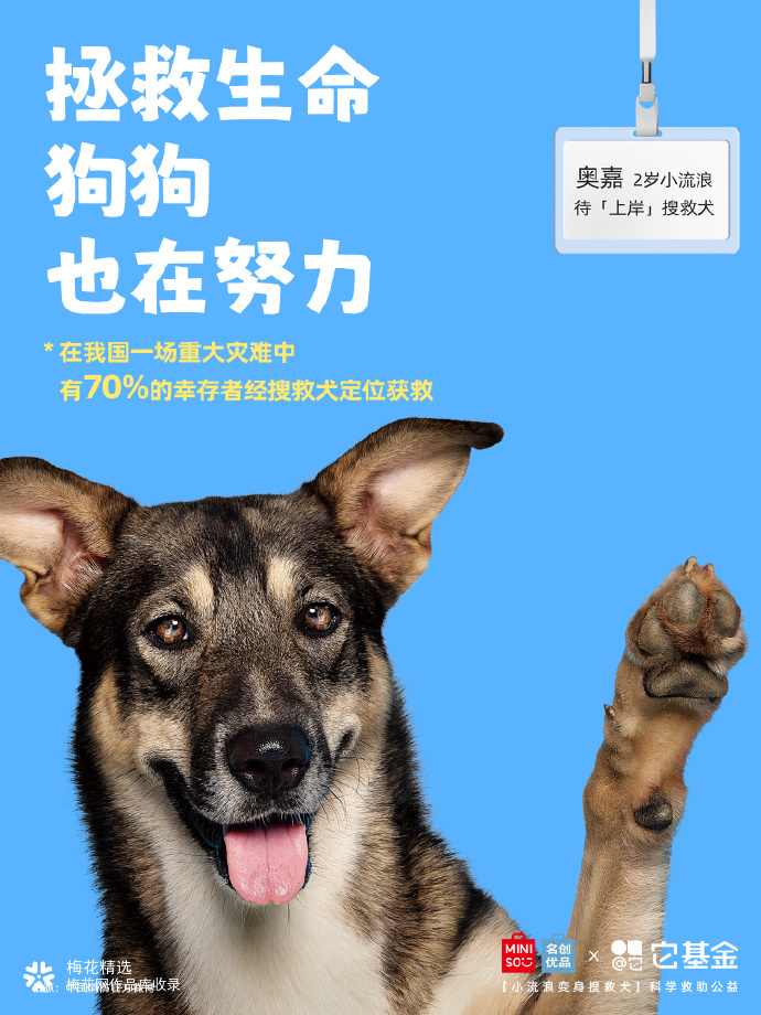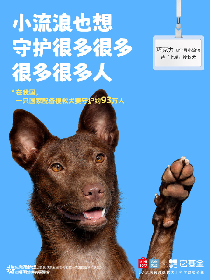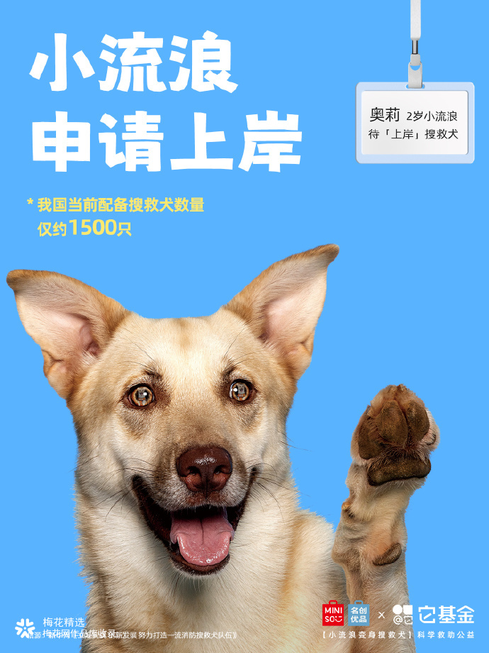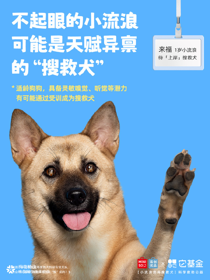 在我国,全国配备搜救犬仅约1500只。而流浪犬数量超4000万只,其中,许多狗狗具备成为搜救犬的潜力! 为此,名创优品联合它基金发起「小流浪变身搜救犬」科学救助公益项目,希望通过选拔培养,给小流浪们提供更多上岸的可能。